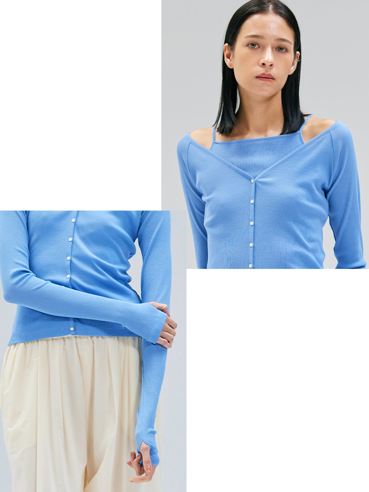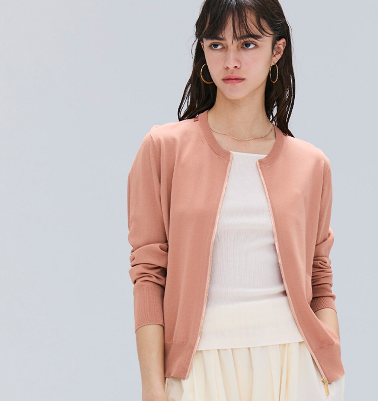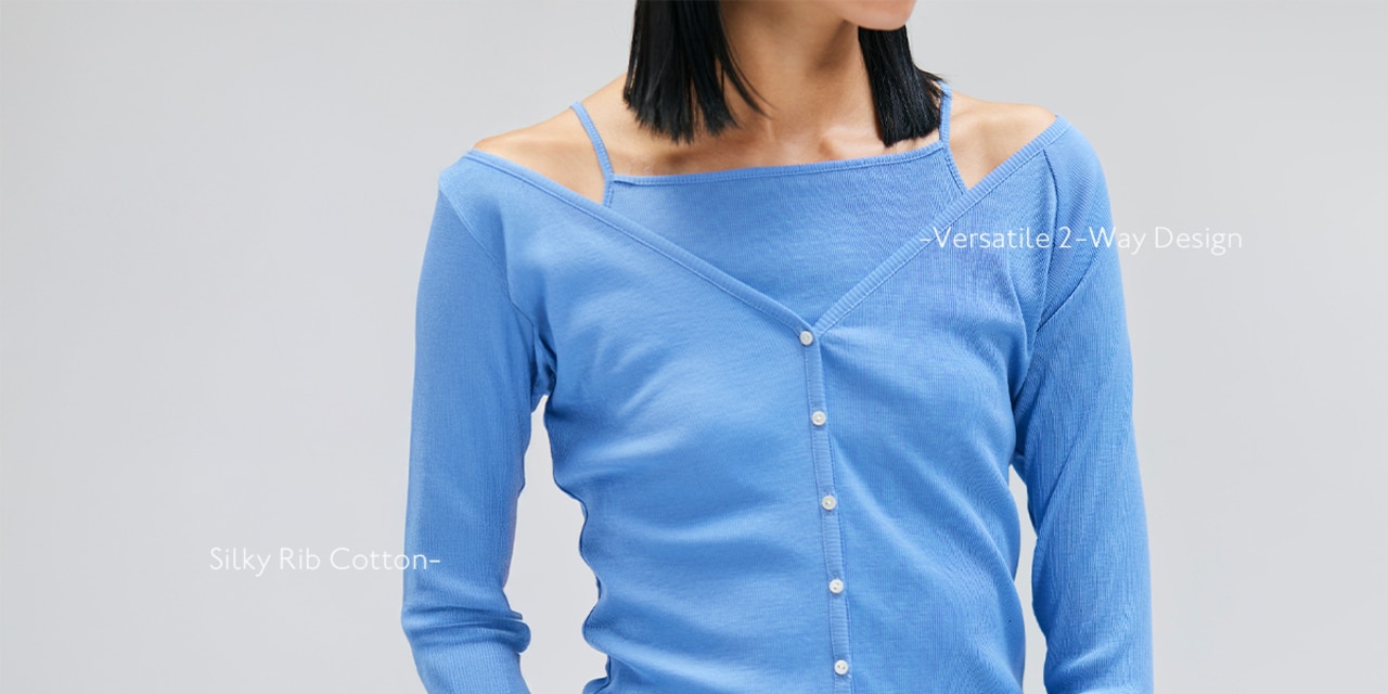 カーディガンとキャミソールのこなれ感と上質リブ素材で、夏のワードローブを格上げ。