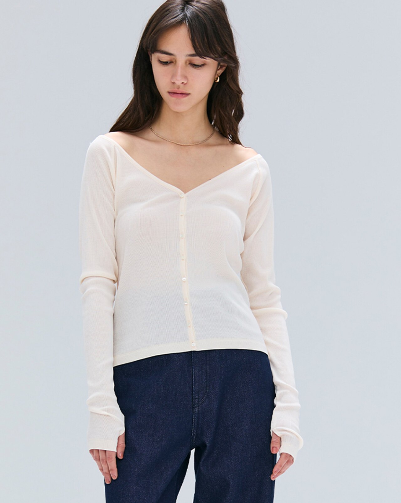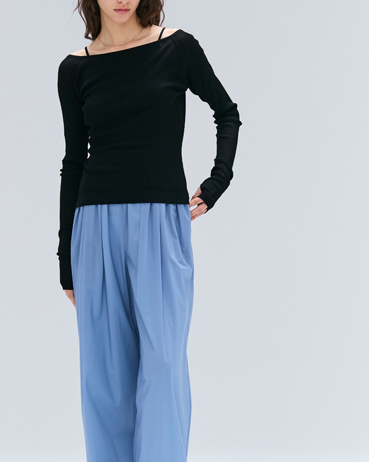 シルケット加工を施した上質なコットンリブ素材を使用。まるでシルクのような美しいツヤと驚くほど滑らかな肌触りで、これからの季節に最適。デコルテを美しく見せるネックとラインを拾いすぎない絶妙なシルエット、袖口にさりげなく施されたフィンガーホールが遊び心をプラスし、前後2WAYで着こなしの幅が広がるデザイン。