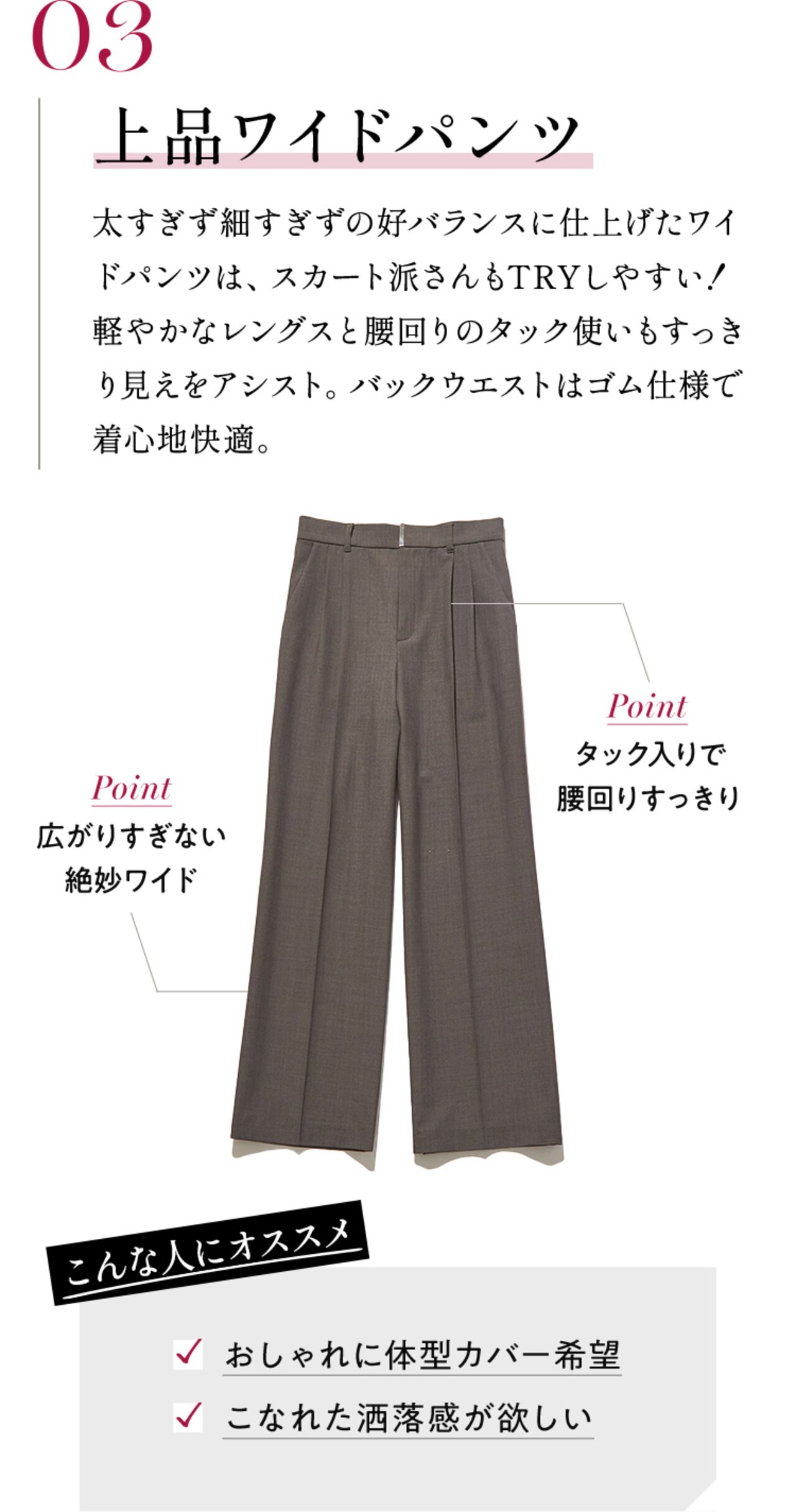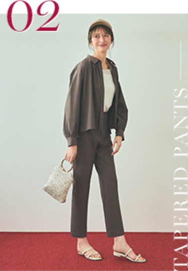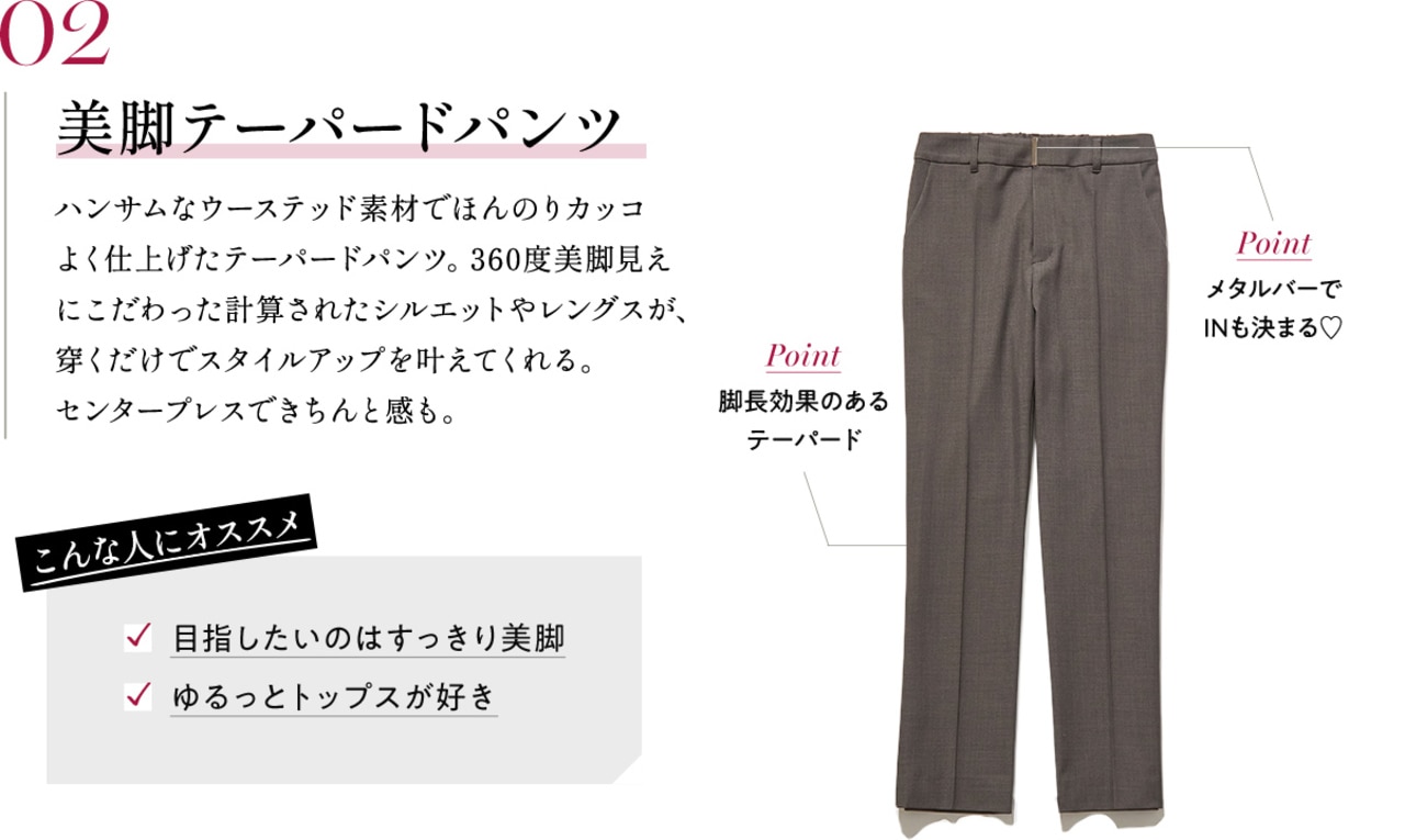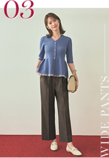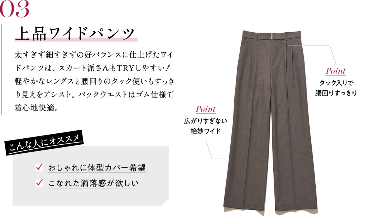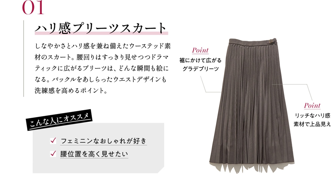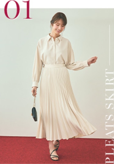 上品に映えるプリーツスカートとシルエット違いで楽しめる2種類のパンツ。