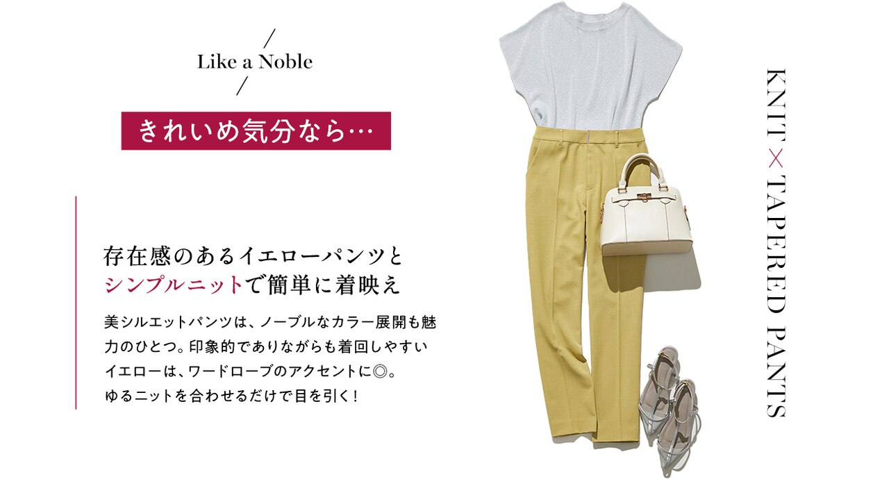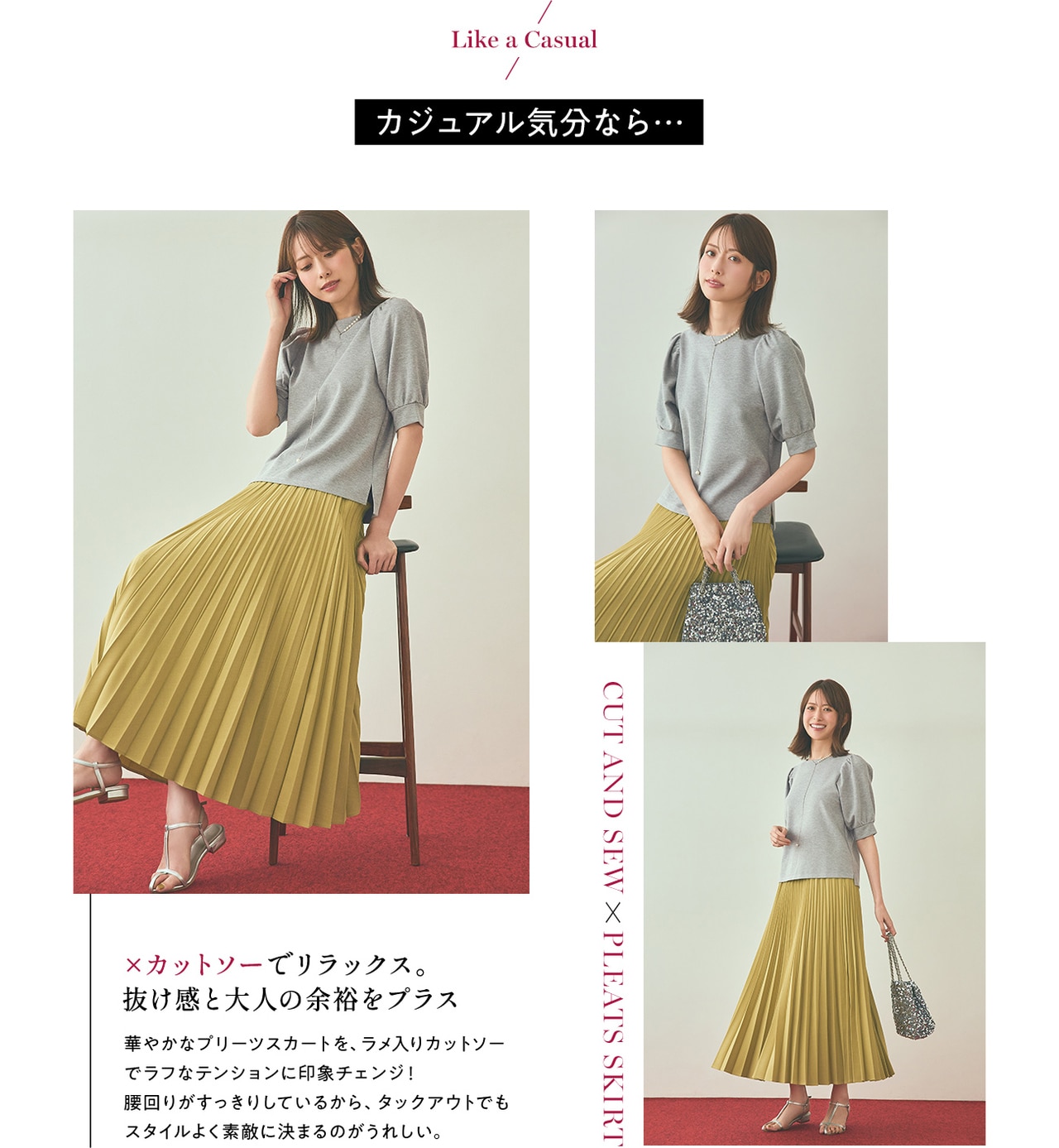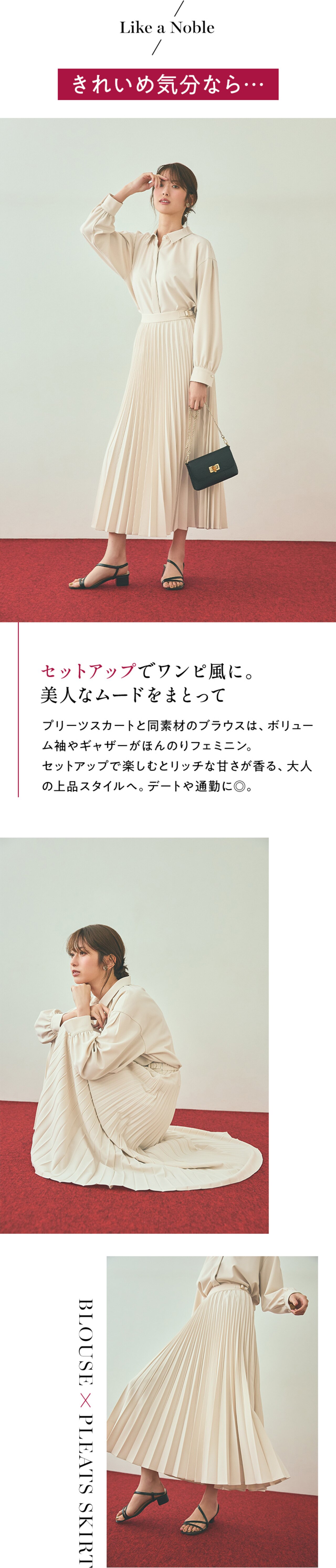 上品に映えるプリーツスカートとシルエット違いで楽しめる2種類のパンツ。