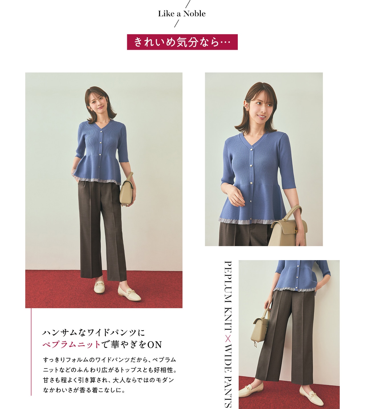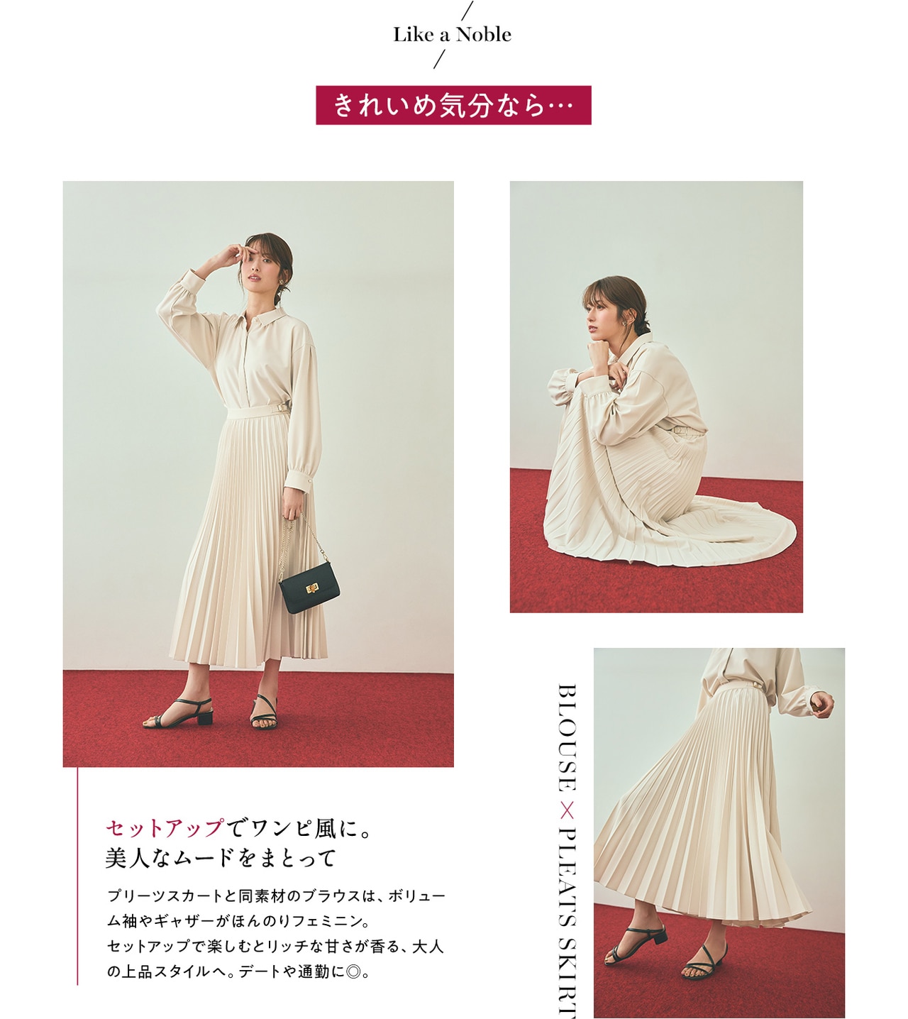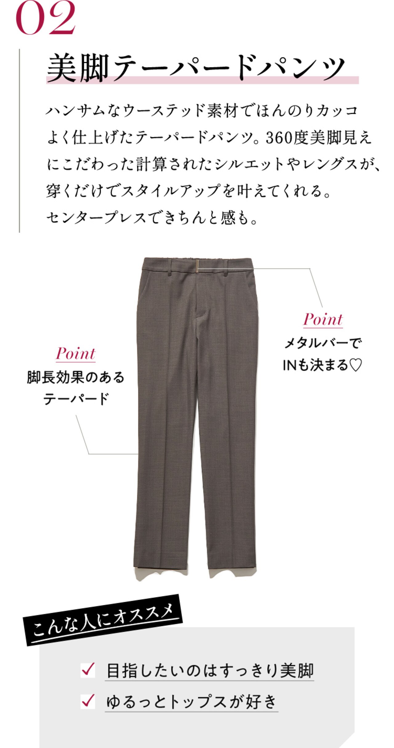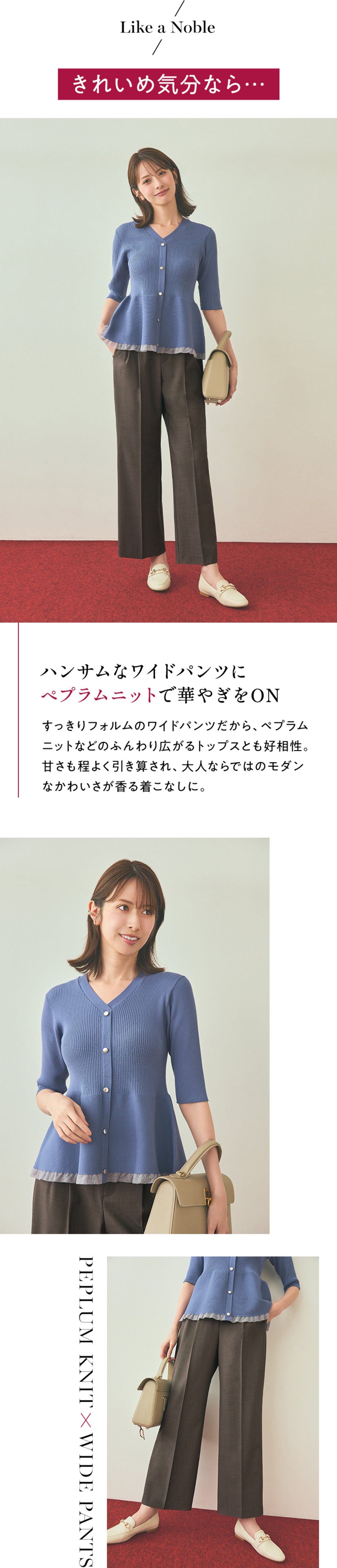 上品に映えるプリーツスカートとシルエット違いで楽しめる2種類のパンツ。