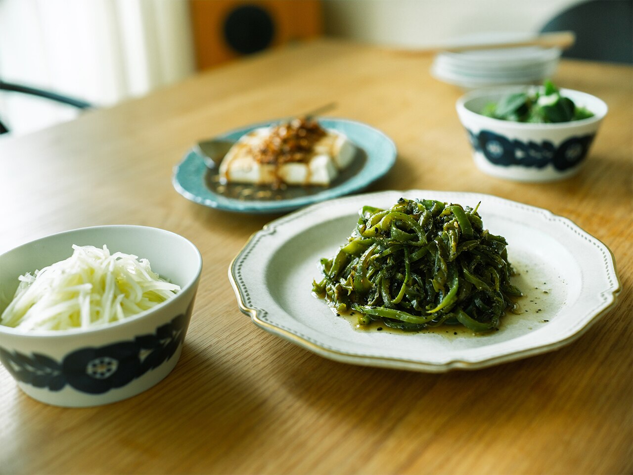 好んで選ぶのは、白や青の器。素朴な骨董柄が多いそう。日々のごはんを、もっと気楽に、もっと楽しく。そんな願いをそっと支えてくれるのが、石岡さんの器たちです。