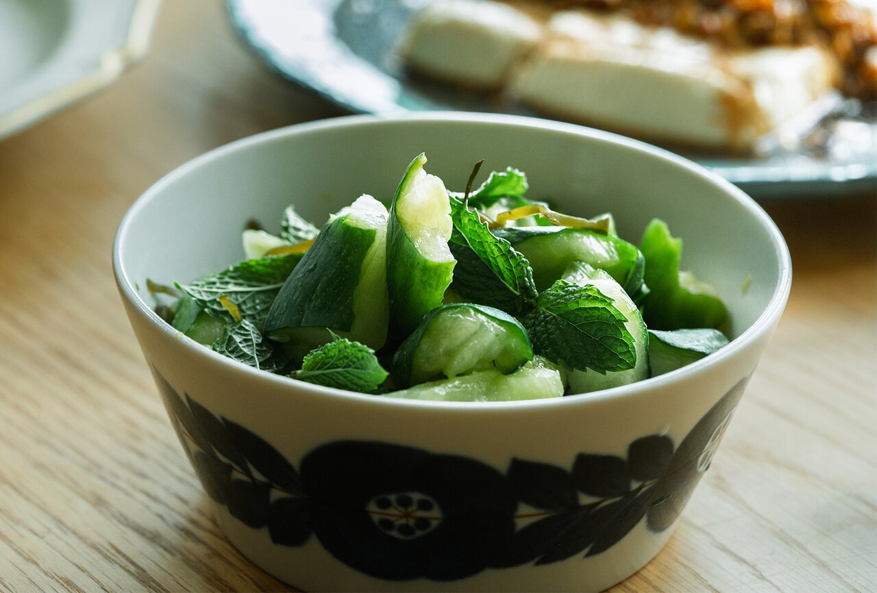 夏になると冷蔵庫に常備しておきたくなる、爽やかなたたききゅうり。庭で育てたミントを添えることで、香りに清涼感がプラスされ、口の中がすっきりリセットされる一品に。