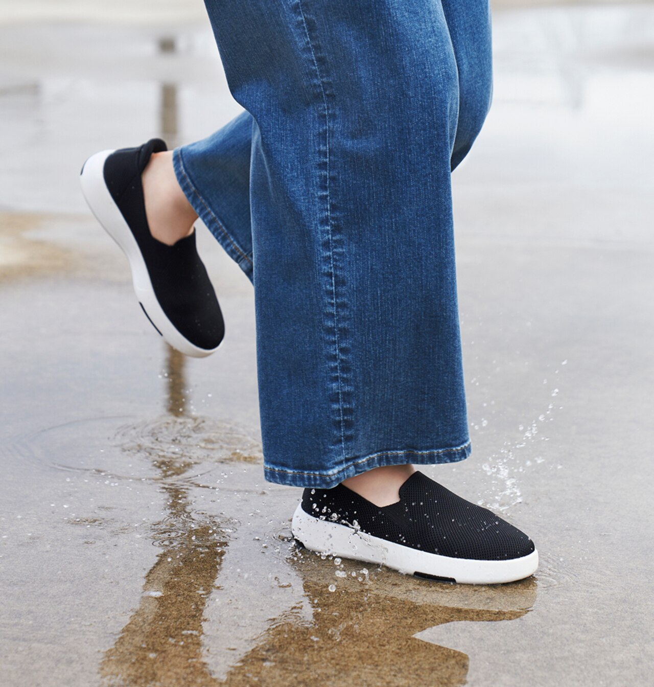 サッと履いて、パッと出かけよう。通気性も撥水もOK! 軽やかなニット素材が足にやさしくフィットし、毎日の移動も週末のおでかけも快適にサポートしてくれます。