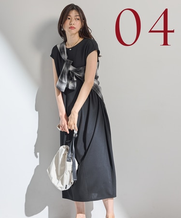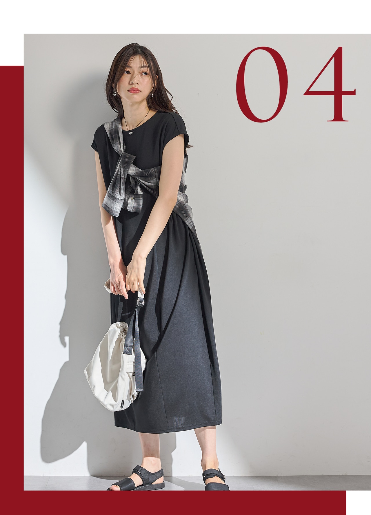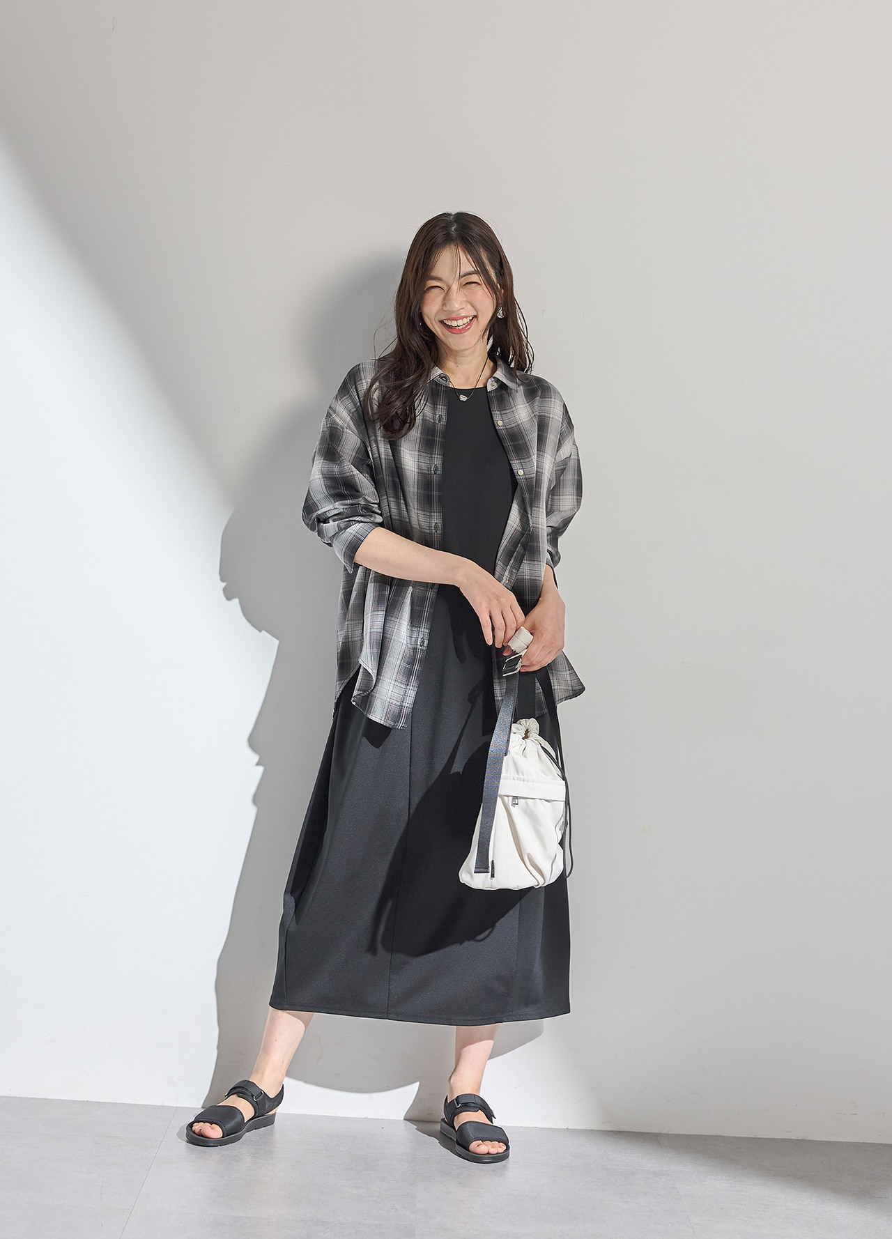 裾に向かって丸みを持たせた、上品なコクーンシルエットがポイント!ブラックのワンピに、同系色のオンブレチェックシャツを肩掛けしてこなれ感を演出。羽織としても使えるシャツで、気温や気分に合わせたアレンジも楽しめる!