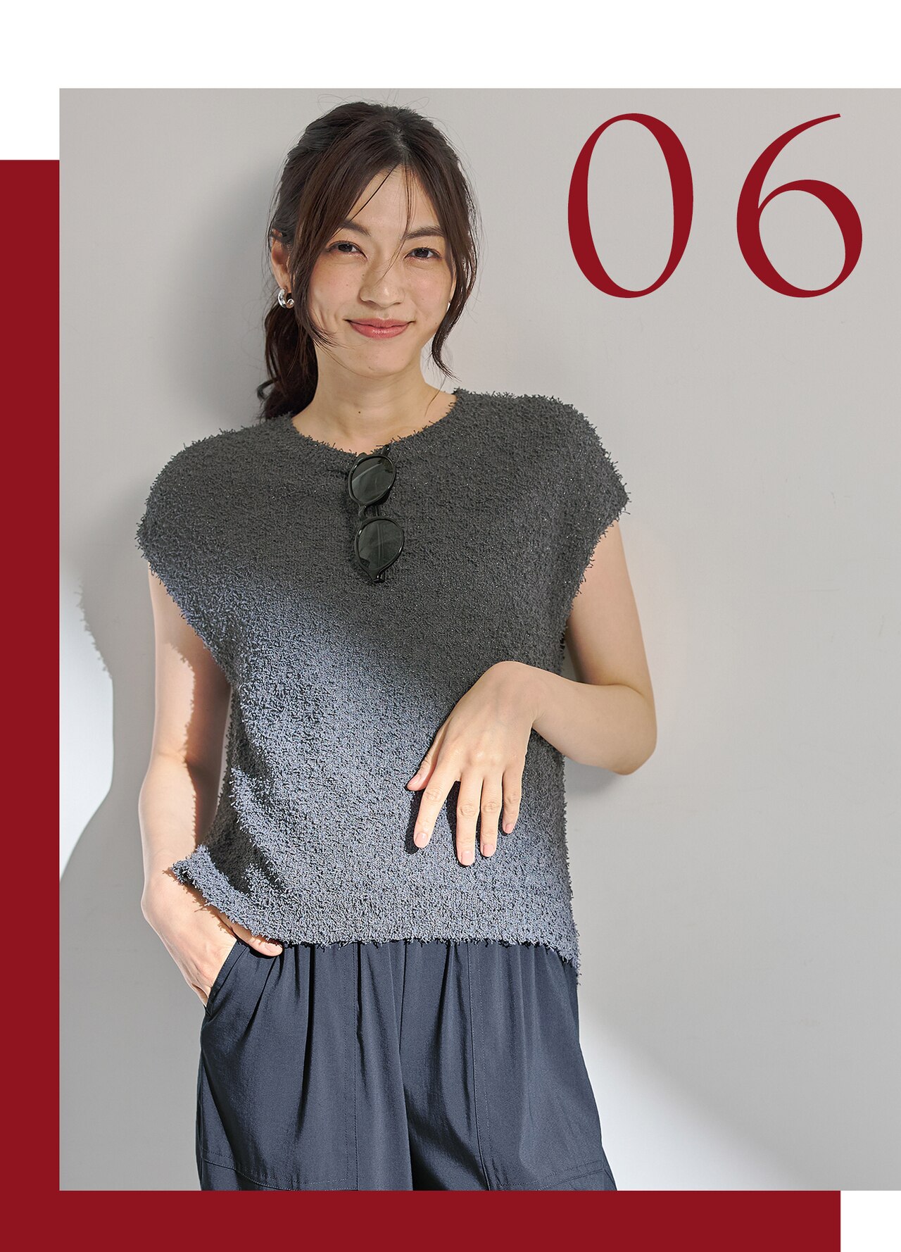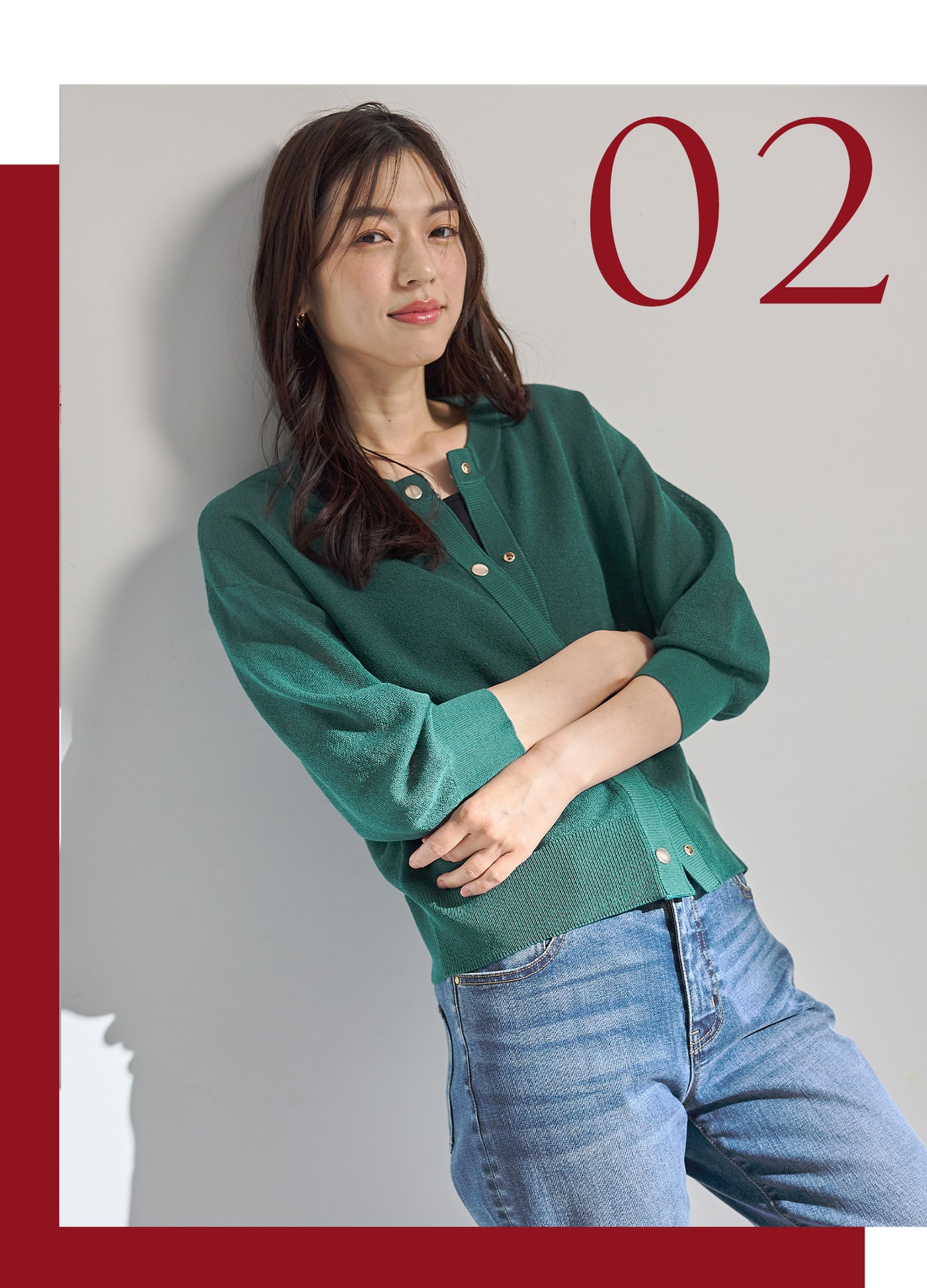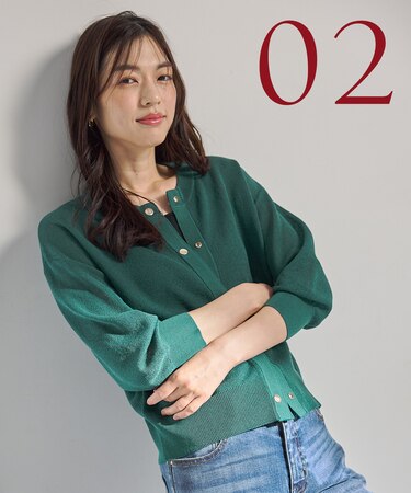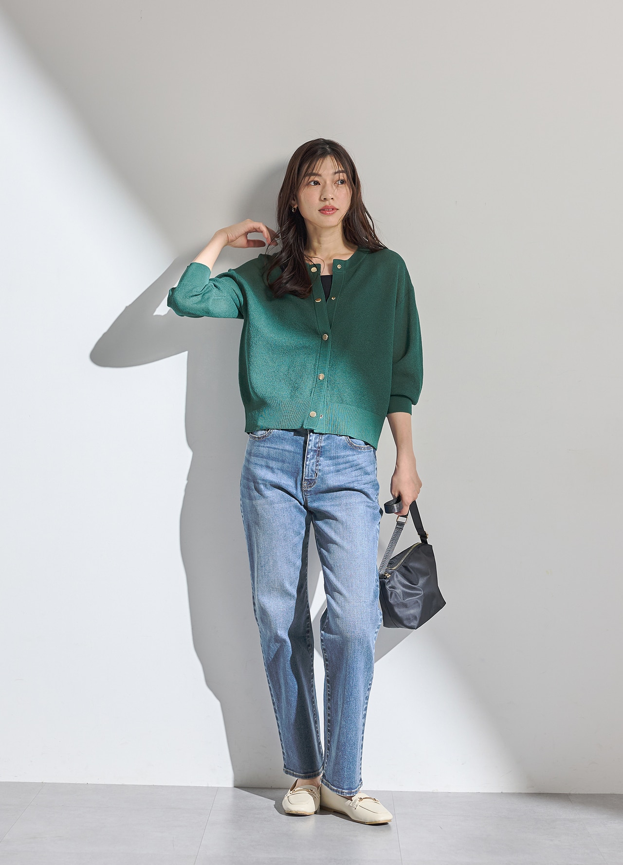 トレンド感のある今っぽシルエットとシアー素材で、涼し気な抜け感を演出!インナーにタンクトップを着て、プルオーバー風に着用するのもおすすめ。鮮やかなグリーンのカーディガンに、淡色デニムを合わせてクリーンなカジュアルスタイルの完成。