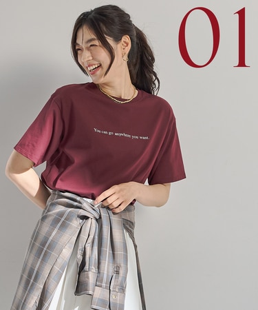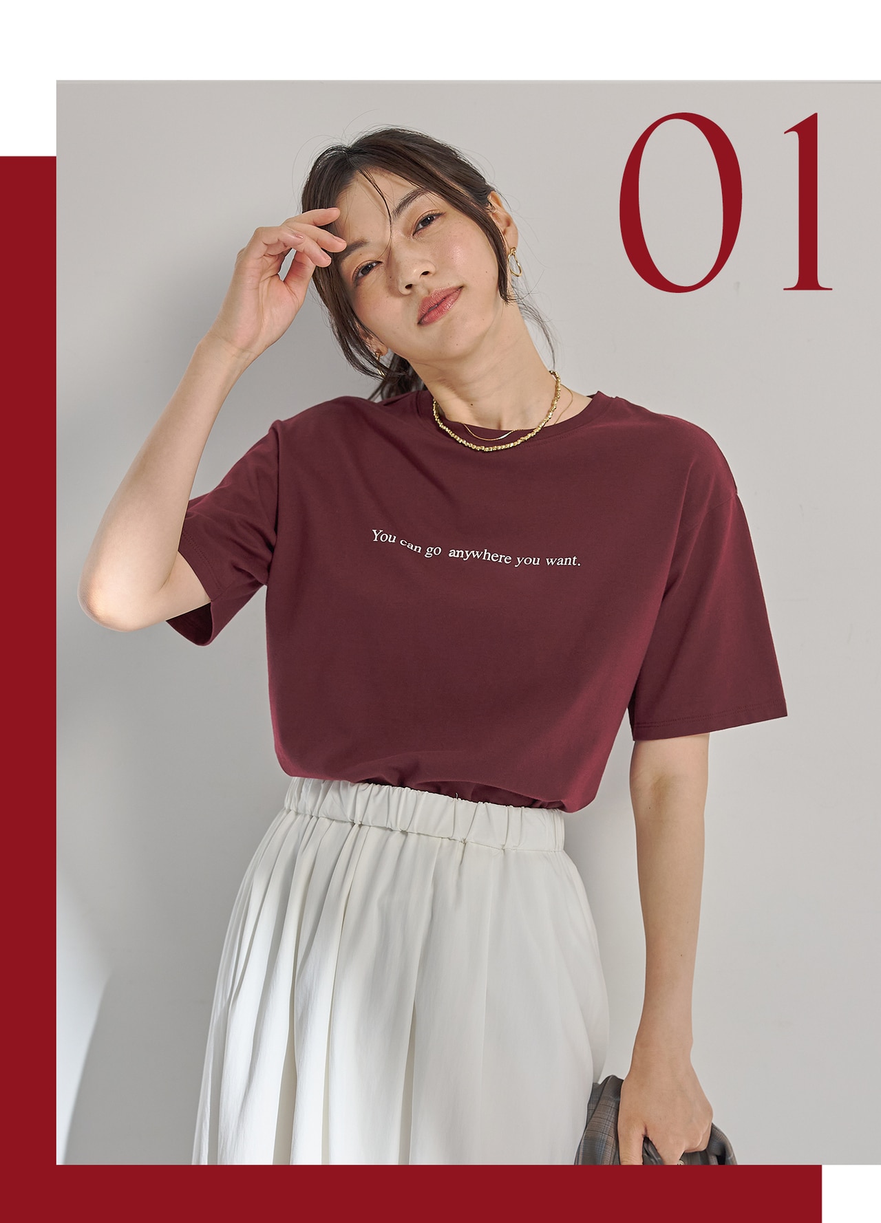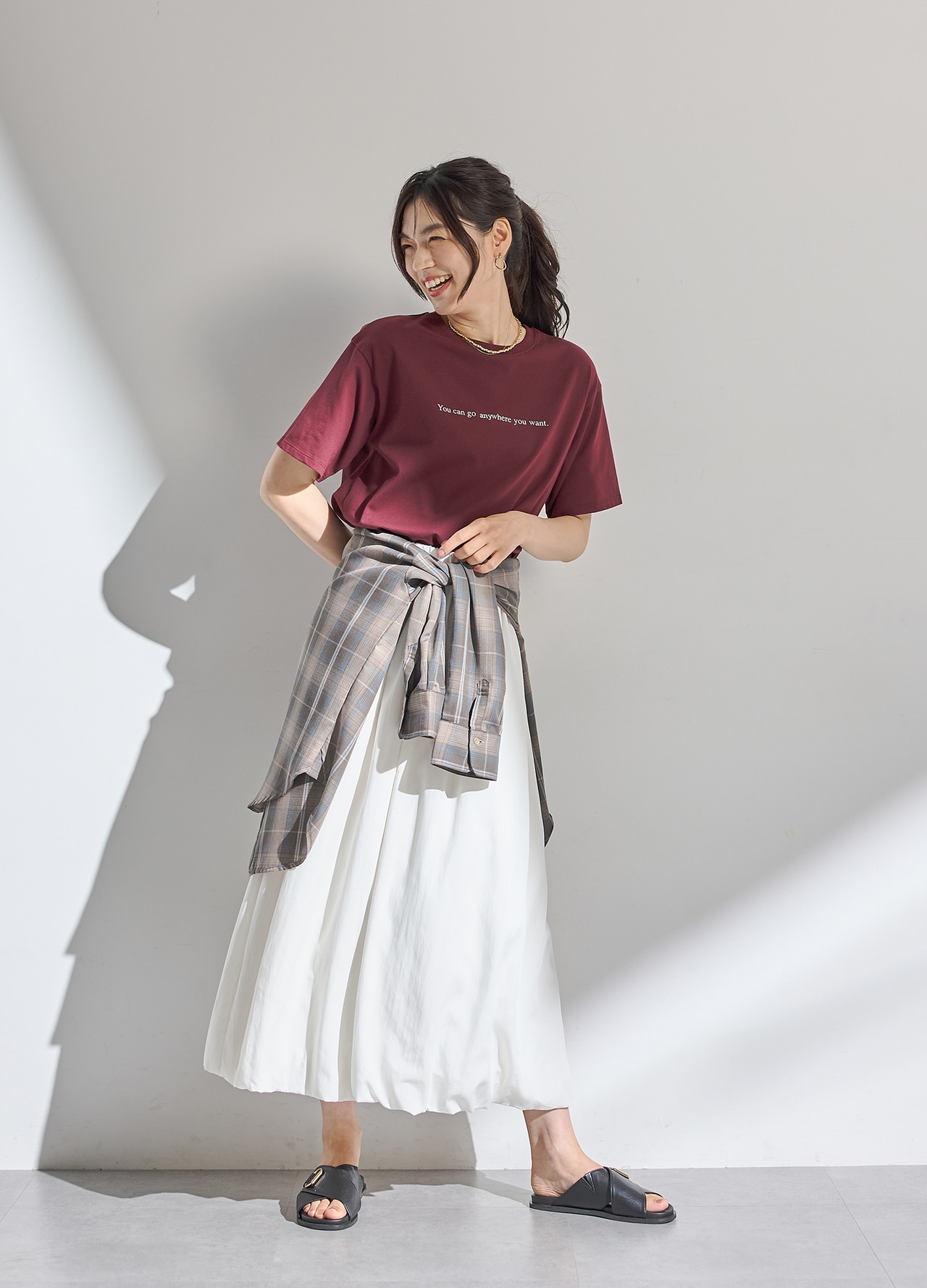 深みのあるバーガンディのロゴTに、軽やかな白のロングスカートを合わせた爽やかコーデ。腰にチェックシャツを巻いて、カジュアル感とこなれ感をプラス!
