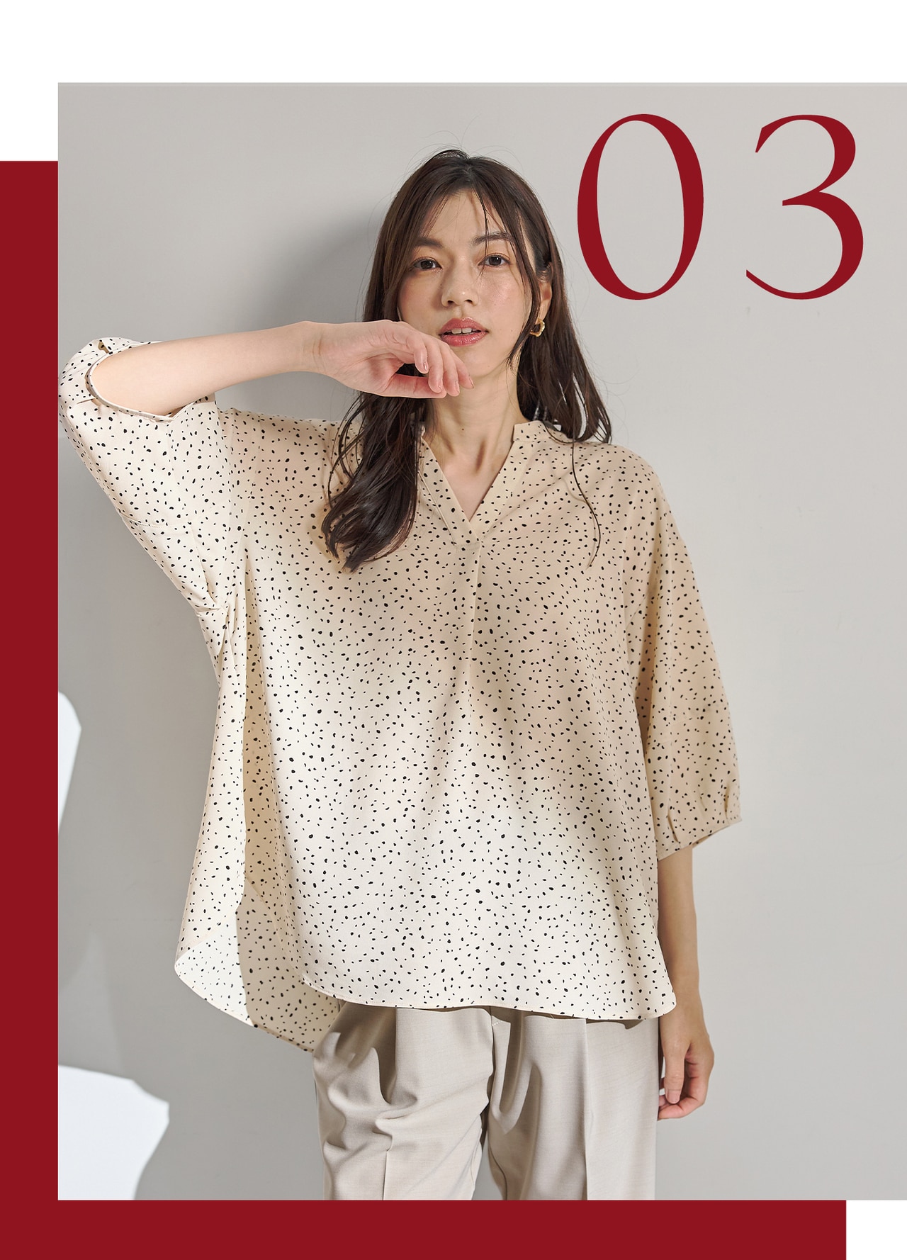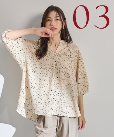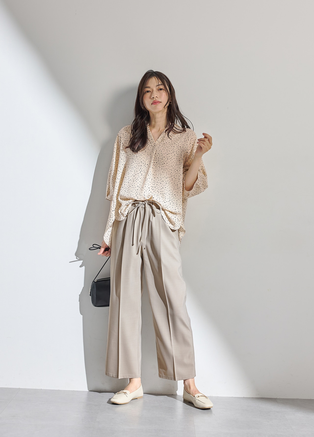 トレンド感のある肘丈ランタンスリーブで上品な華やかさを演出!柔らかなベージュのシャツとワイドパンツを合わせた、ワントーンのリラックスコーデ。軽やかな素材感で、抜け感のある大人の装いに仕上げています。