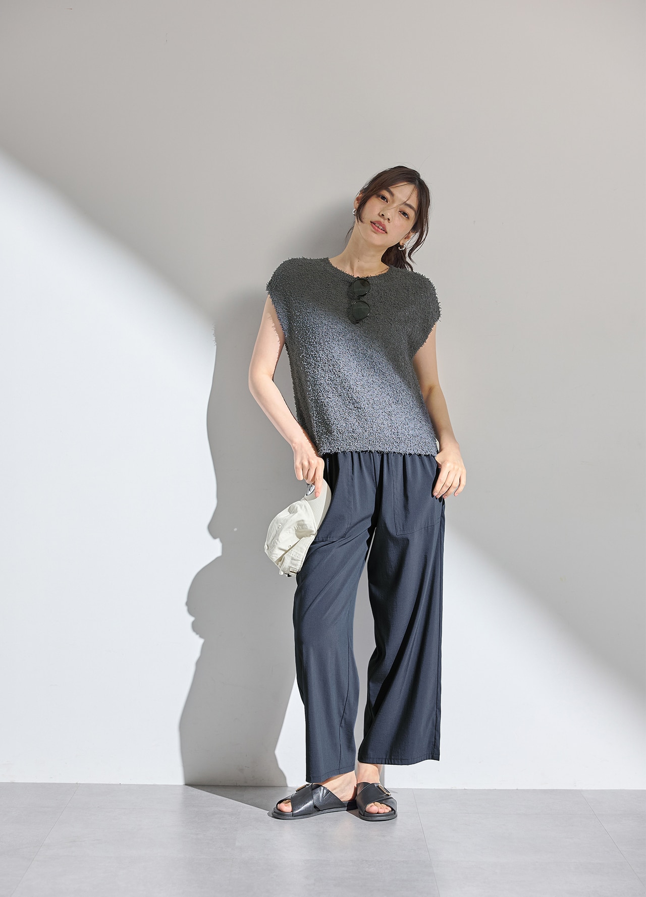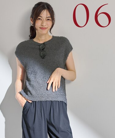1枚で主役になる、ラメ混ホーンヤーンの華やかニット!グレーのホーンヤーンラメニットに、同系色のワイドパンツを合わせたワントーンコーデ。ラメのさりげないきらめきが、シックな着こなしに華やかさを添えています。