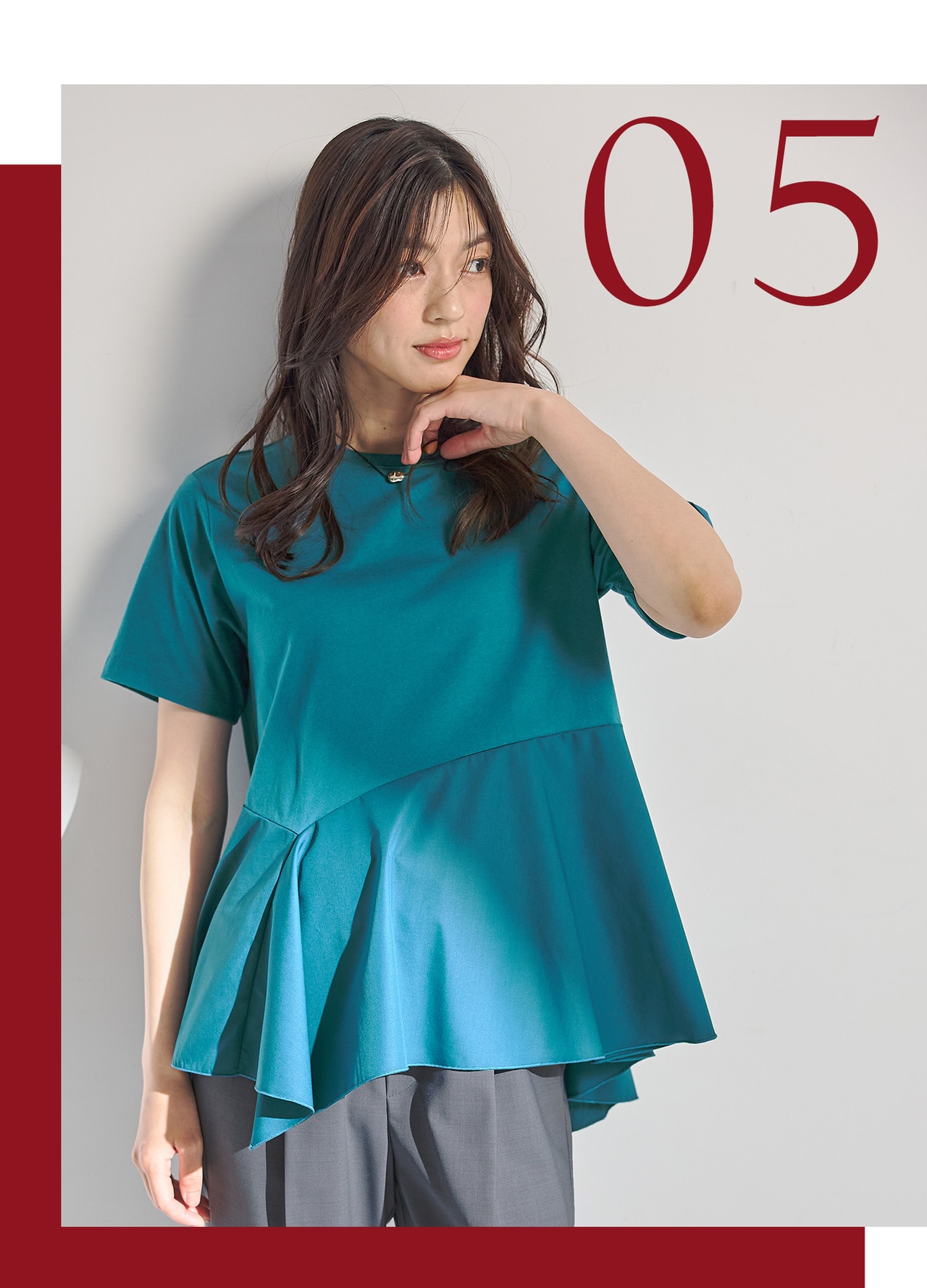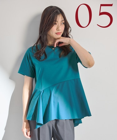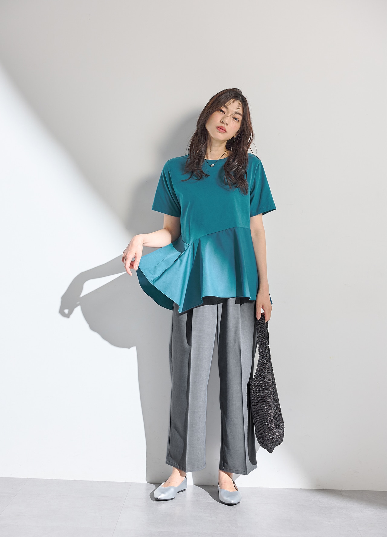 ジャージーと布帛の異素材コンビネーションが目を惹く一枚!アシンメトリーな裾ラインで、着るだけで華やか&こなれ感アップしてくれます。ブルーグリーンのアシンメトリートップスに、グレーのきれいめパンツを合わせた洗練スタイル。上品な配色と美しいシルエットで、大人っぽさを演出しています。