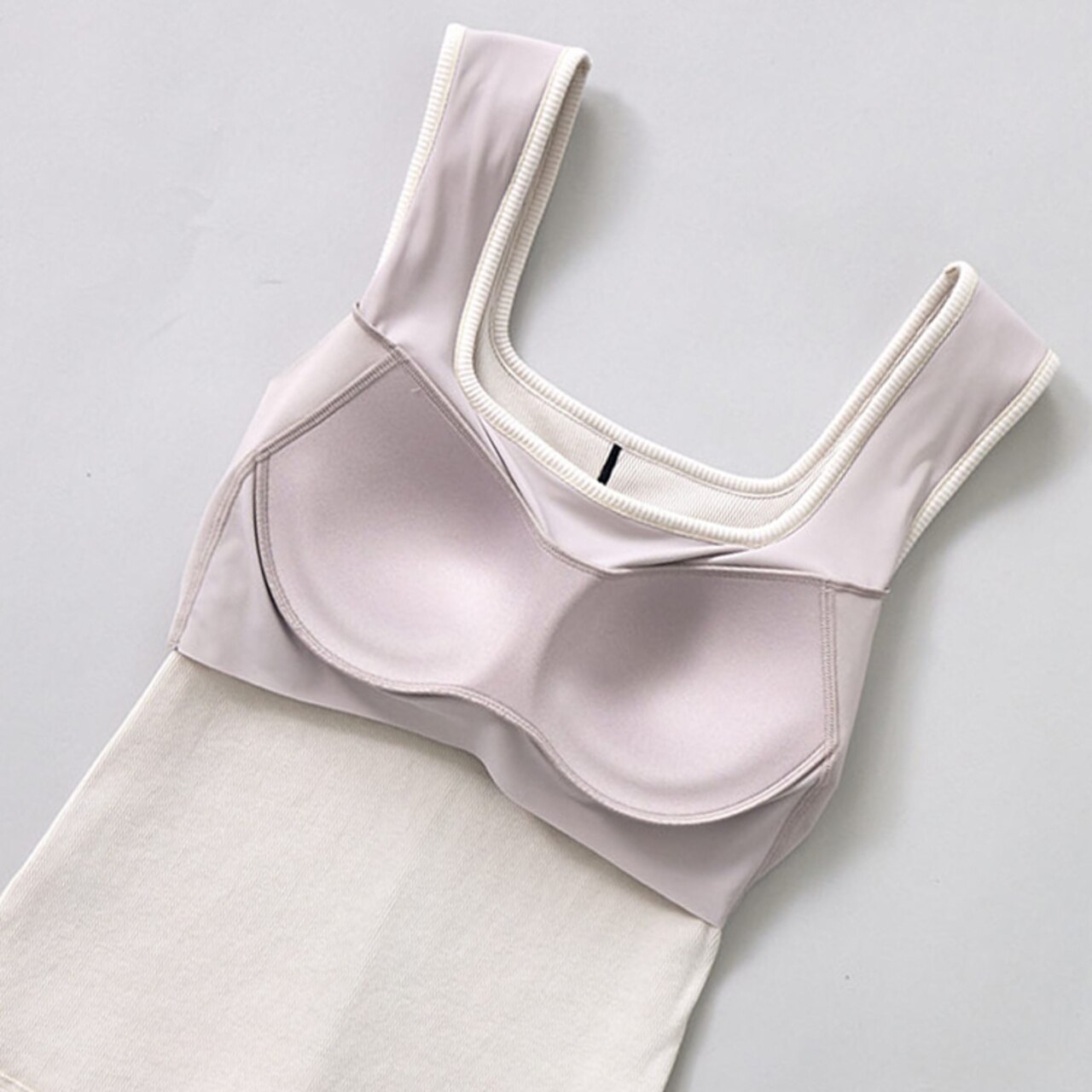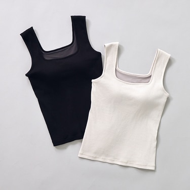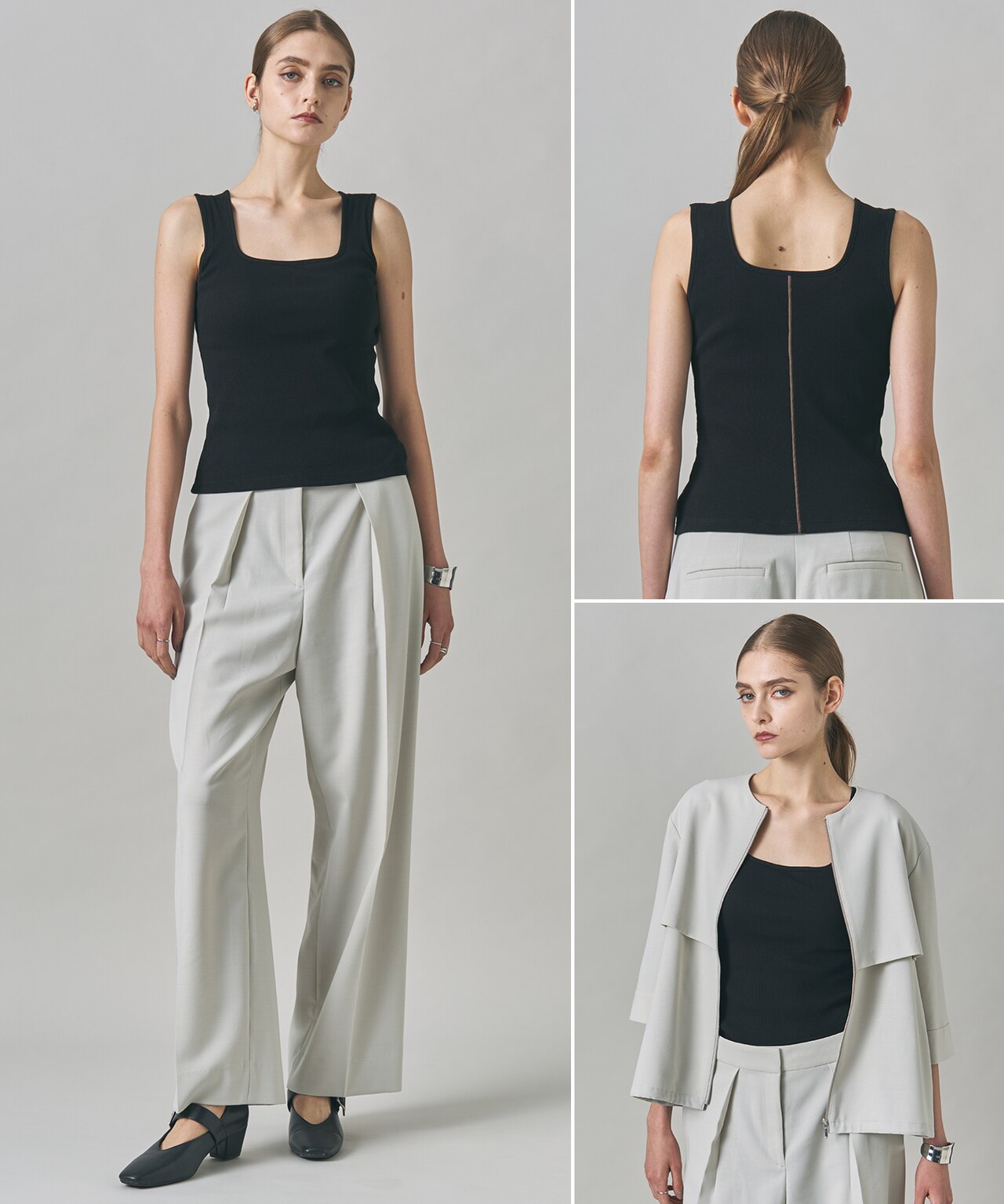スクエアカットのシャープなライン、ストラップの幅や胸元の高さにこだわったカップインタンクトップ。デコルテを開けてすっきりと見えつつ、露出が気になり過ぎない絶妙なラインに仕上げました。細めのリブで程よいテンションがあり、見せても良いインナーとして重宝します。