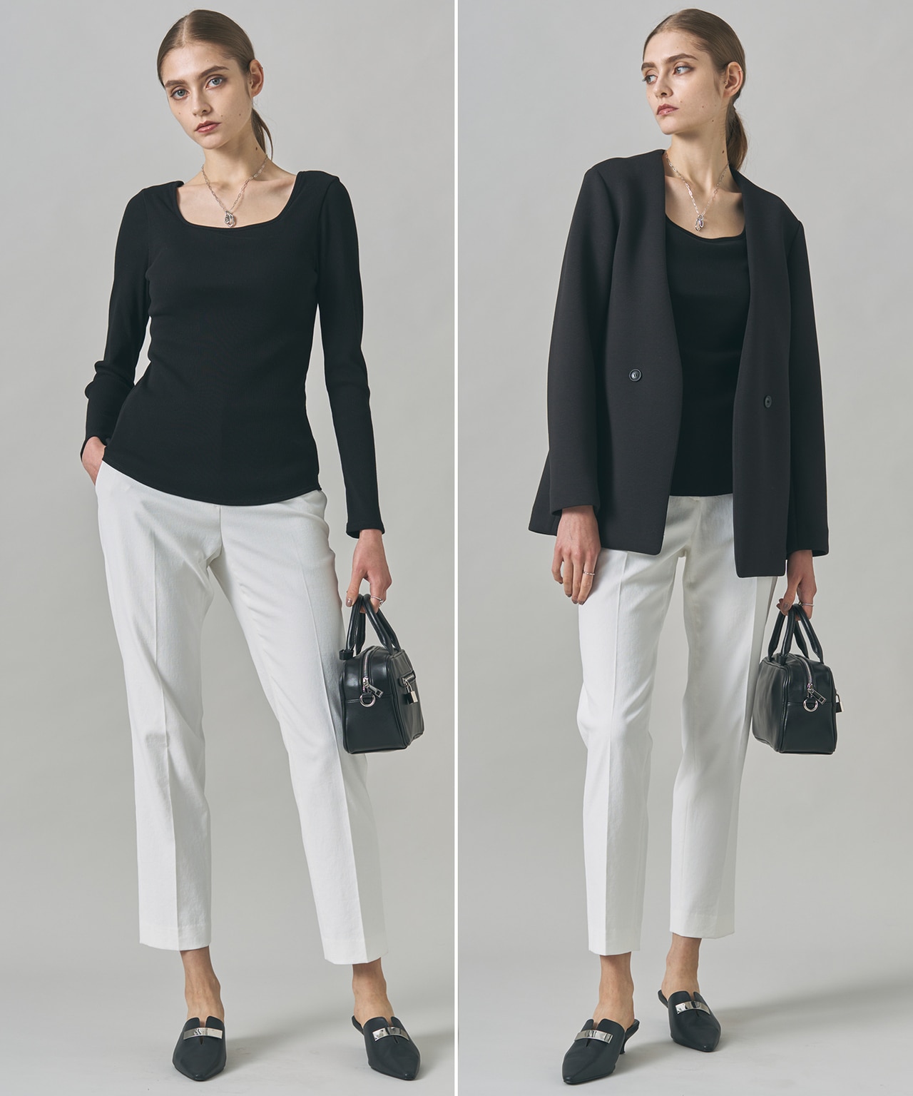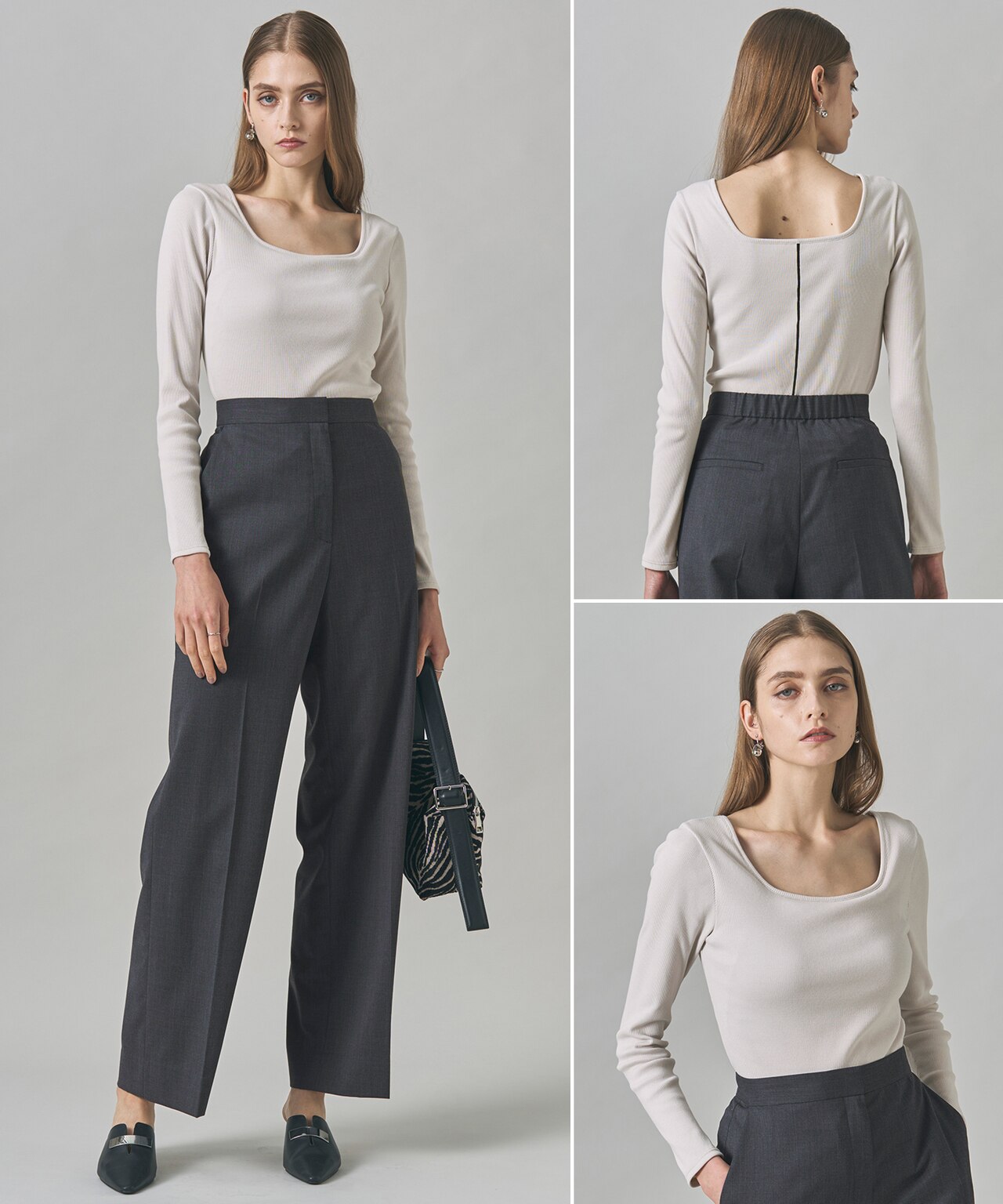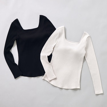 スクエアカットのシャープなラインや、胸元の高さにこだわったカップインロングスリーブTシャツ。裾はラウンドカットで、インでもアウトでも楽しめる丈感になっており、インナーとしてはもちろん、1枚でカジュアルにも合わせやすいデザインに仕上げています。