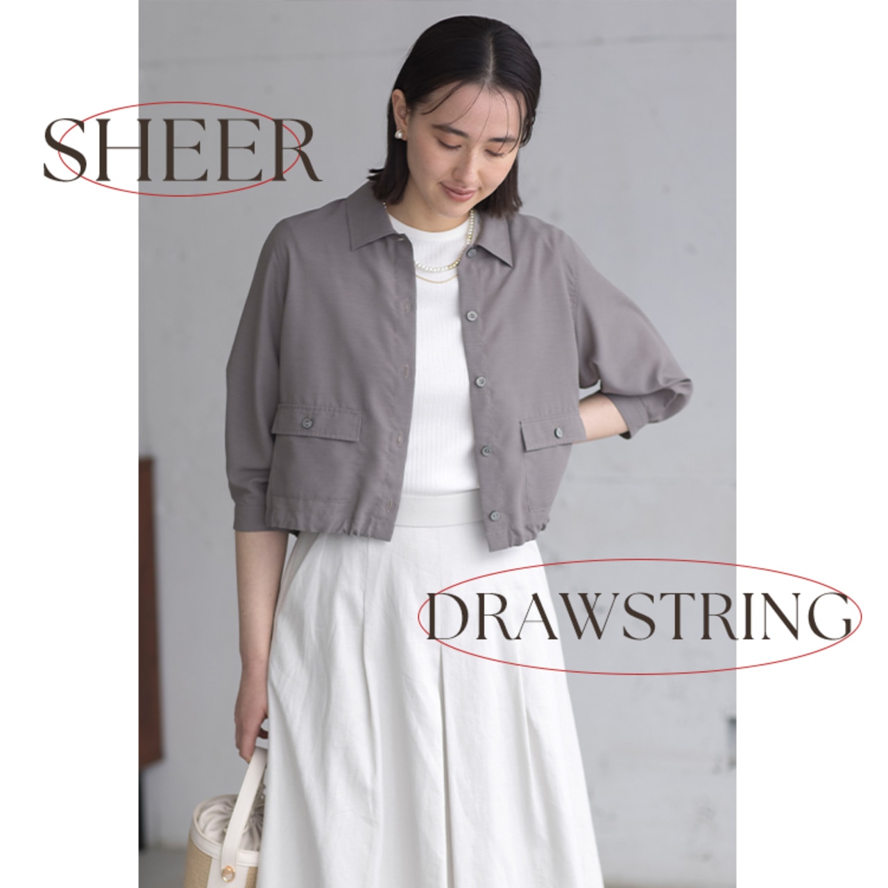 夏におすすめのシアーシャツジャケット。裾のドローストリングスで今っぽいコクーンシルエットに!吸水速乾・UVケア・抗ピリングと高機能なのも嬉しいポイント!