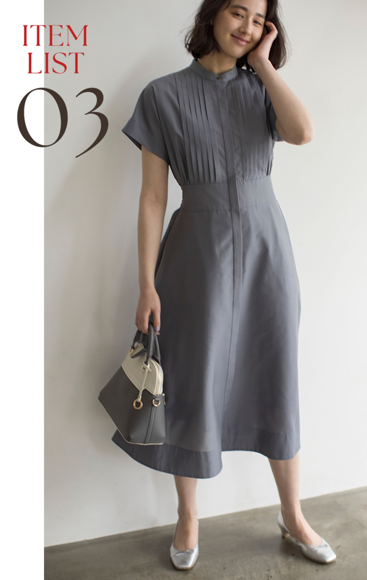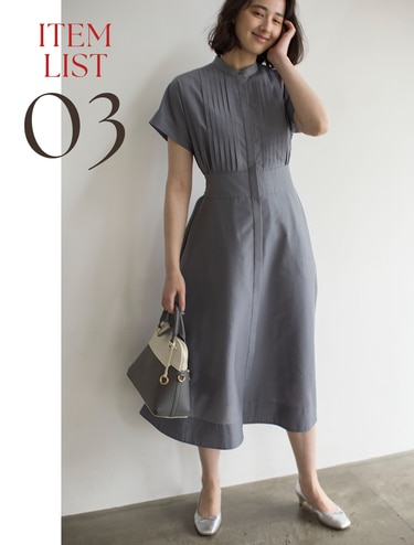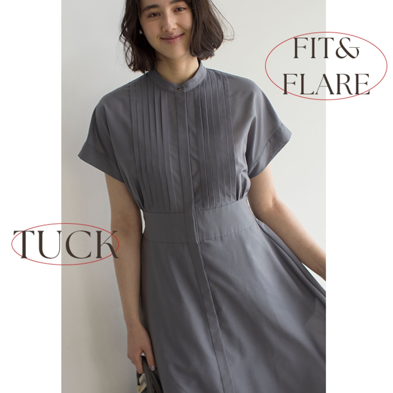 フロントのタックデティールとスカートのフレアーラインが上品なワンピース。ドライタッチでありながら光沢感のある素材で上品に。今年らしいシアー感もポイントです!