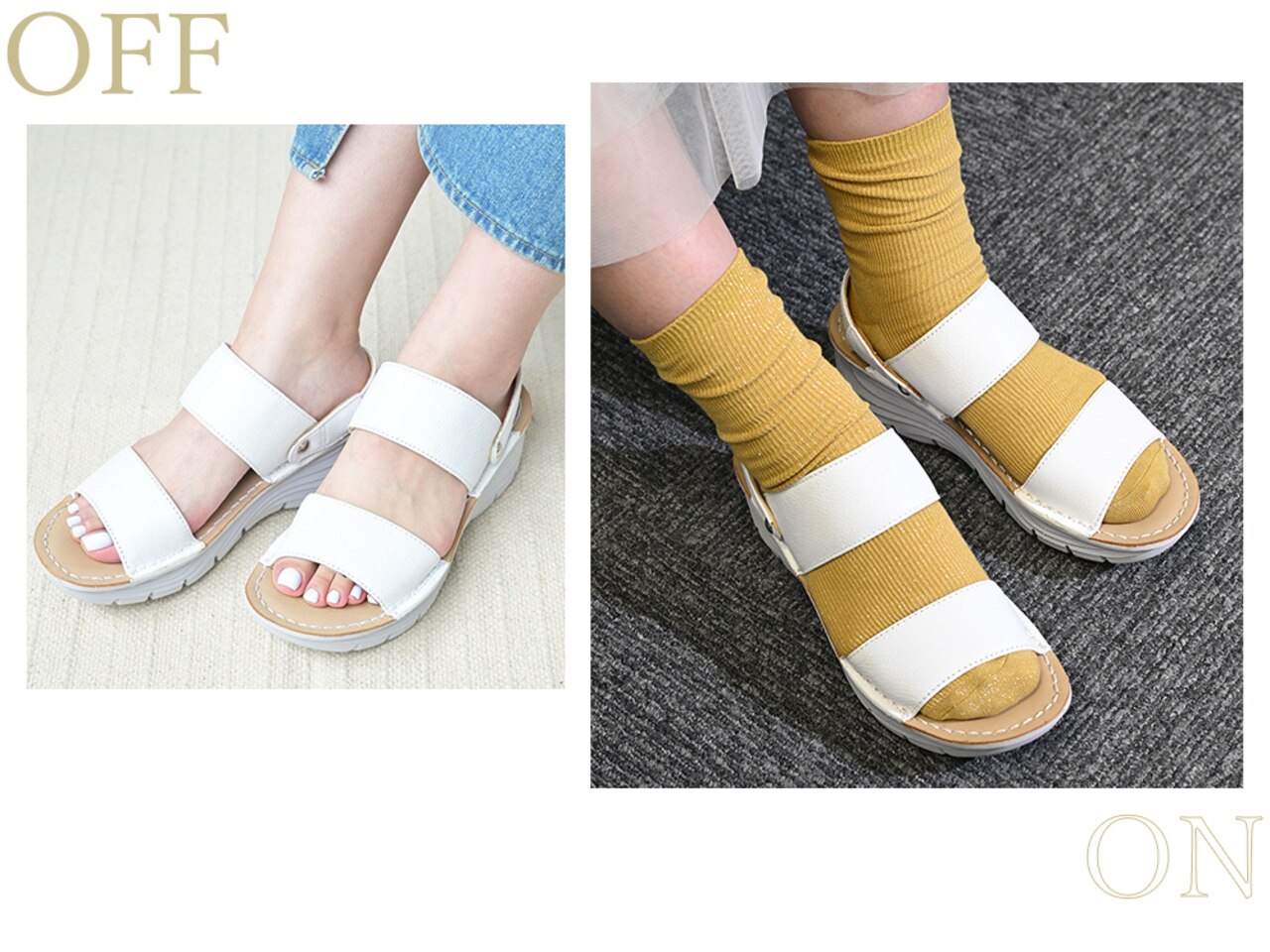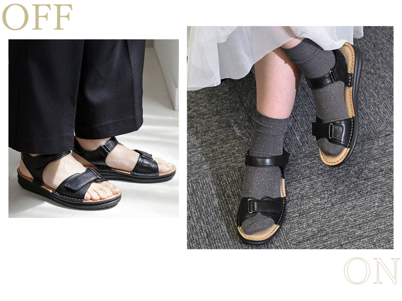 足首と甲がマジックテープで調整自由なストラップサンダル。素足はもちろん、靴下を合わせても自然に馴染み、厚手のソックスやカラーソックスで足元にアクセントを加えることも。調整可能なストラップでフィット感も抜群なので、長時間履いても快適。