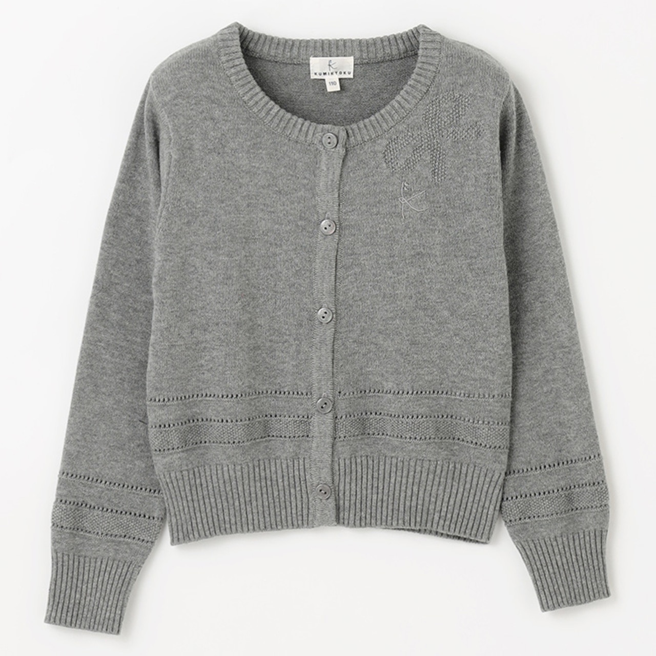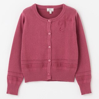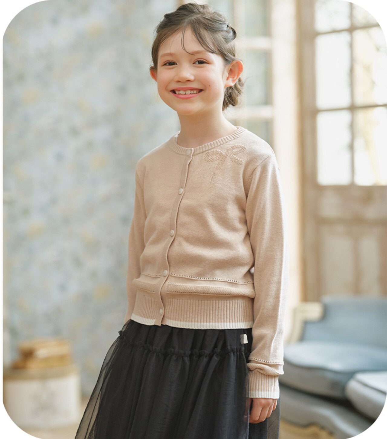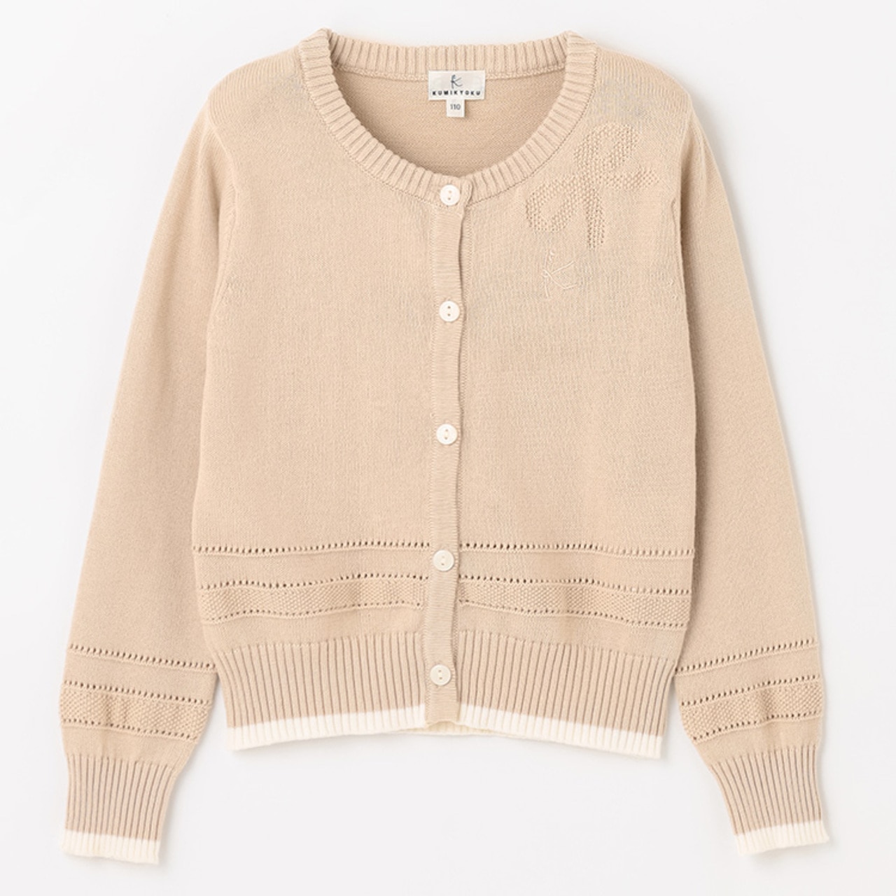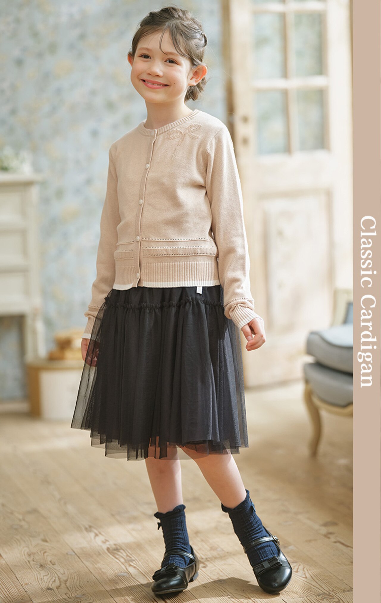 定番のカーディガンをアップデート。左胸にさりげなく施されたカノコ編みのリボンモチーフがアクセントになった、甘すぎないデザインに仕上げました。カーディガンのボタンを全て留めてトップス風にし、チュールのスカートを合わせれば一気に上品なお出かけコーデの完成!
