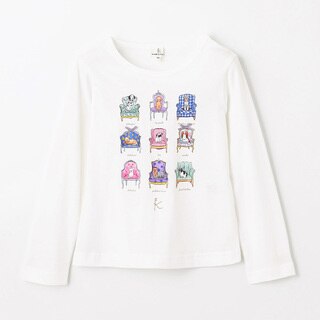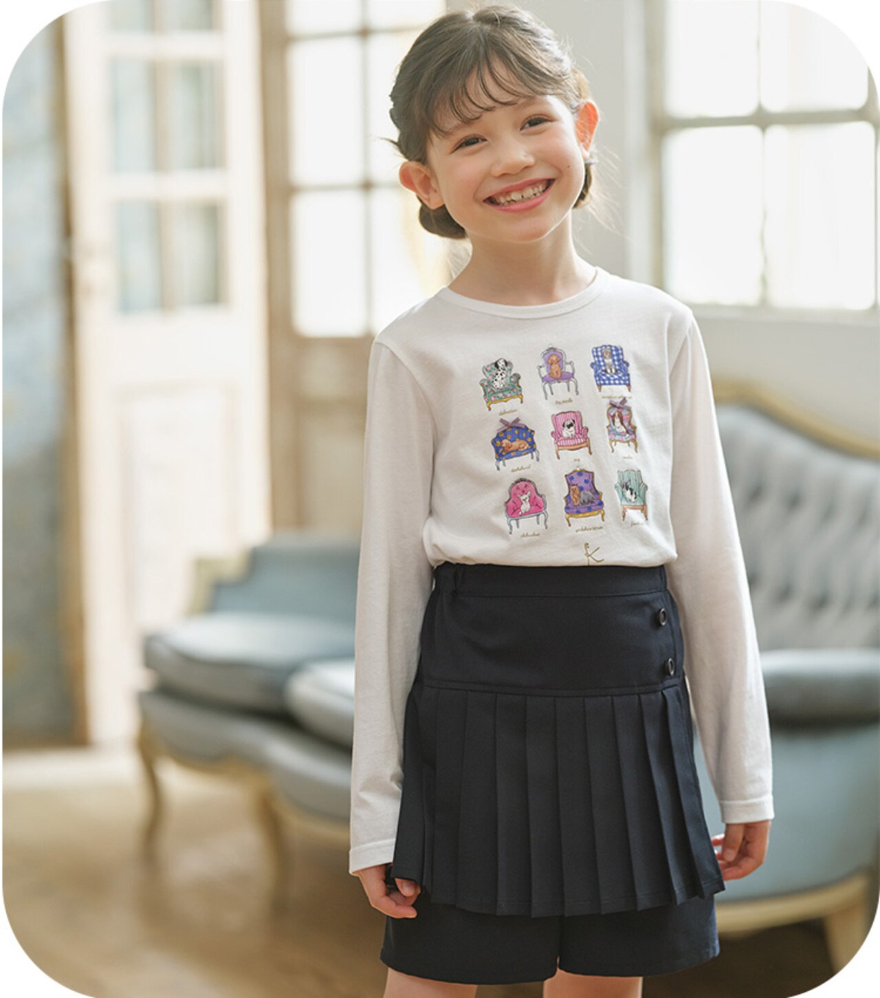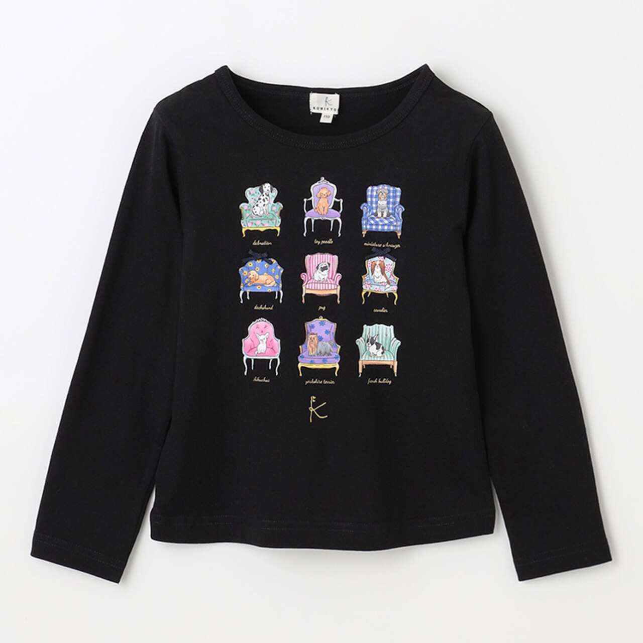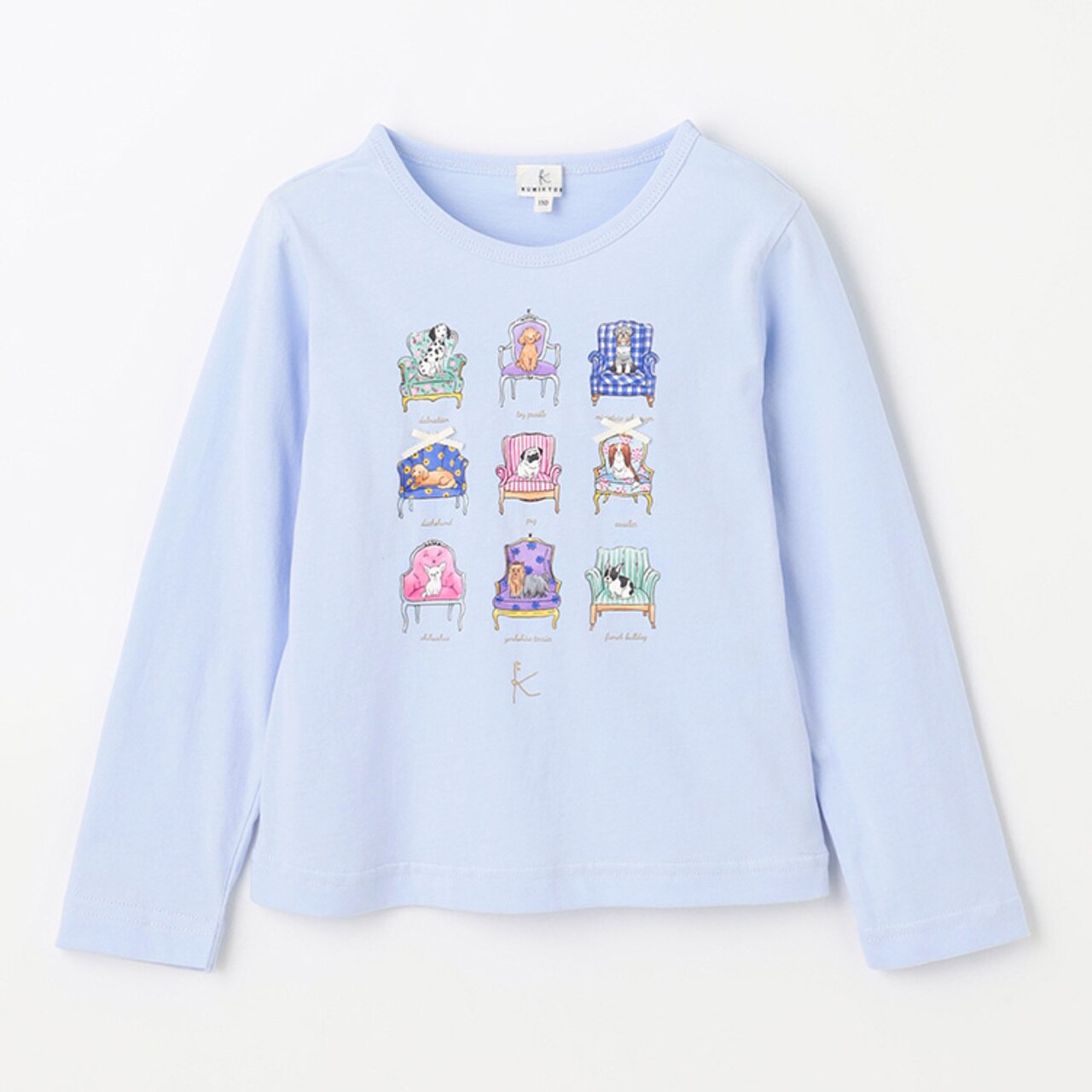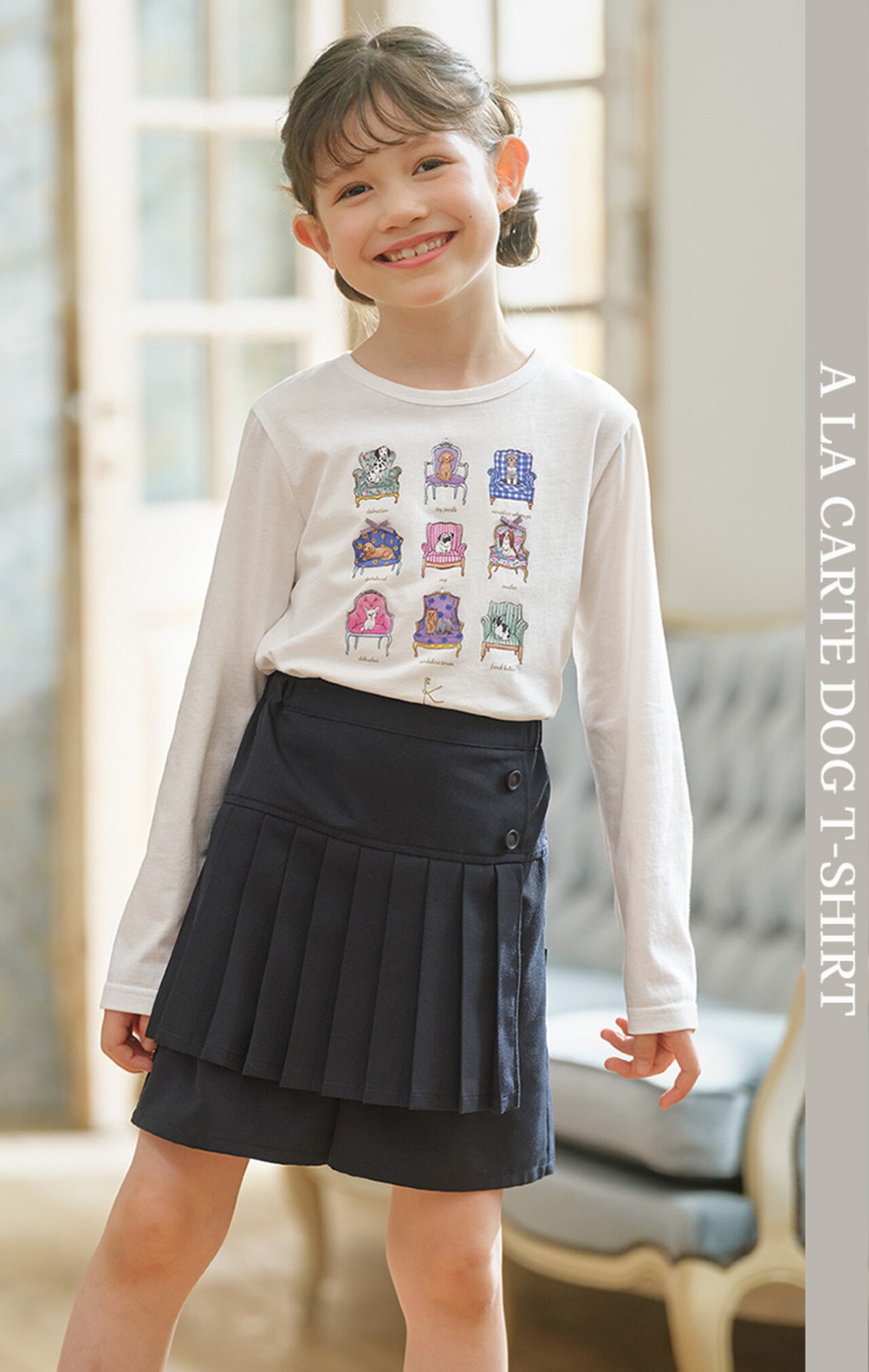 9匹のワンちゃんがそれぞれデザインの違うカラフルな椅子に座っているグラフィックのTシャツ。どのワンちゃんが好き?という会話も楽しめちゃう、遊び心のある1枚です!ボトムスを少し大人っぽいキュロットにすると、おでかけにもピッタリなコーディネートに。通学にもおすすめの1枚です。