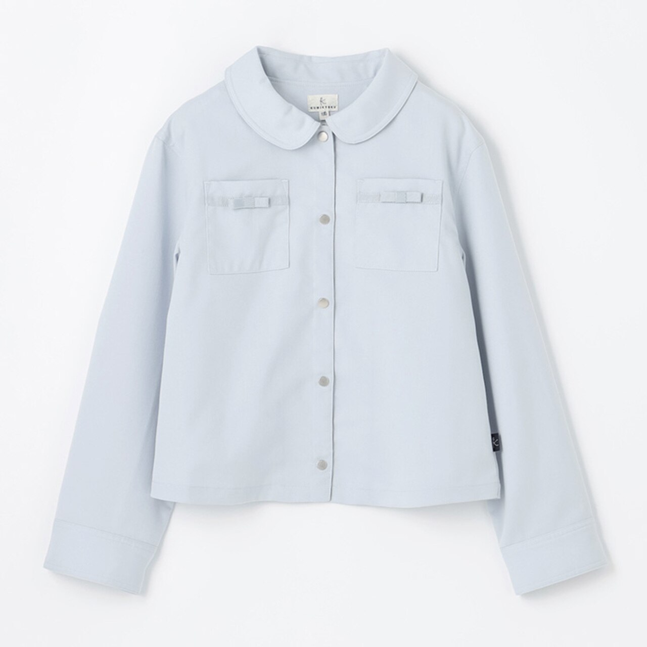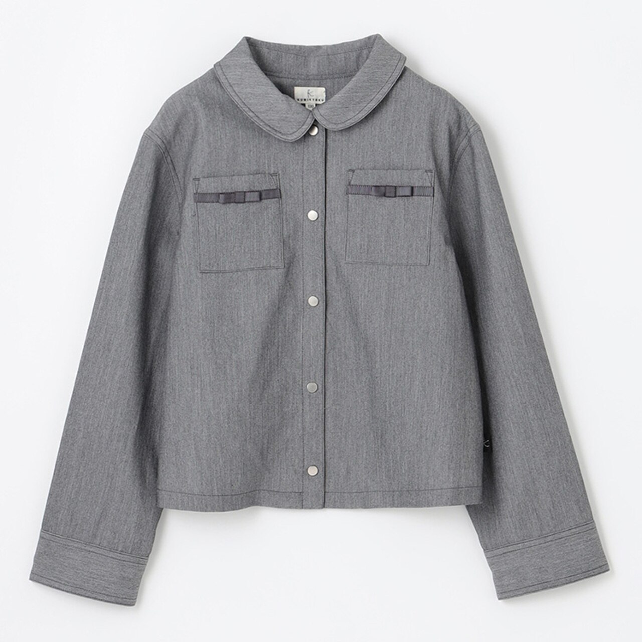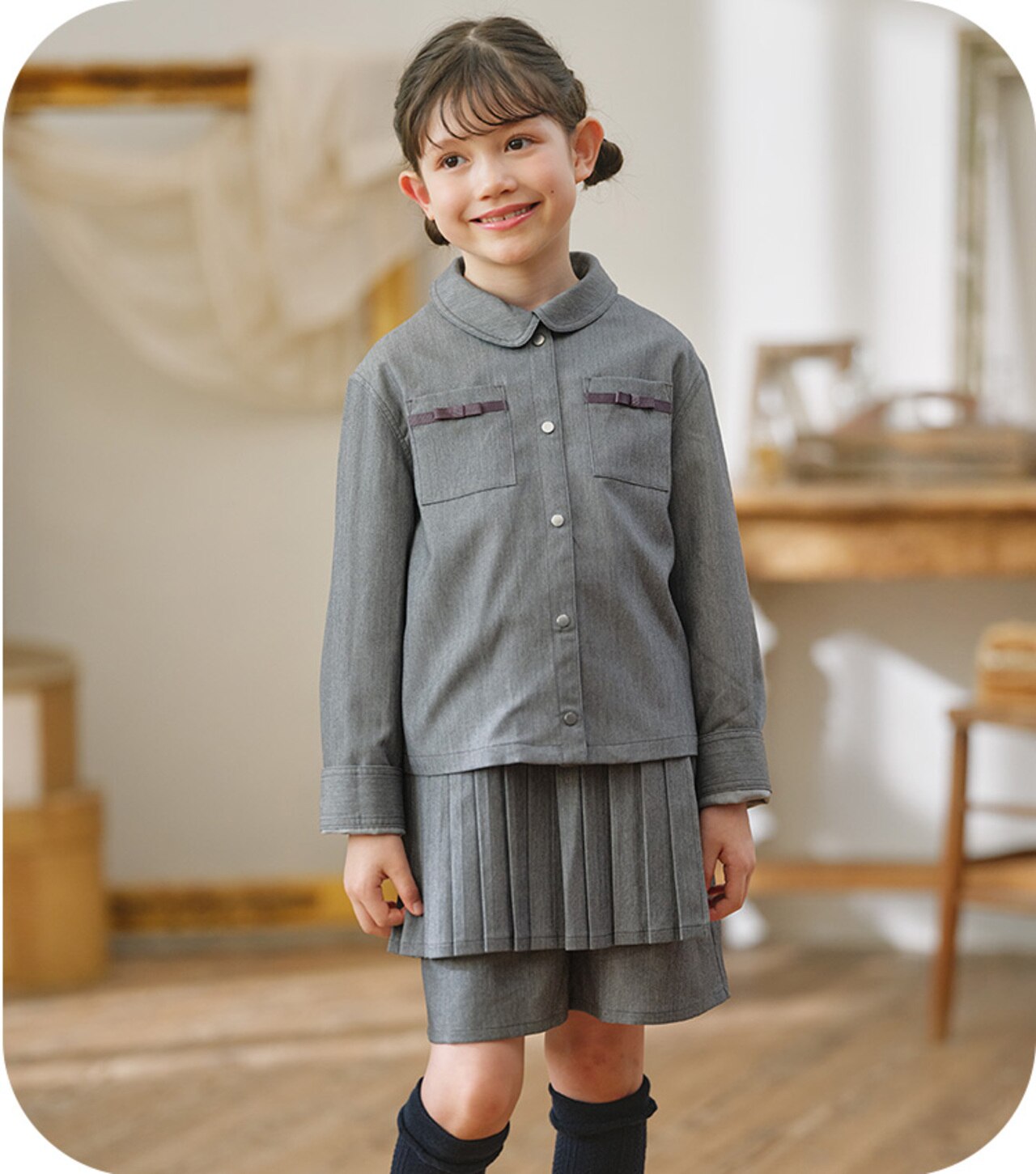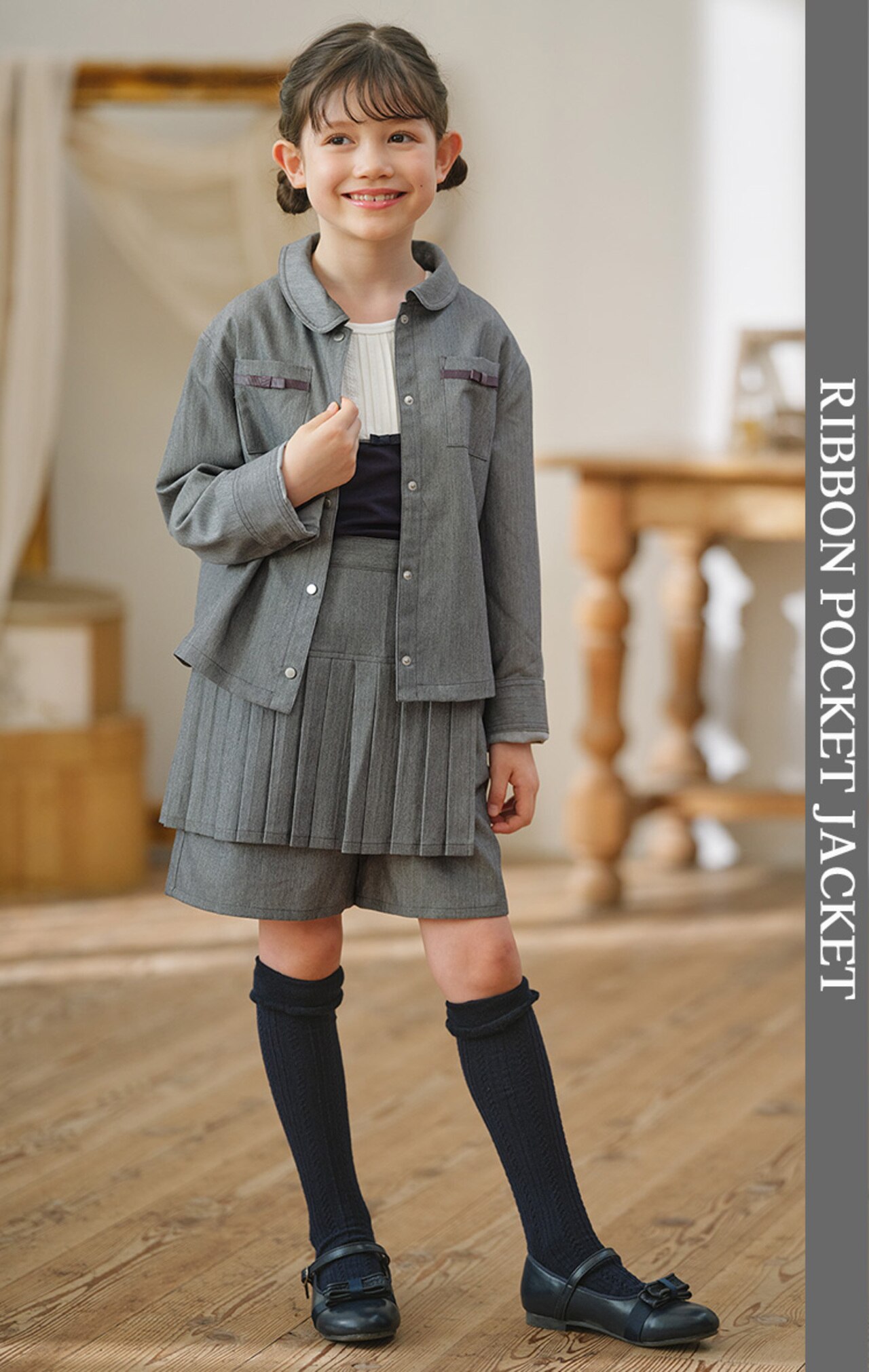 丸襟が上品な印象を与えるジャケット。胸元の大きめのポケットに、細いリボンをあしらって、シンプルの中にも可愛さを演出しました。ウエストサイドにラップ風のデザインを引き立てるボタンを施したプリーツキュロットと相性抜群。特にグレーはセットアップでスクールガール風コーデに出来るのがおすすめです。