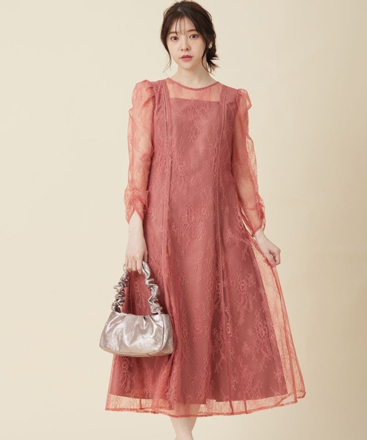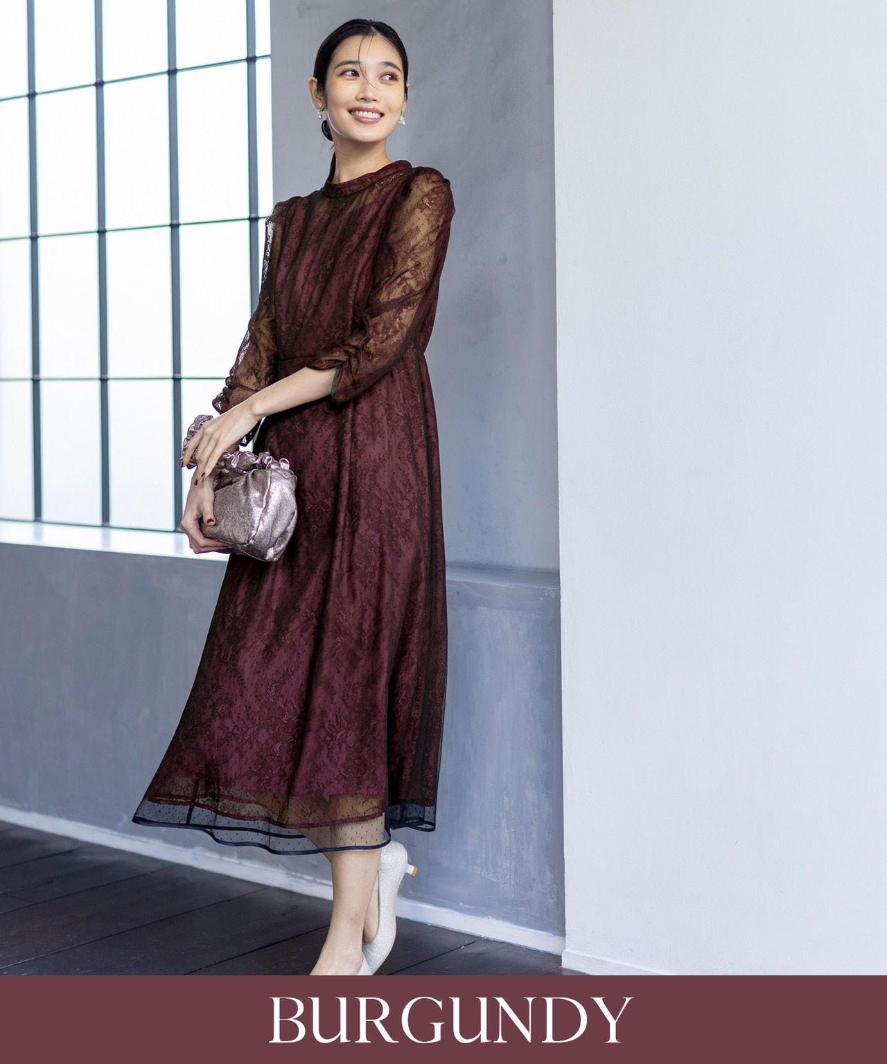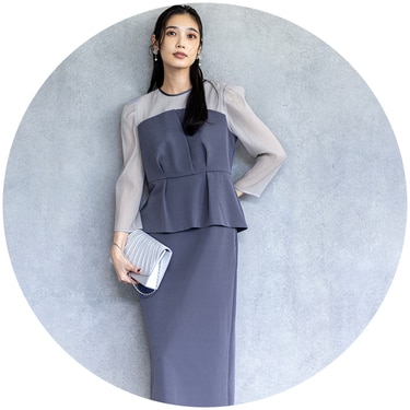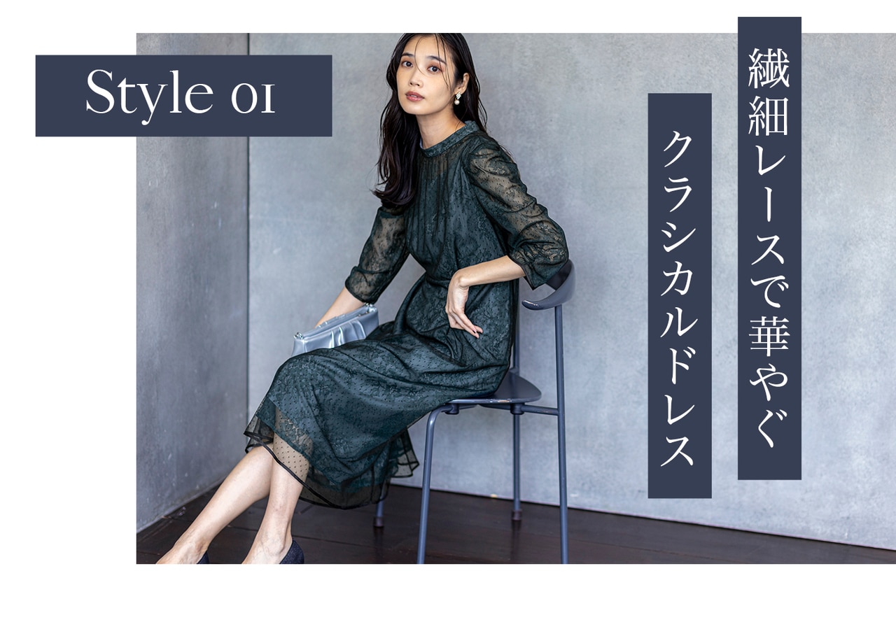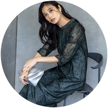 さりげない透け感とダークトーンで大人なドレスには、メタリックな小物できらっとアクセントをプラスして。華やかなシーンに映えるクラシカルなスタイリングの完成。