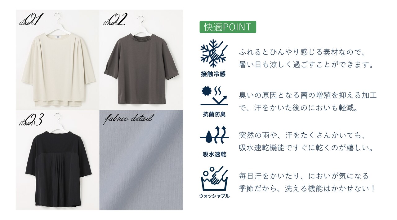ドライタッチで肌離れが良く、乾きやすい、夏場も暑さの続く秋にもストレスなく着ていただける素材「ドライポンチ」を使ったトップスシリーズ。