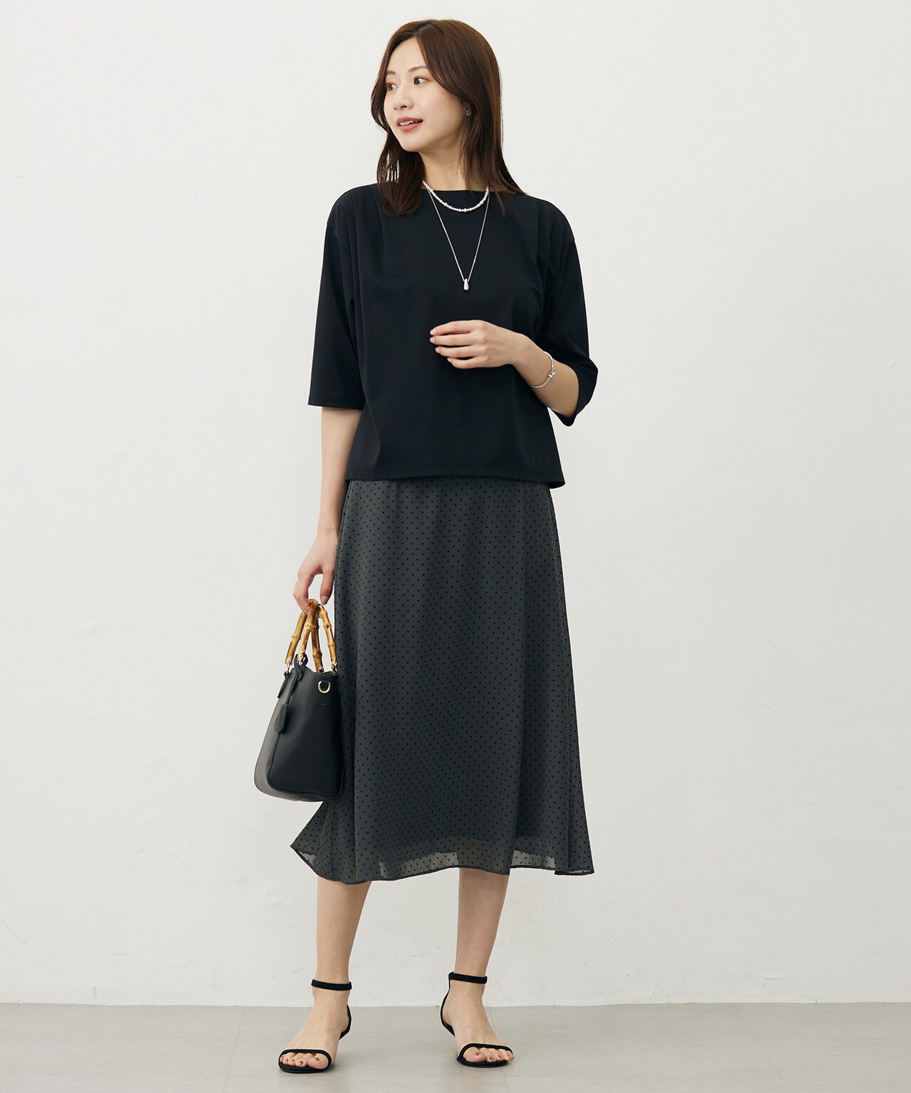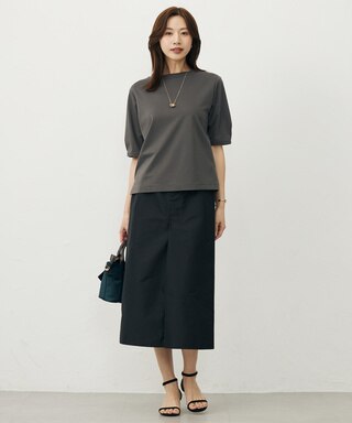上身頃にはさらりとしたジャージー素材、下身頃には布帛を使用した、動きやすくふんわりと涼しい素材感です。長すぎない着丈で、ワイドパンツやナロースカートとも好バランスで着こなせます。オンオフ活躍し、着回し力の高さも魅力の1枚です。