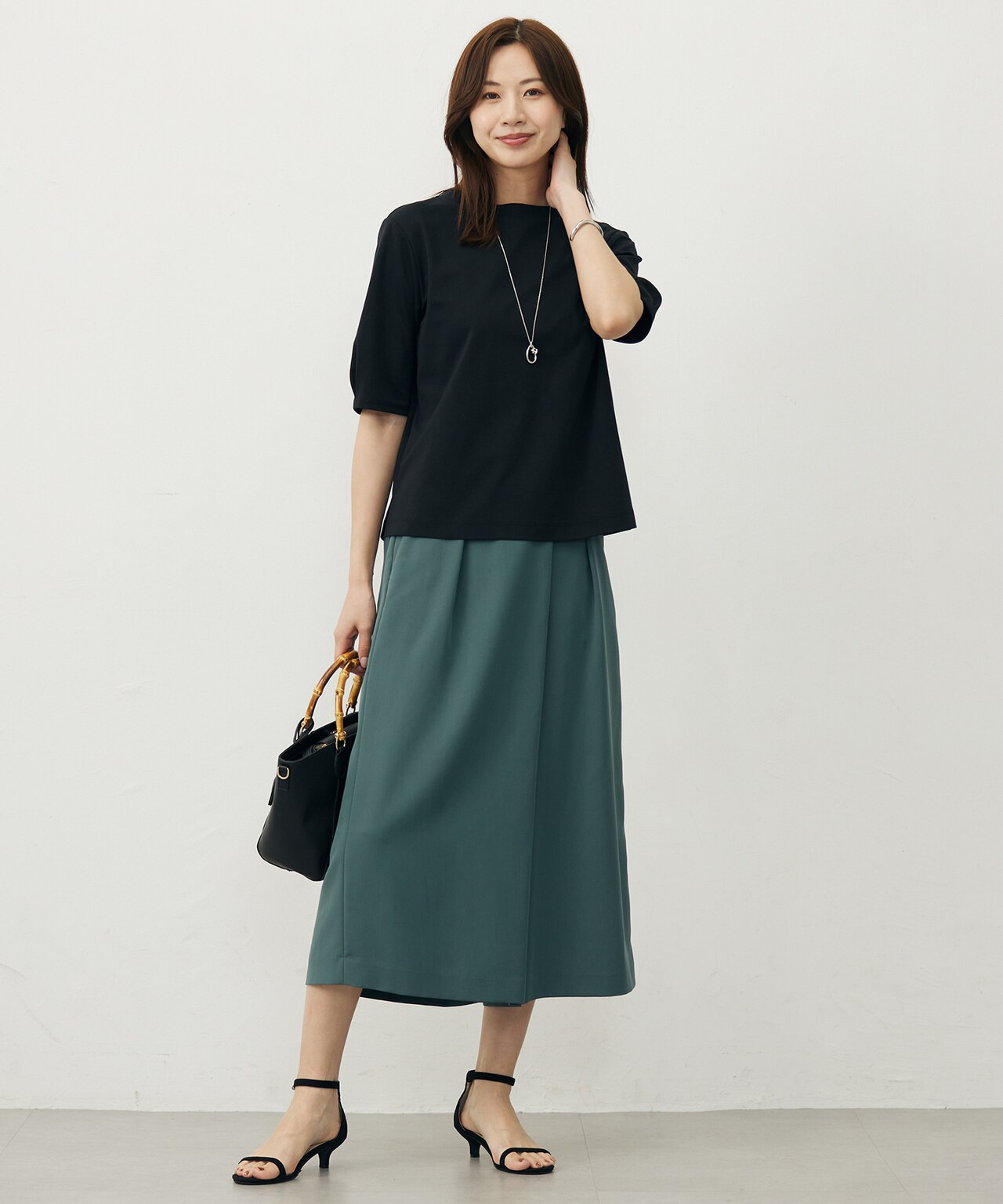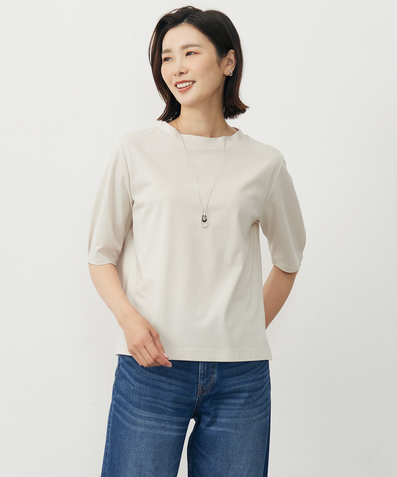 襟元はやや広めに開いたモックネックで、Tシャツ感覚で着られながらも、大人らしい上品な1着です。袖は少し長めの5分丈で、二の腕もさりげなくカバー。合わせるアイテム次第で、ロングシーズン活躍してくれる優秀トップスです。