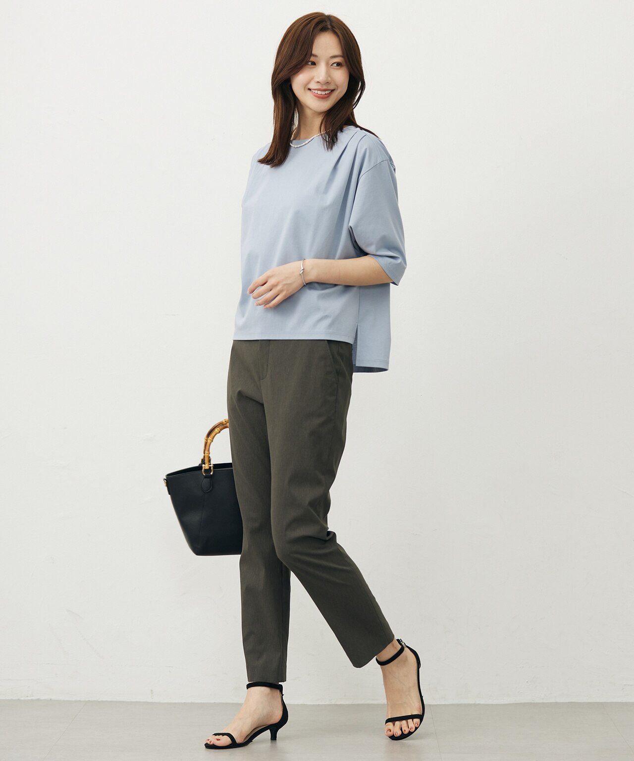 軽やかな印象のベージュカラーにスレートカラーパンツを合わせた、絶妙なニュアンスカラーをお互いが惹き立てるコーデ。トップスもパンツも機能性のあるアイテムで、残暑も快適に。