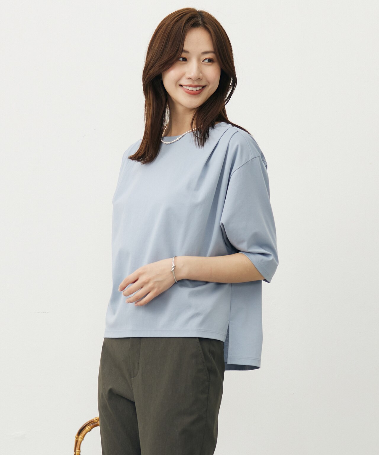 肩に寄せたタックがさりげなくエレガンスな印象を醸し出すボートネックカットソー。