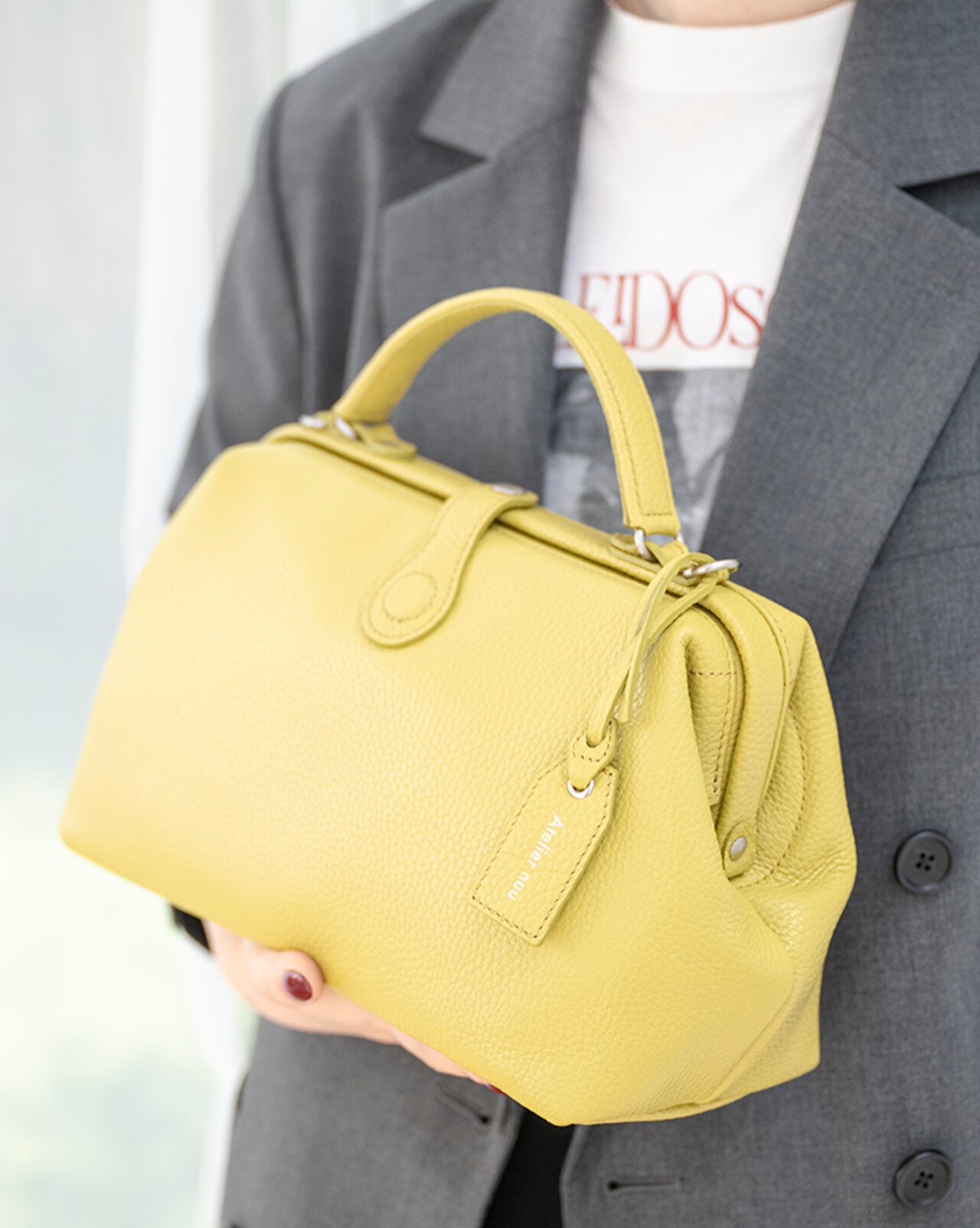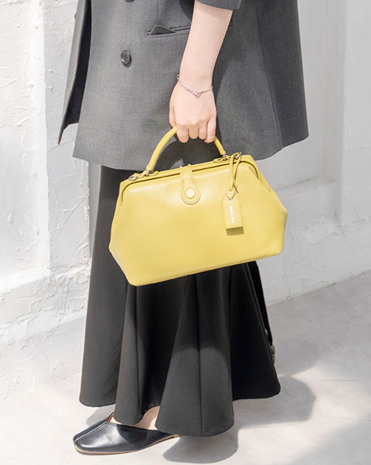 秋冬のアクセントカラーとして大活躍するピスタチオカラーのレザーバッグ。寒い時期によく着るブラックやモノトーンコーデのワンポイントとしても◎