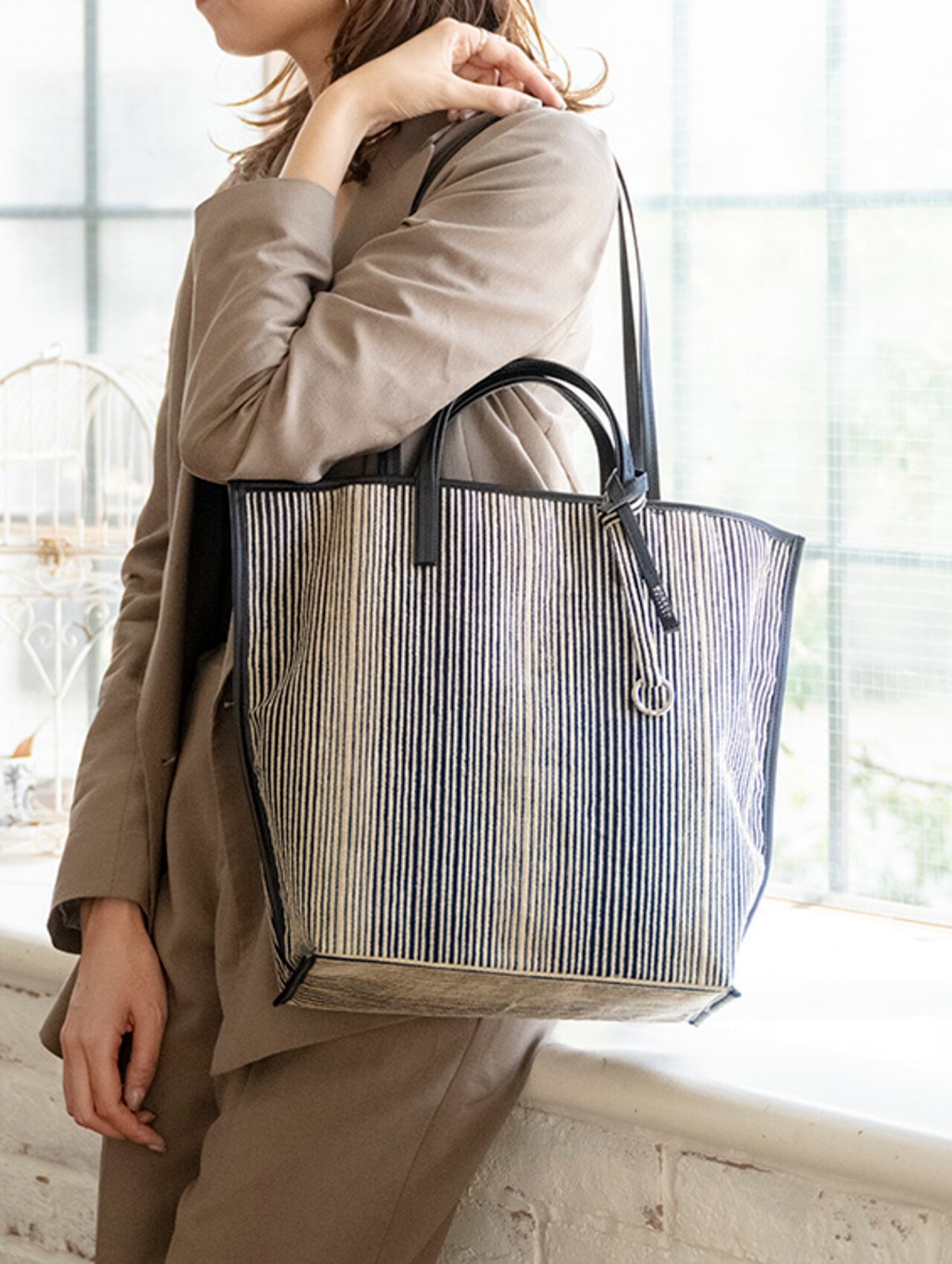 使いやすい四角フォルム、起毛感のあるストライプ柄のトートバッグ。秋冬らしい薄めのベージュと黒のストライプは、秋コーデにピッタリ!