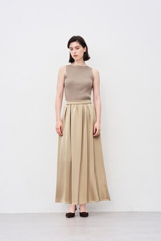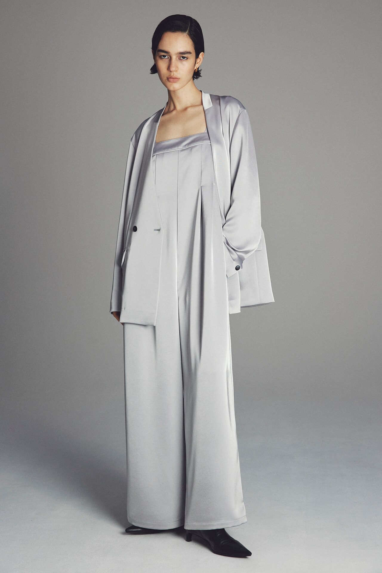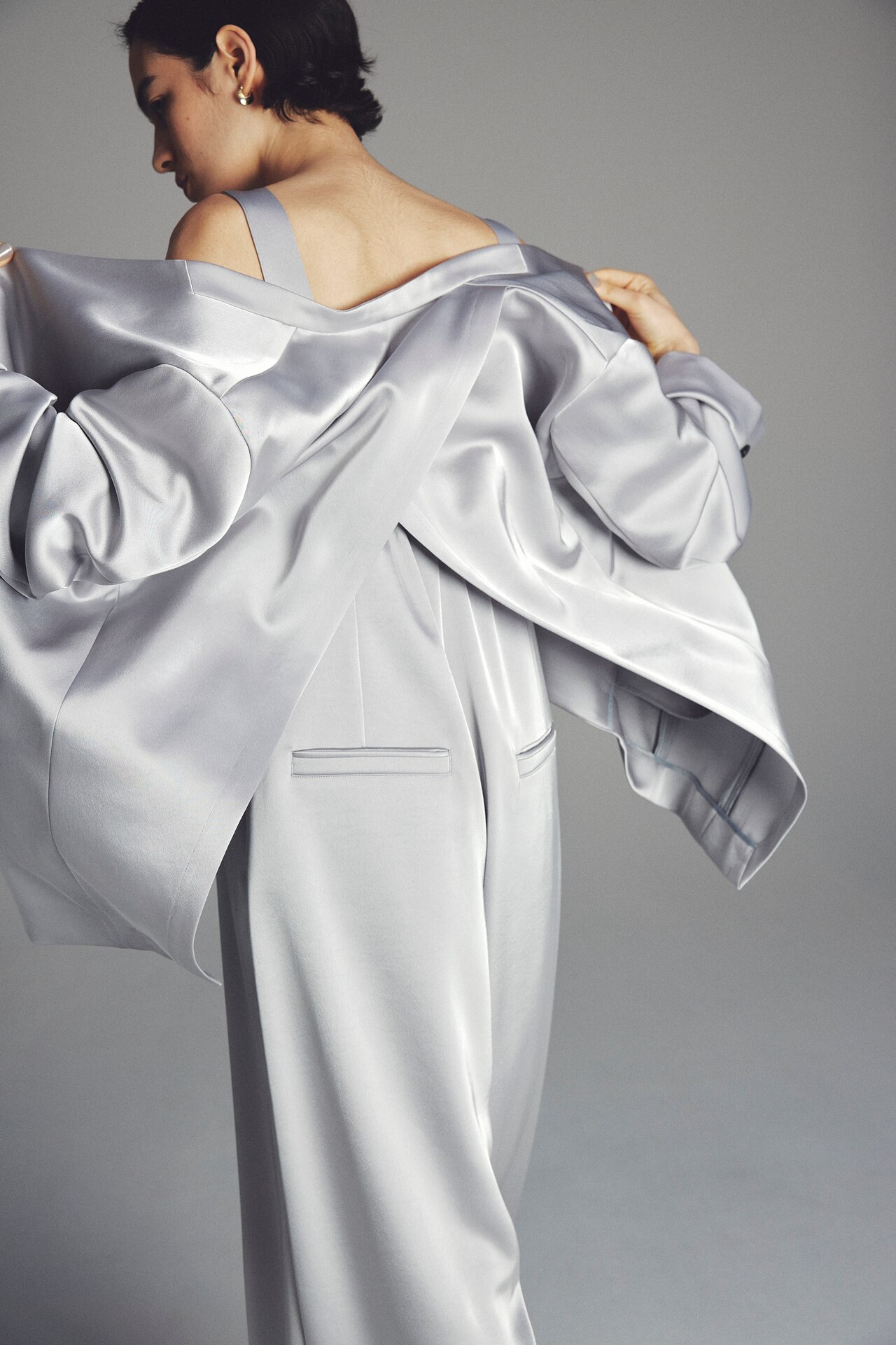 ドレープ性の高いダブルサテン素材です。ダブル組織で織り上げる事によりプリプリっとした反発性と滑り落ちる様な滑らかさがポイントです。