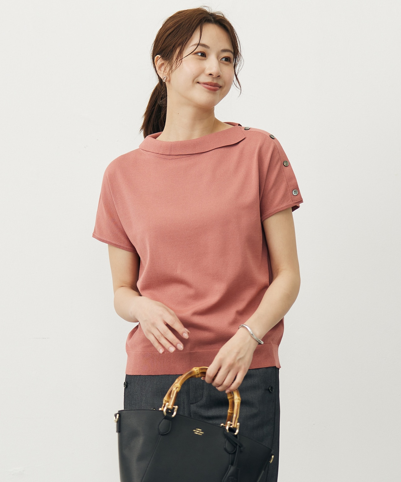 きちんと感のある襟元に、左肩の貝釦が上品なアクセントポイントのニット。ランダムボーダーとフレンチスリーブが涼しげな印象で、今の季節にぴったりな1着。全体をブラウンカラーでまとめた、秋のムード漂う大人の女性にぴったりのスタイリング。