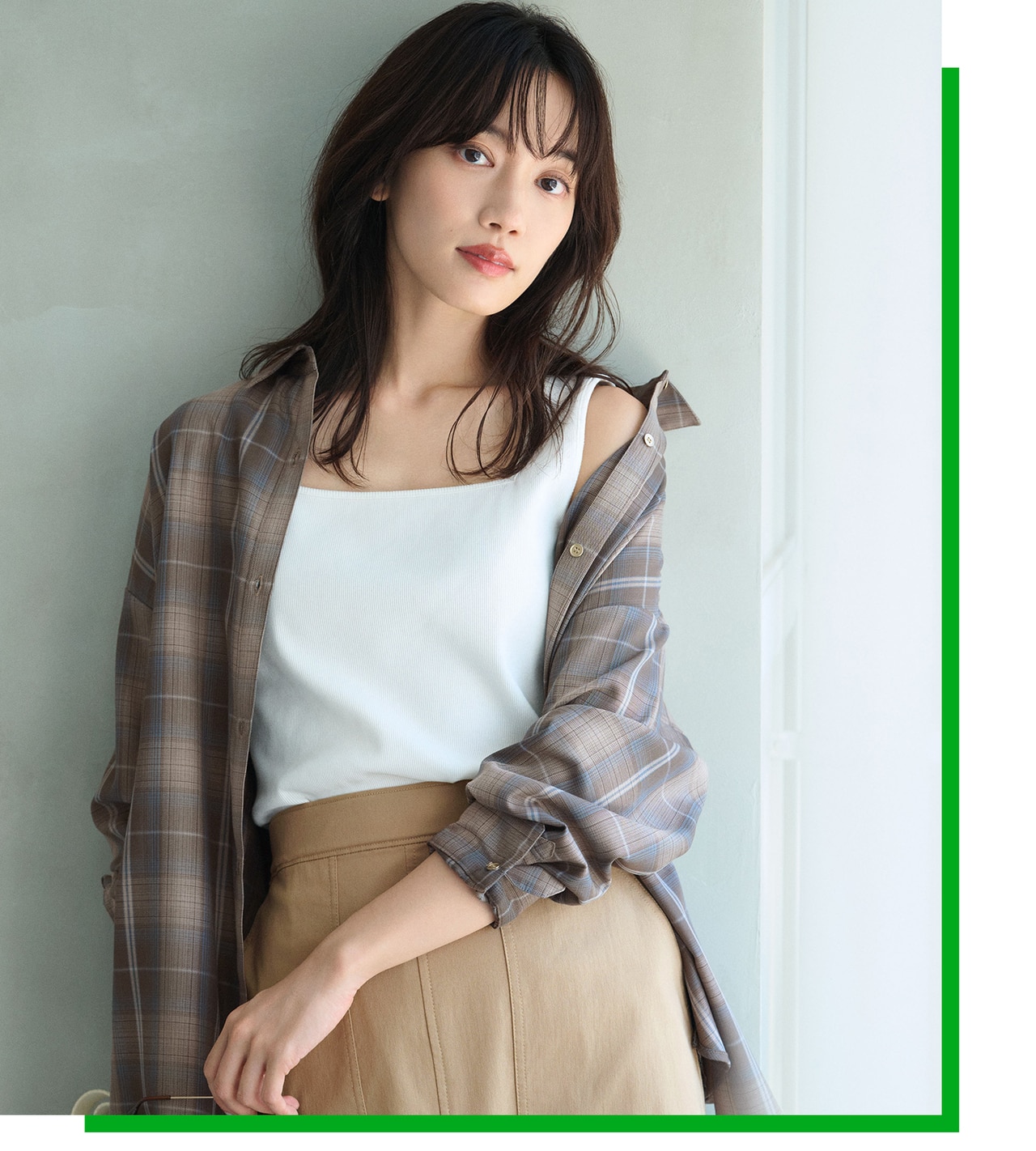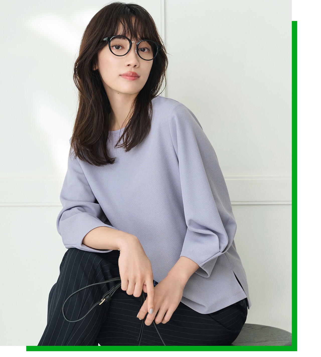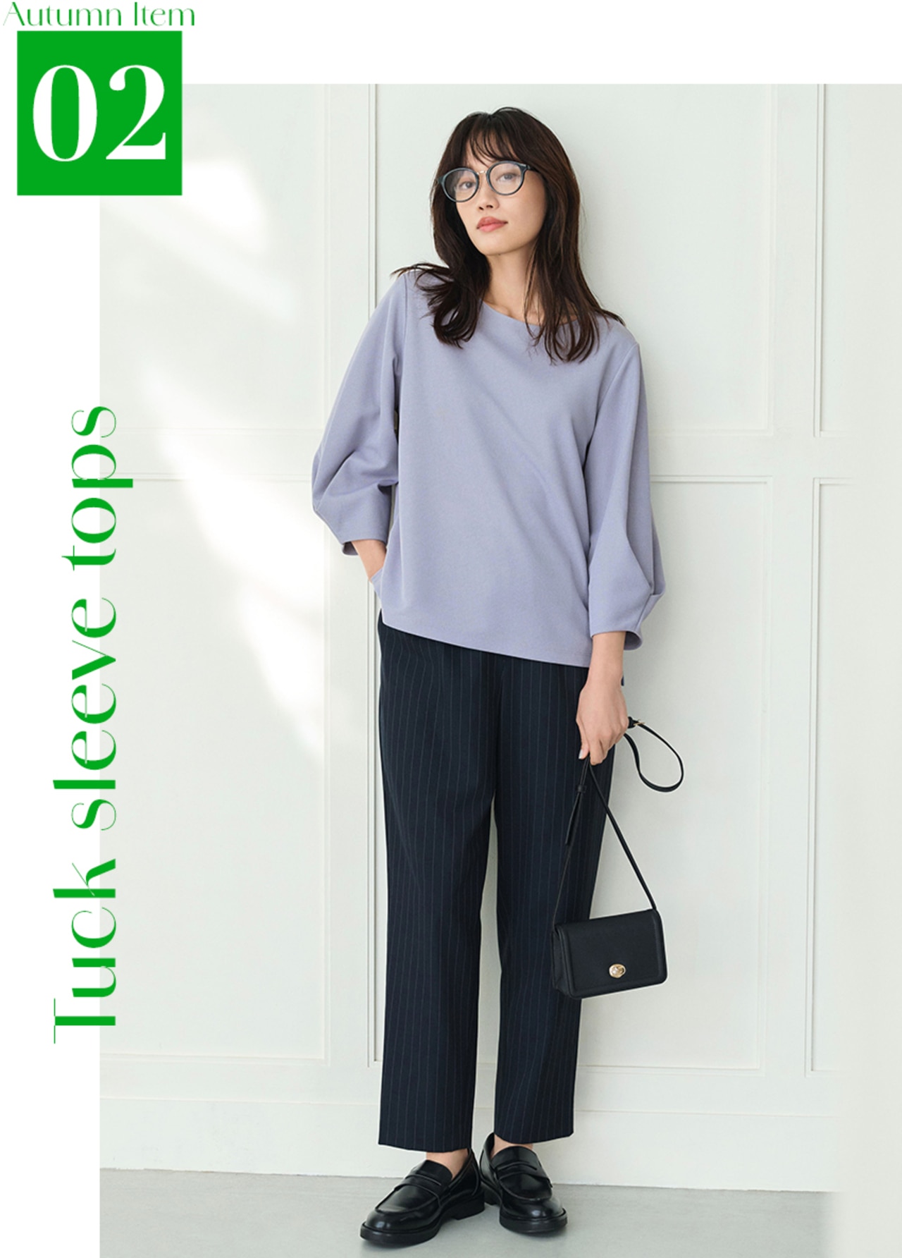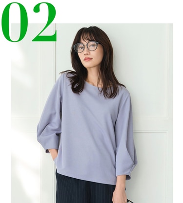 Tシャツよりも女性らしく、シャツよりもカジュアルに。シンプルだけど品良くまとまる、“サマ見え”デザイントップスを主役に、ピンストライプのパンツできりっとカッコよく!