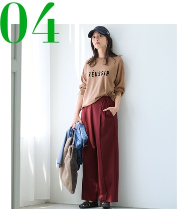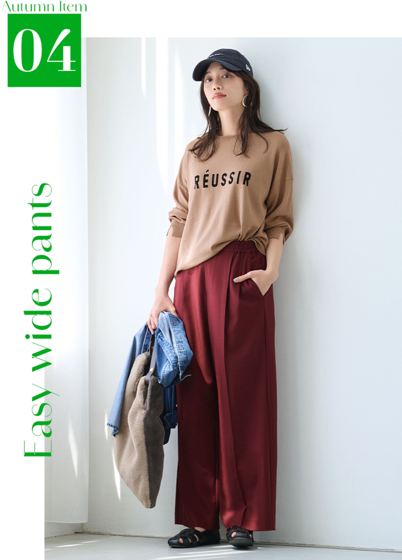 センタープレス入りの美脚シルエットがON・OFF、どちらにもマッチ。ウエストがゴム仕様なので気軽にはけて、洗っても型崩れしない、オシャレさと機能性のどちらも妥協なしの一本です。深みのあるバーガンディで秋の気配をひとさじ。