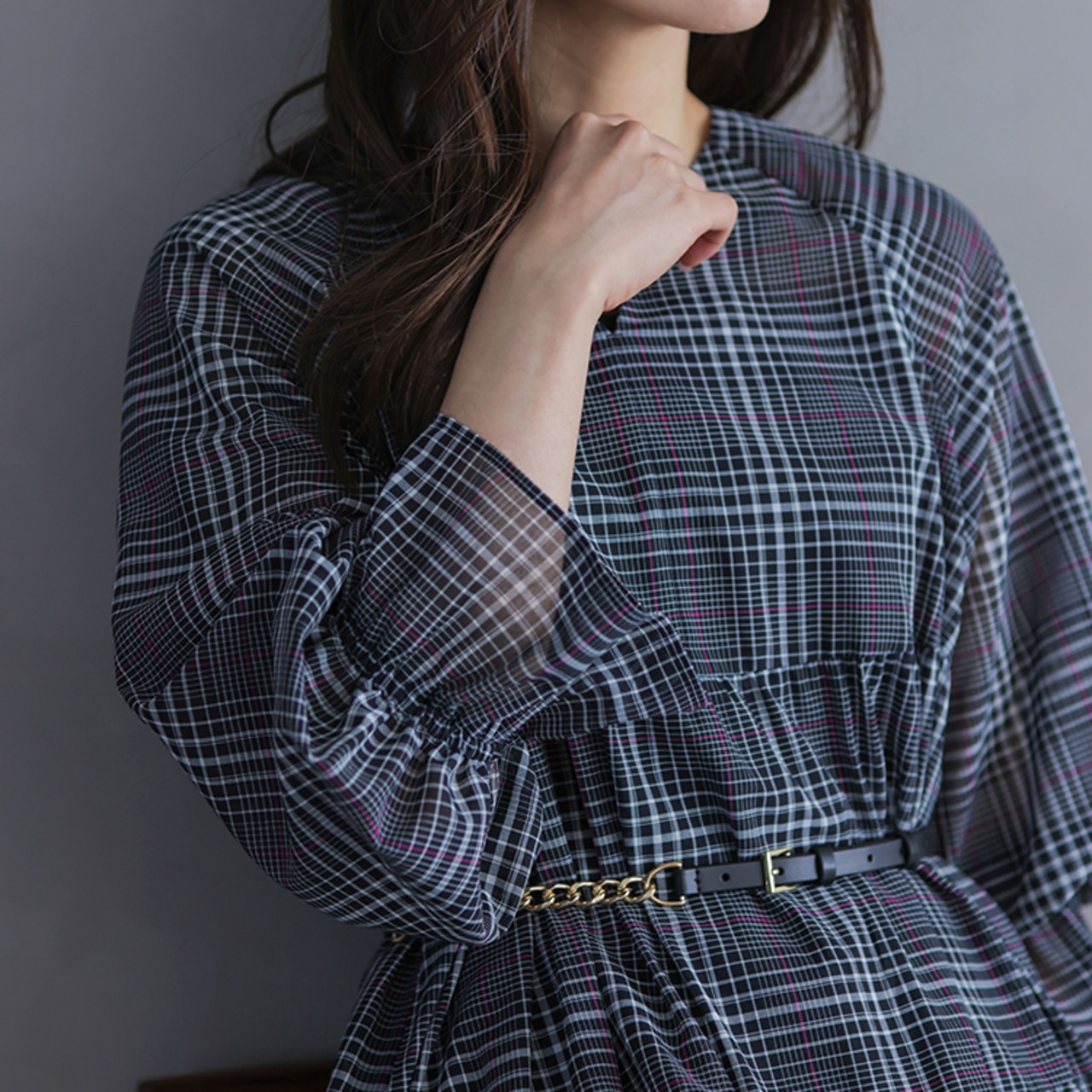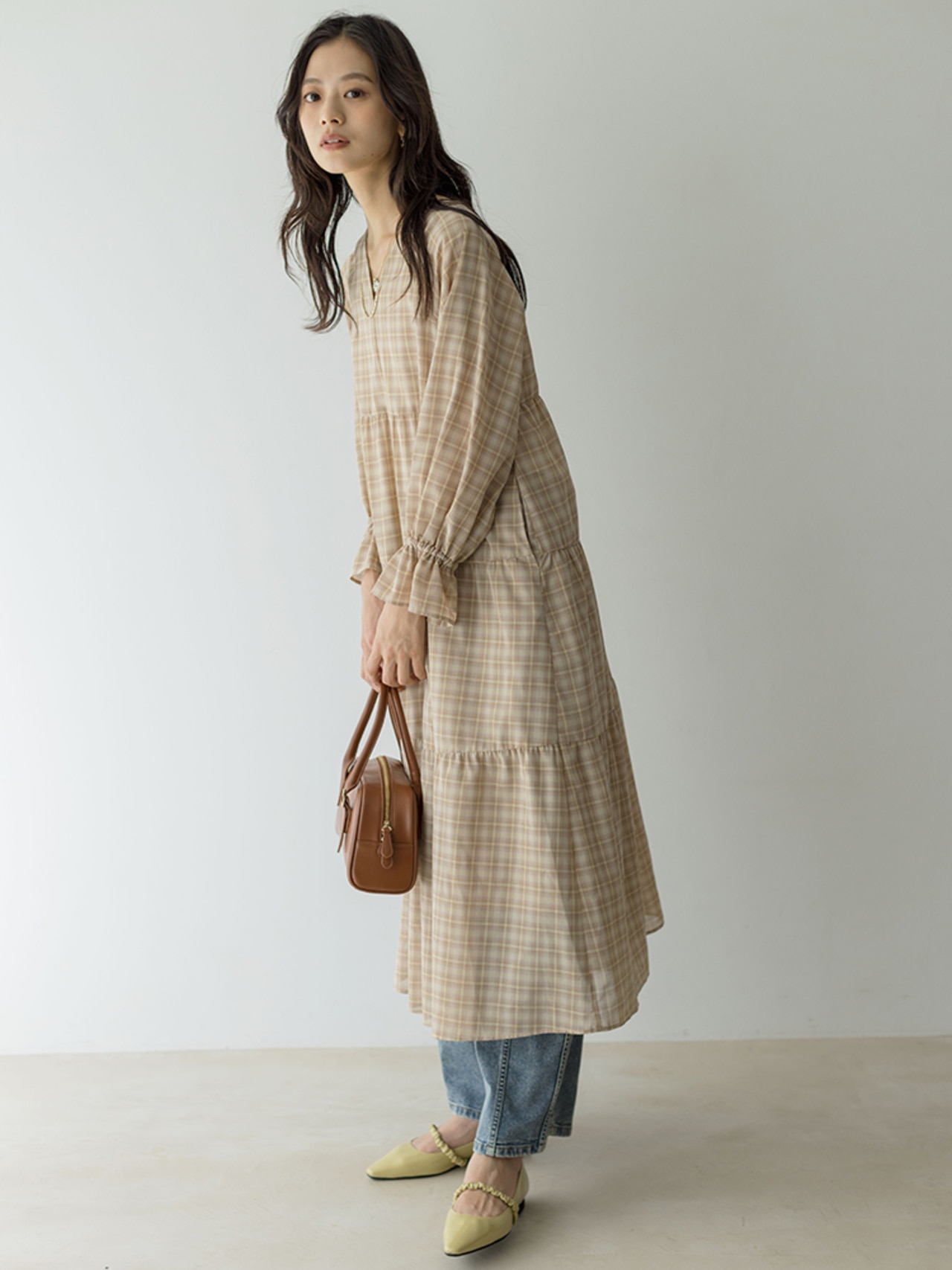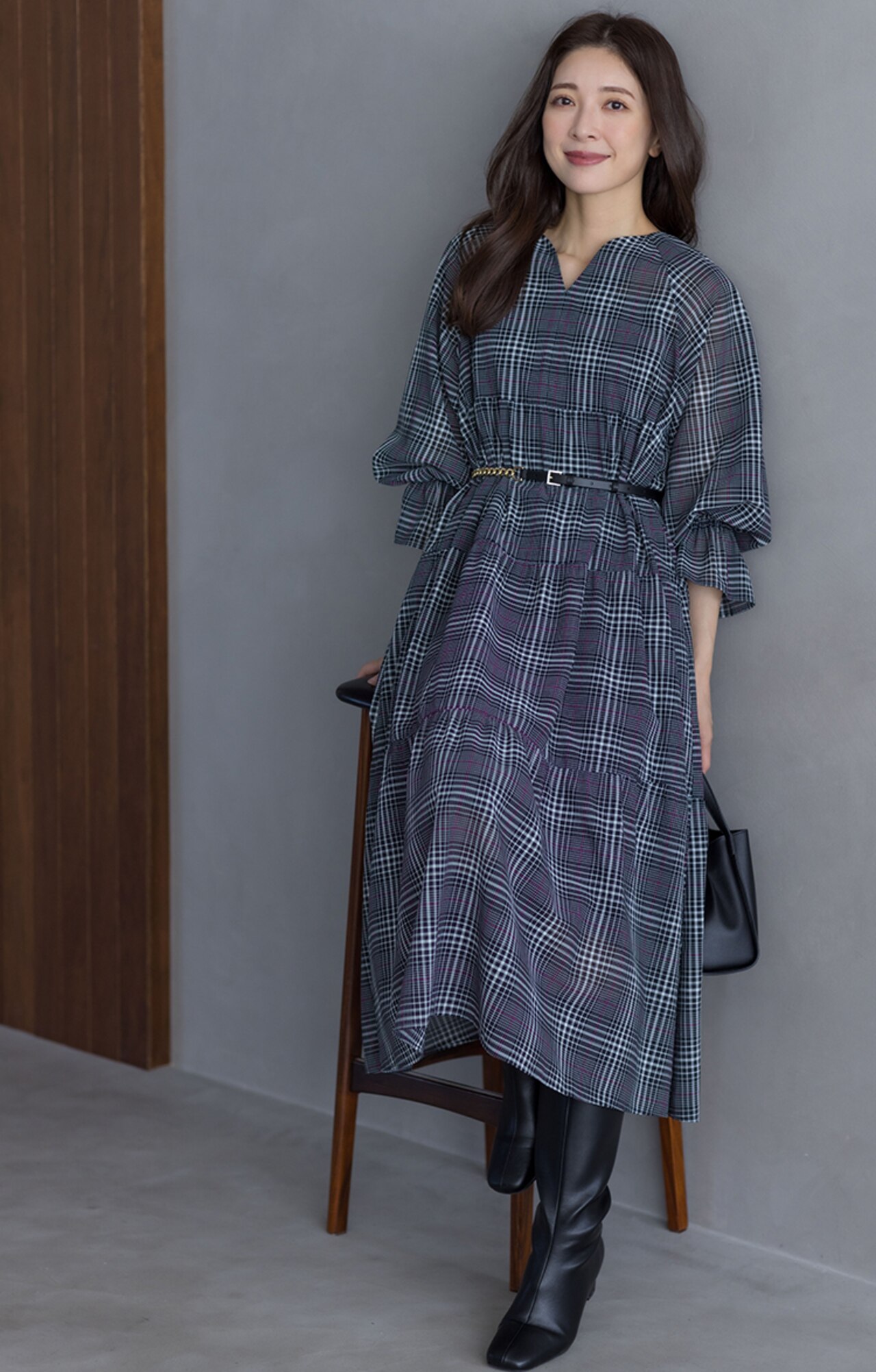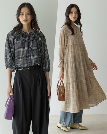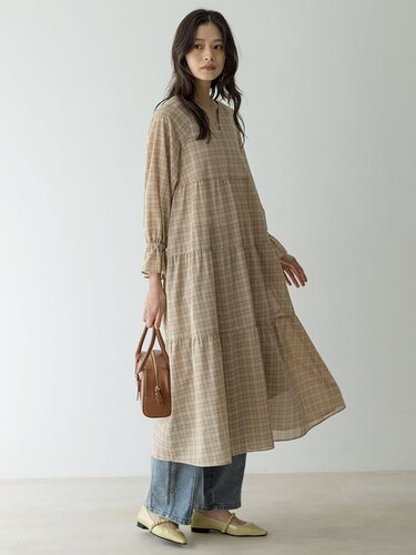 身体から離れたティアードサックワンピースは、まだまだ暑い初秋に重宝間違い無しです。ブラックのチェックは品よく華やかに着られます。