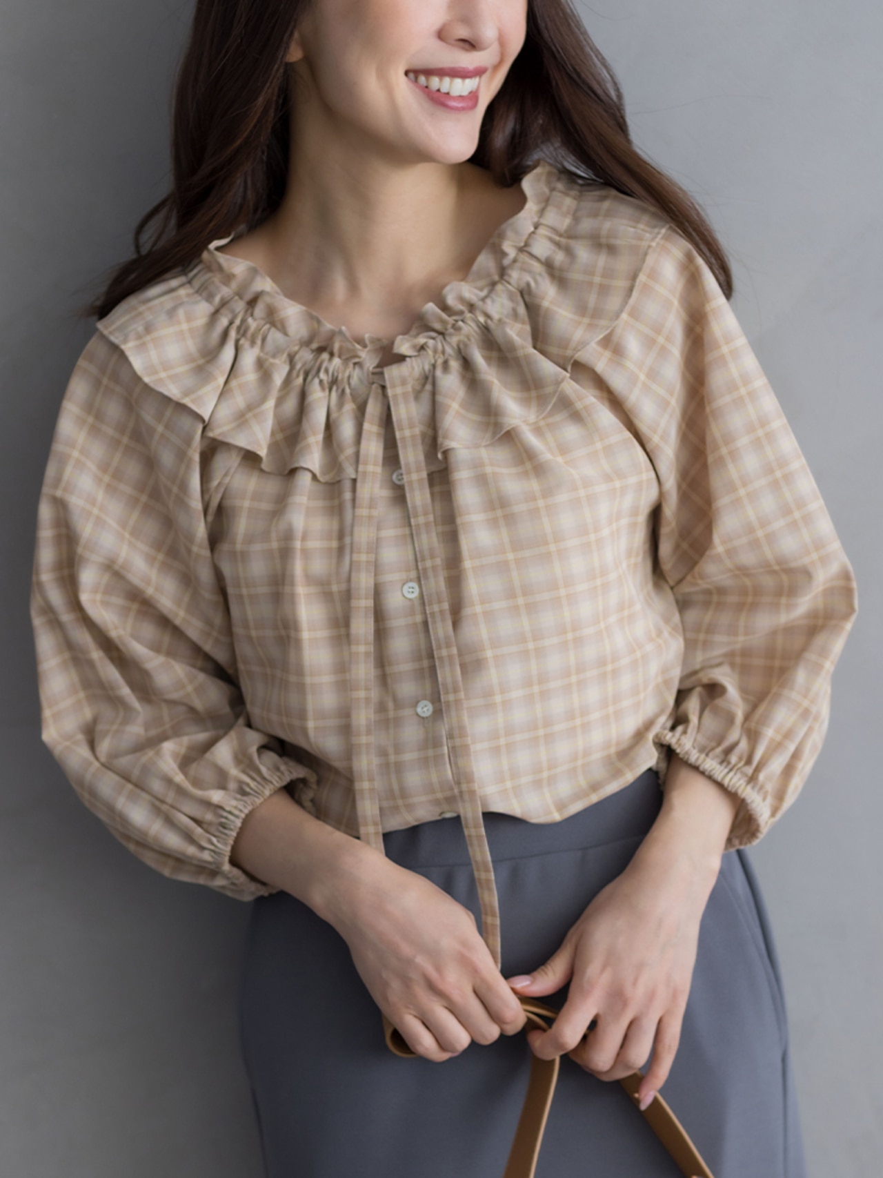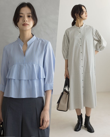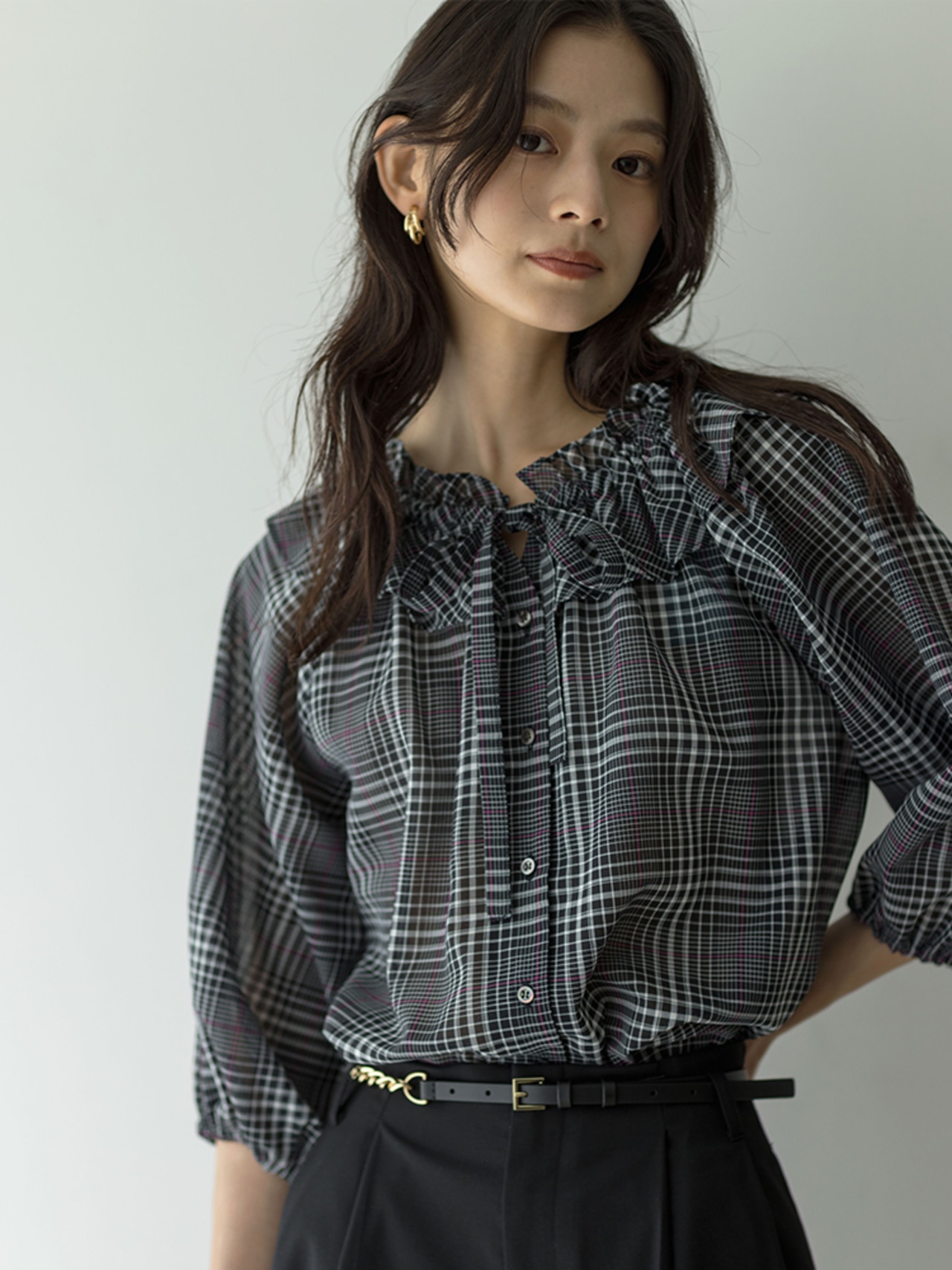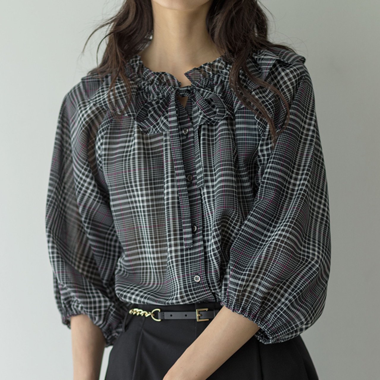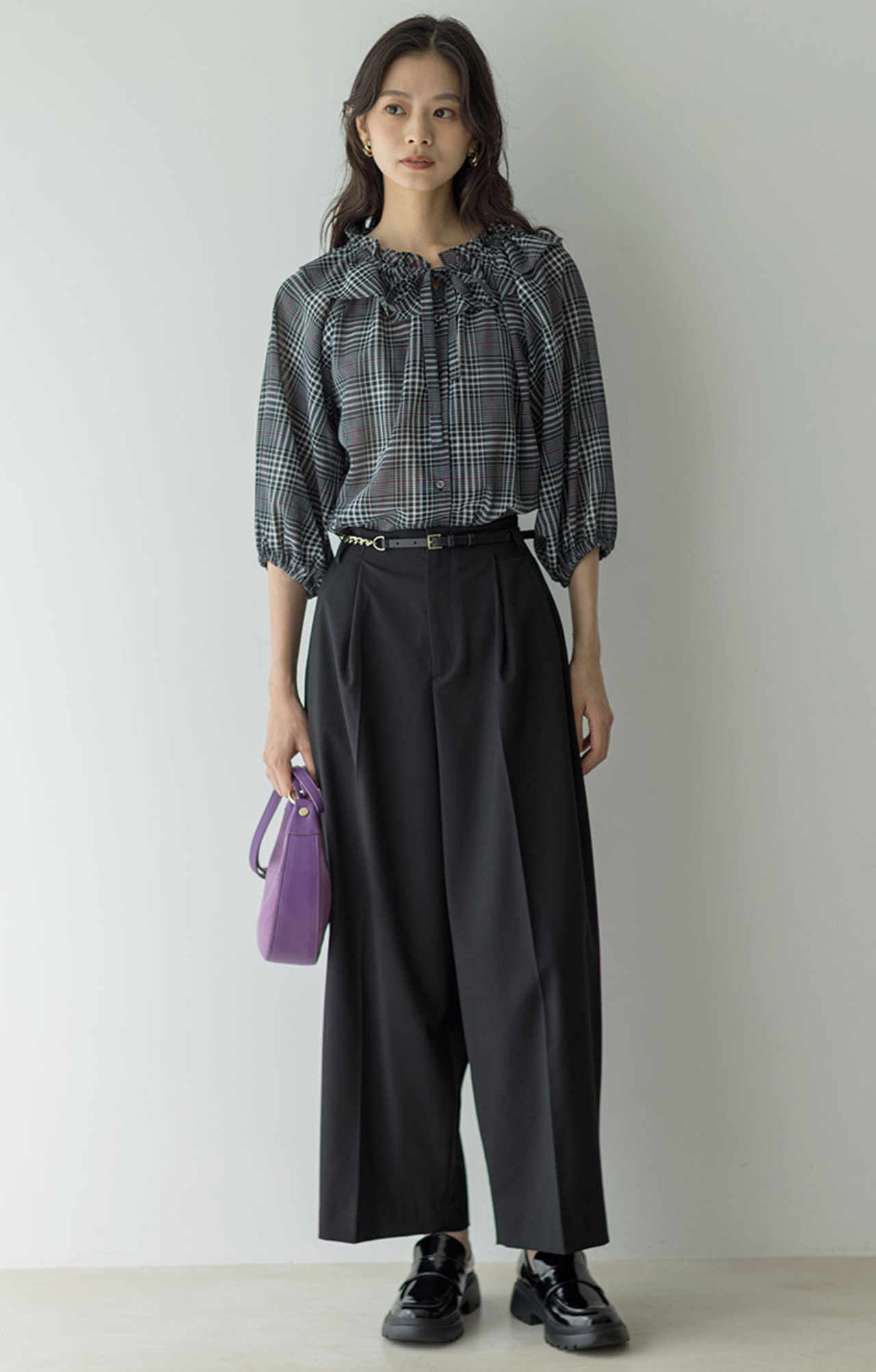 身体から離れたティアードサックワンピースは、まだまだ暑い初秋に重宝間違い無しです。ブラックのチェックは品よく華やかに着られます。