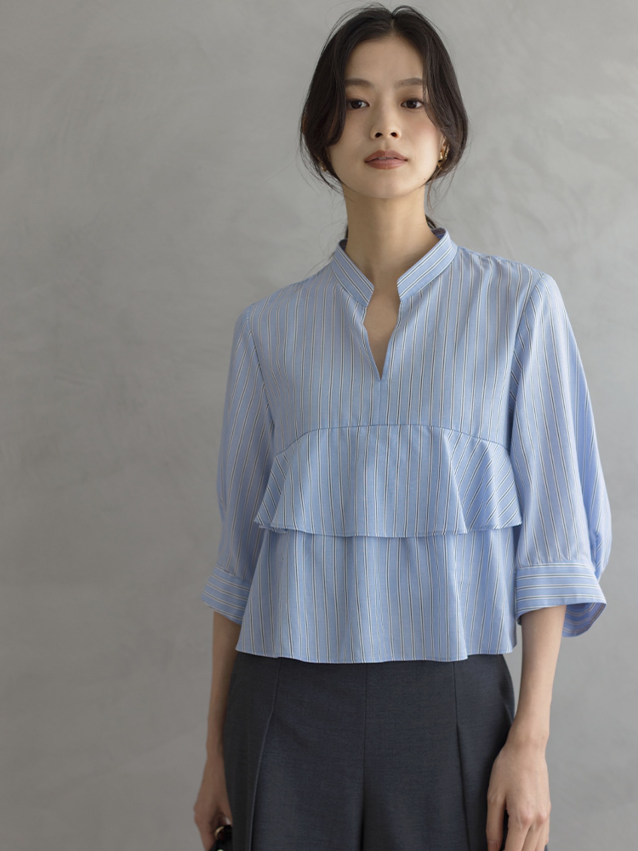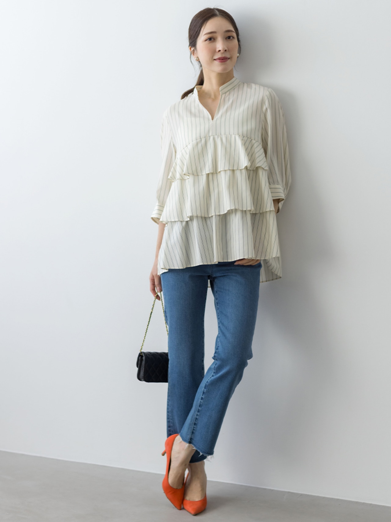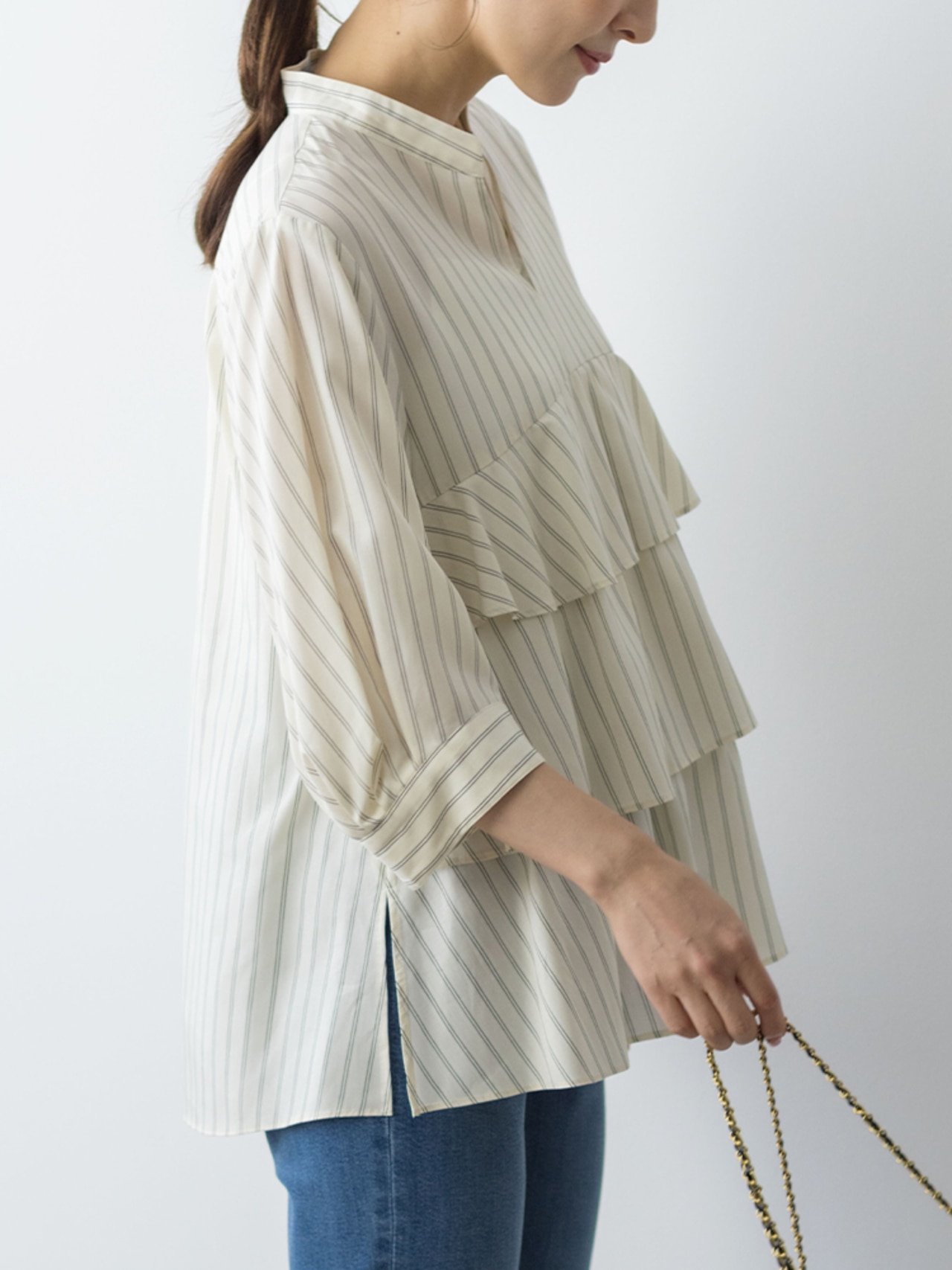 デニムと合わせて大人カジュアルに。襟ぐりのスリットが抜け感を演出してくれます!スリットを後ろにして抜いて着用するのもおすすめ。