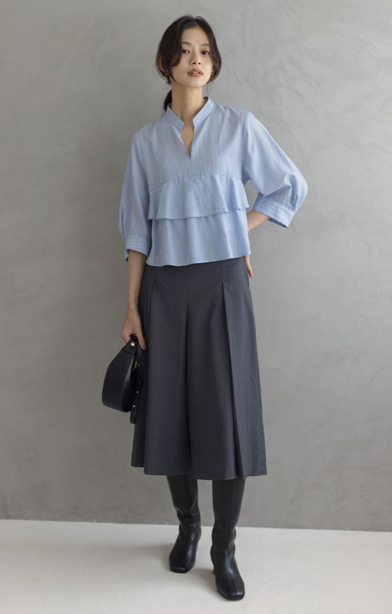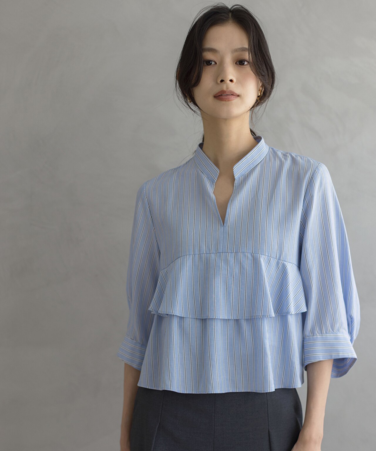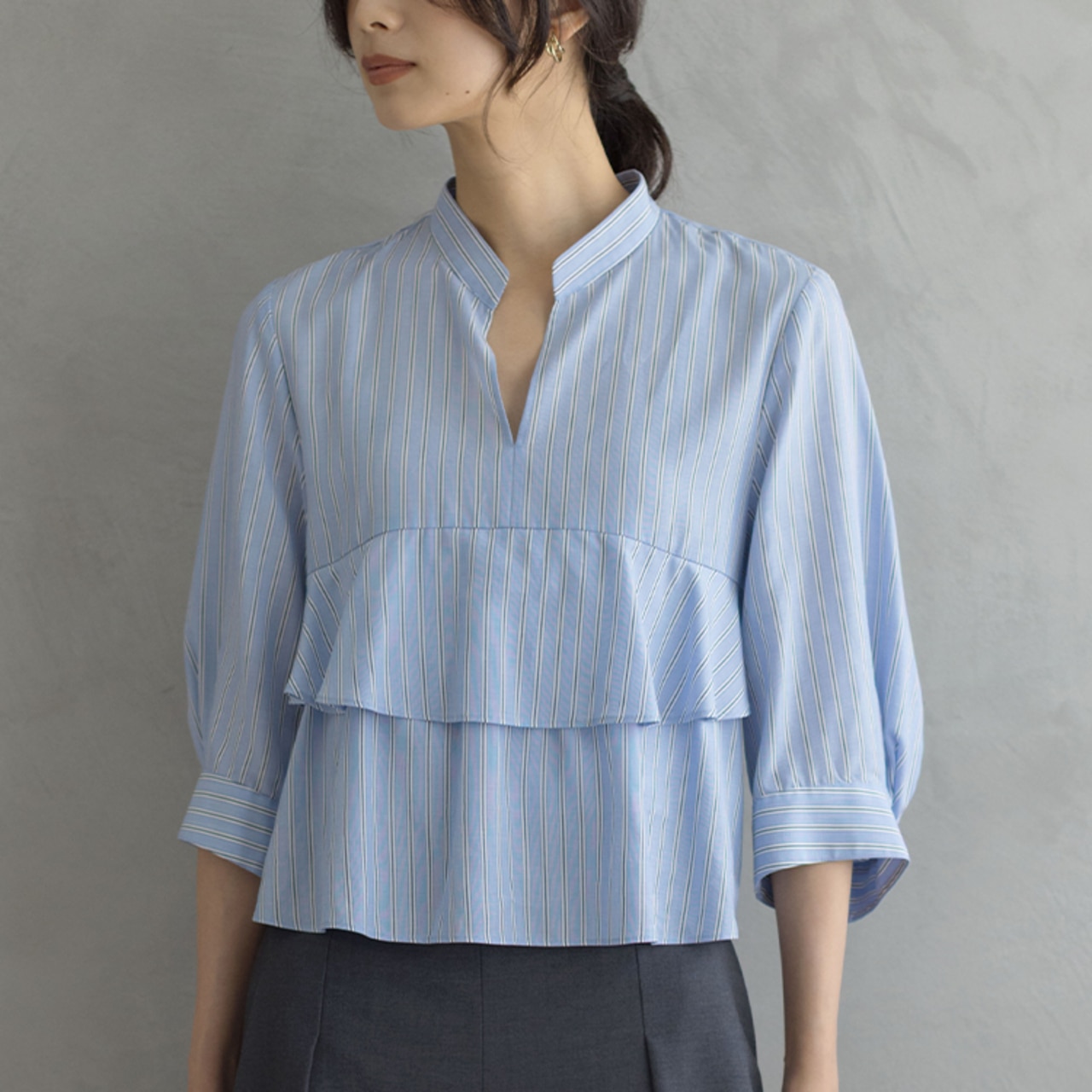 デニムと合わせて大人カジュアルに。襟ぐりのスリットが抜け感を演出してくれます!スリットを後ろにして抜いて着用するのもおすすめ。