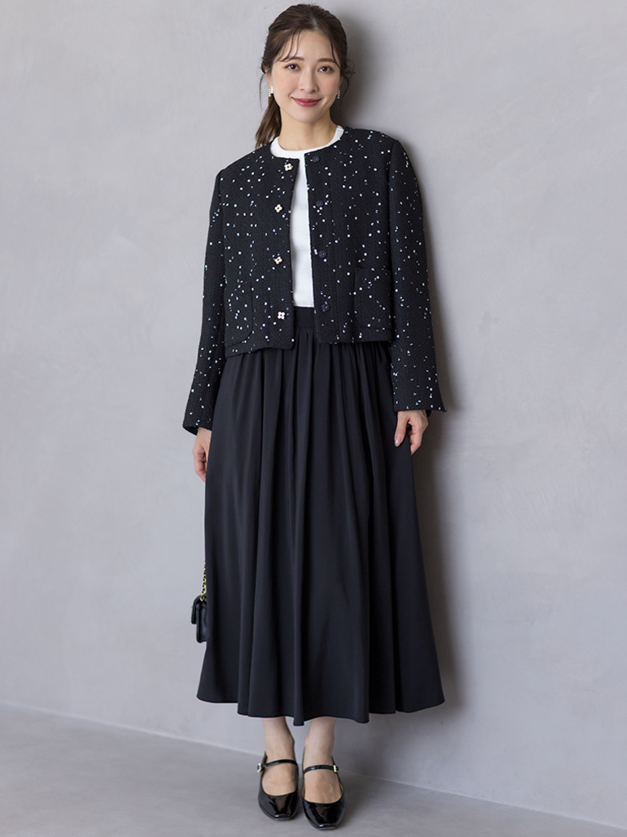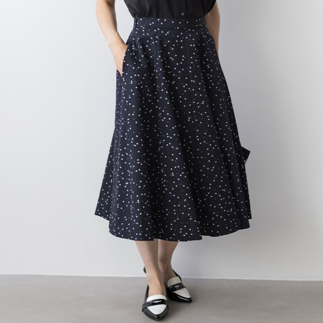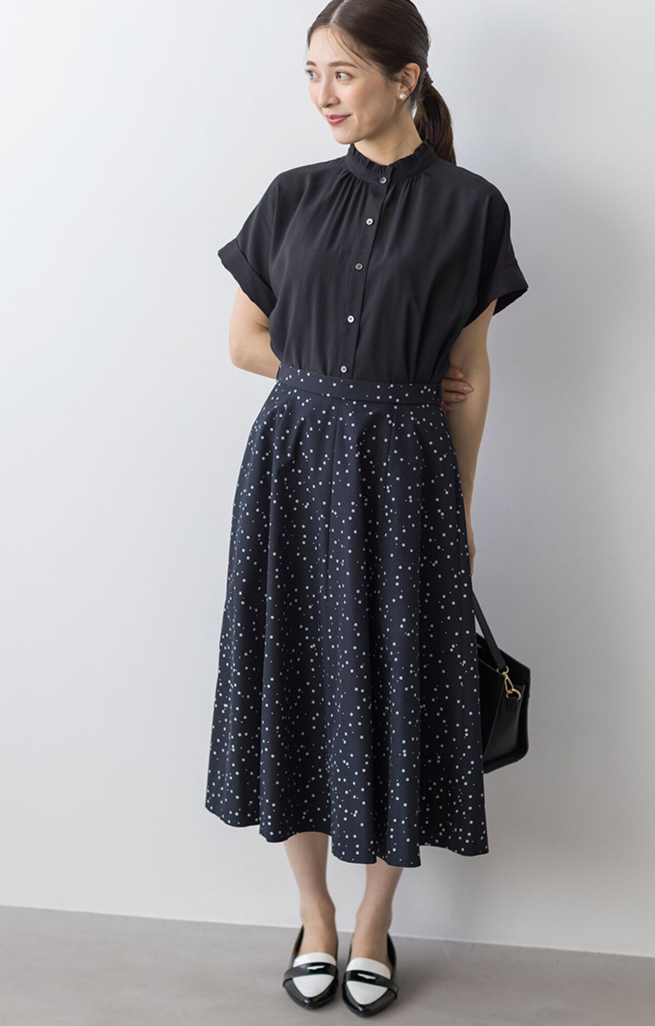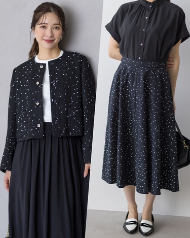 シンプルな夏服から一転、秋は華やかな柄アイテムで存在感をアップ。