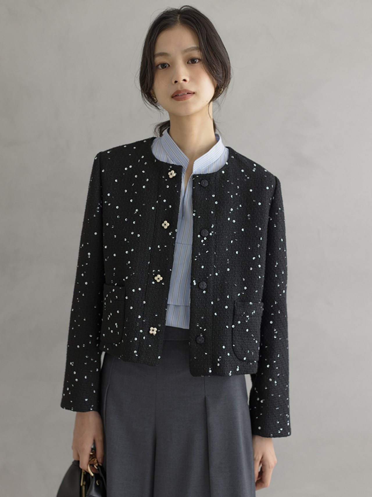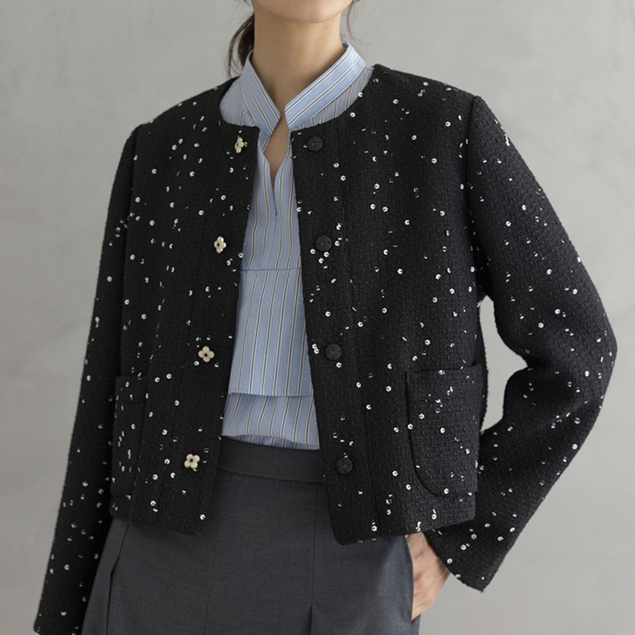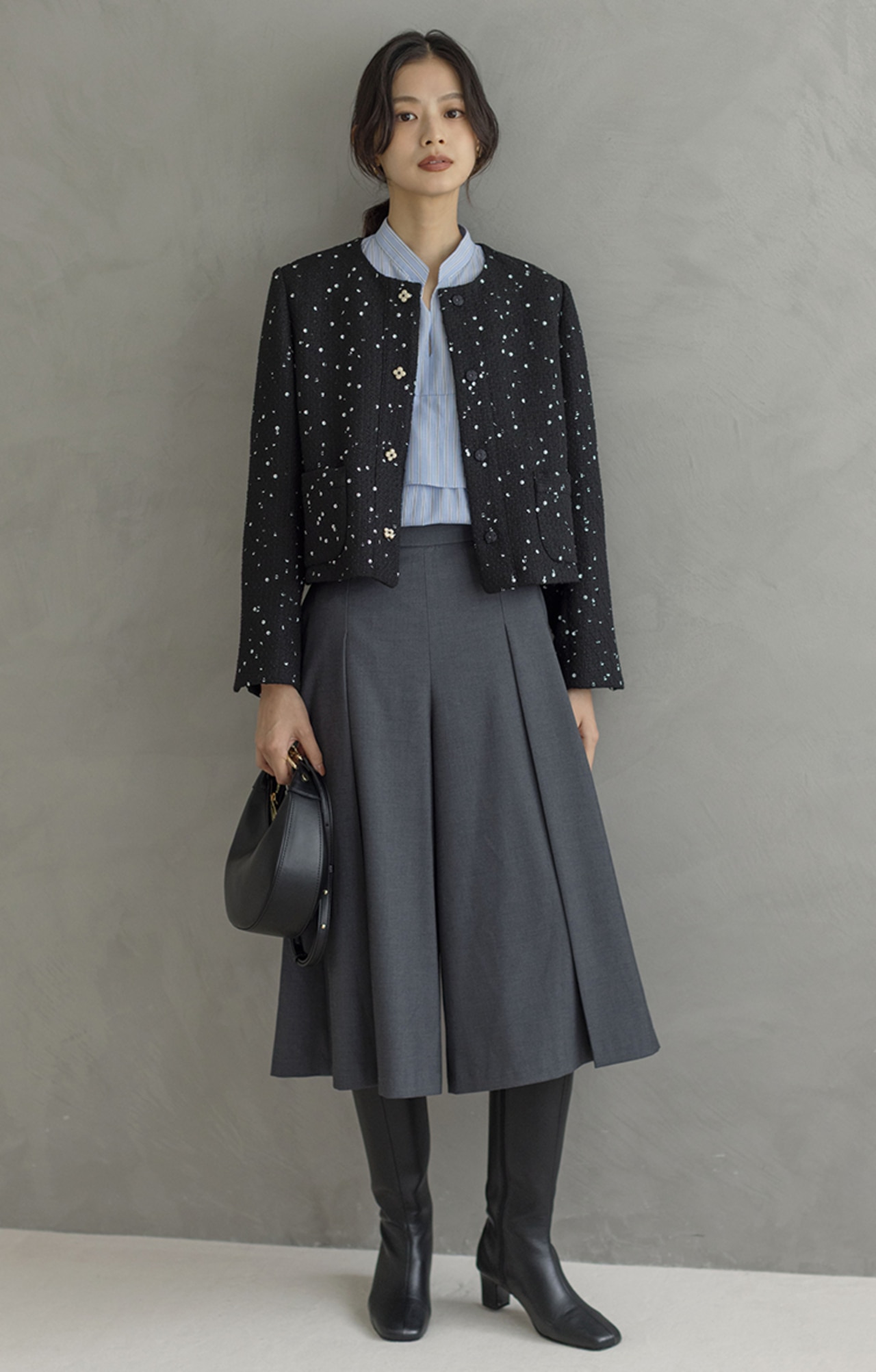 シンプルな夏服から一転、秋は華やかな柄アイテムで存在感をアップ。
