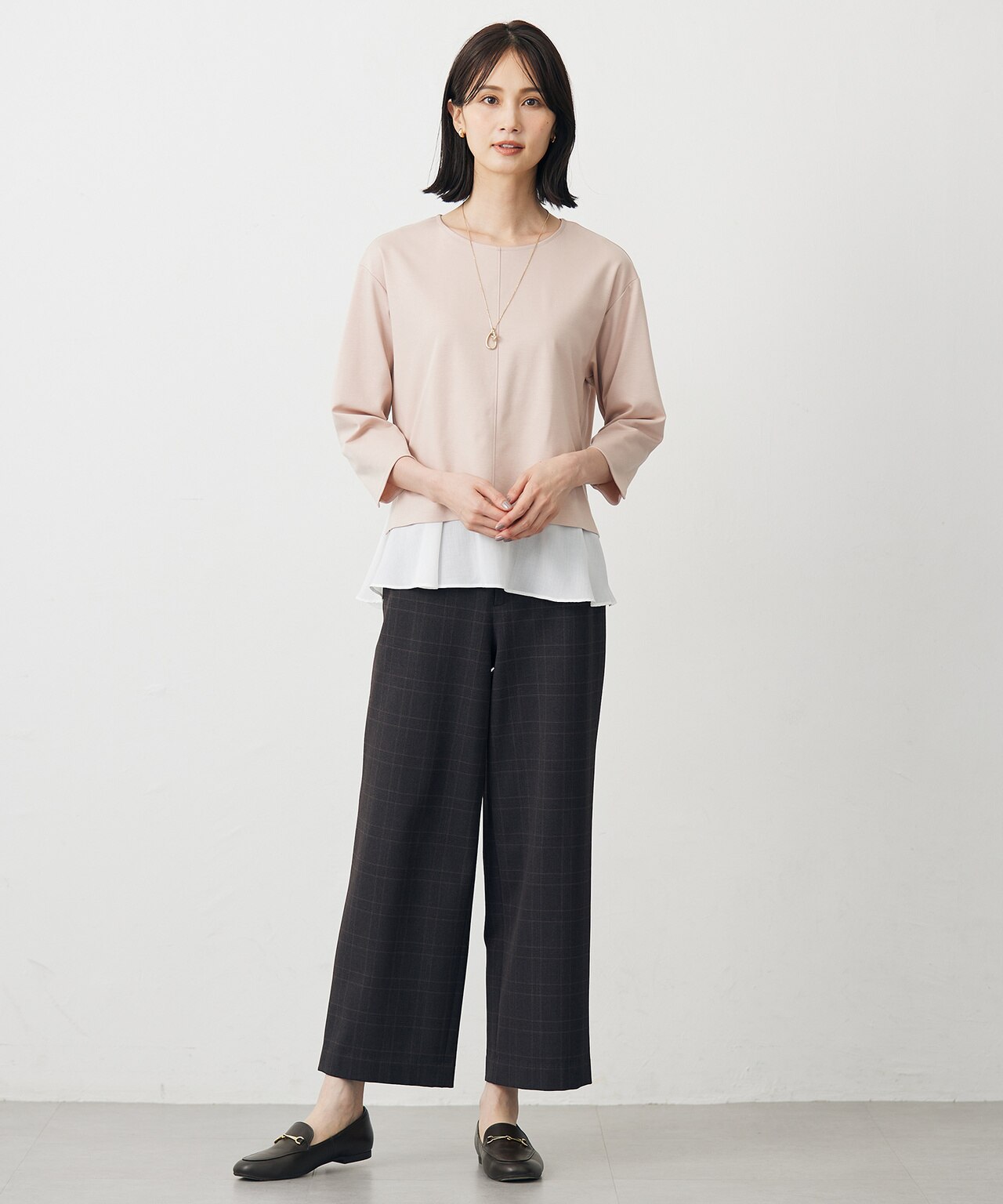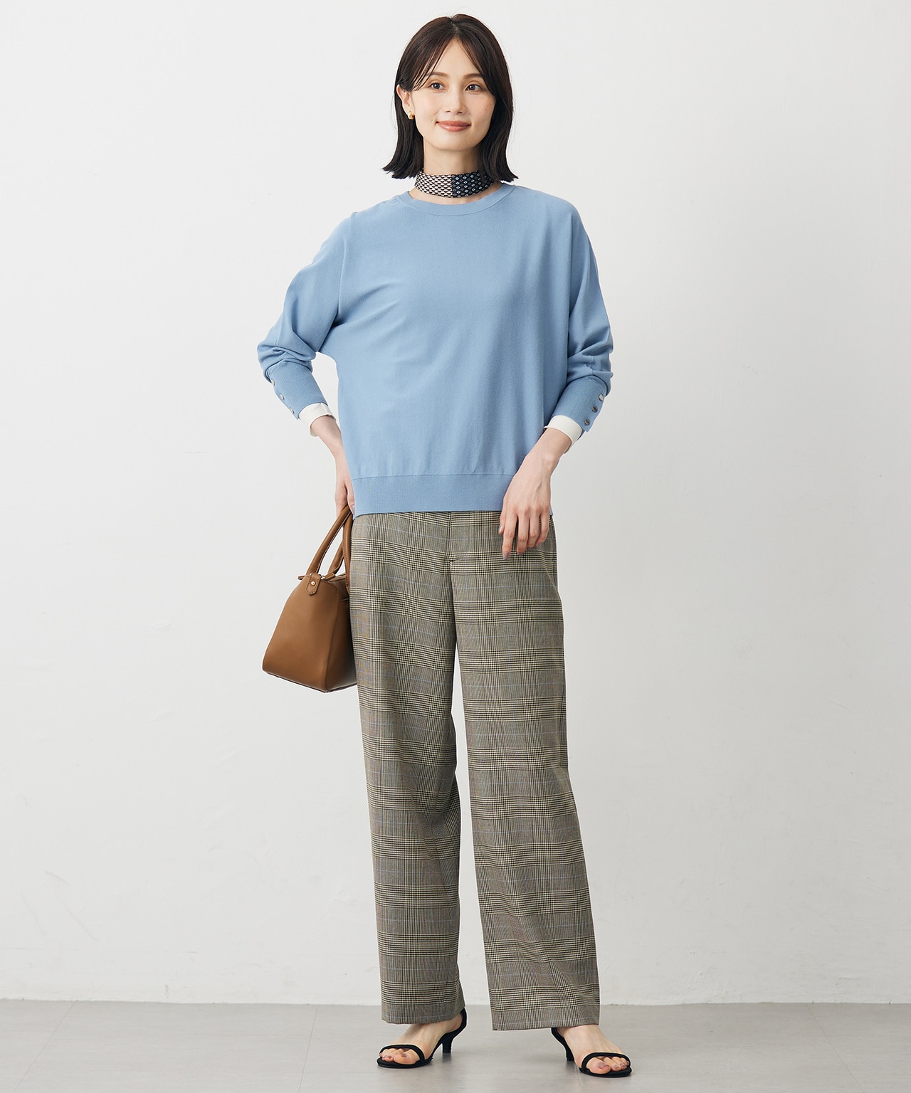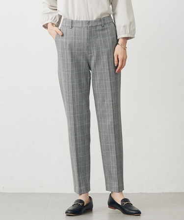 秋らしいチェック柄で洗練されたクロップド丈ワイドパンツ。すっきりとした細身シルエットが魅力。ノータック仕様でお腹まわりをフラットに見せつつ、後ろウエストにはゴムを入れて、締め付け感のないラクな穿き心地に。少し短めのクロップド丈は軽やかで、暑さの残る時期からも穿きやすいアイテム。