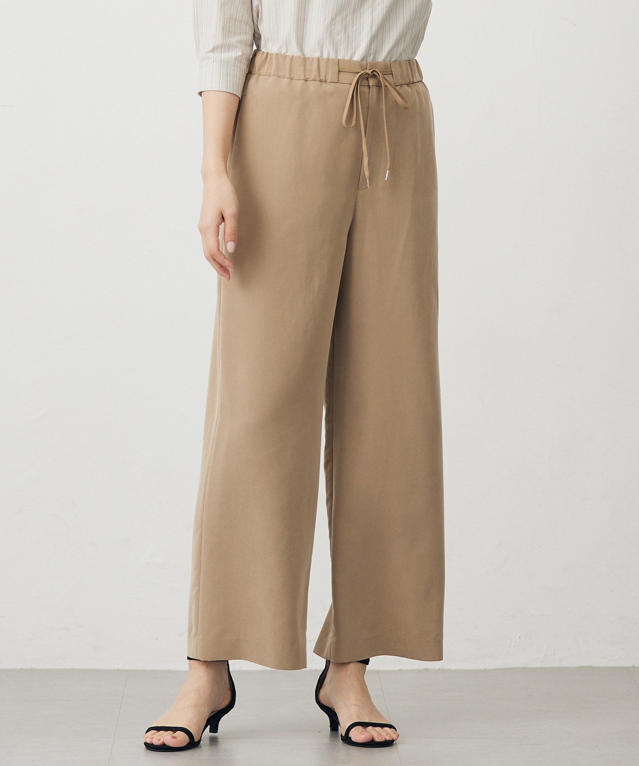リラックス感のある穿き心地と美しいシルエットを両立、秋口にもさらっと穿けるワイドパンツ。肌離れがよく、脚のラインを拾いにくい美しいシルエット。程よい太さにこだわり、リラックス感のある穿き心地と、きちんと見える表情を両立しています。ピーチタッチのやわらかな肌ざわりと歩くたびにしなやかに揺れるドレープ感が魅力です。