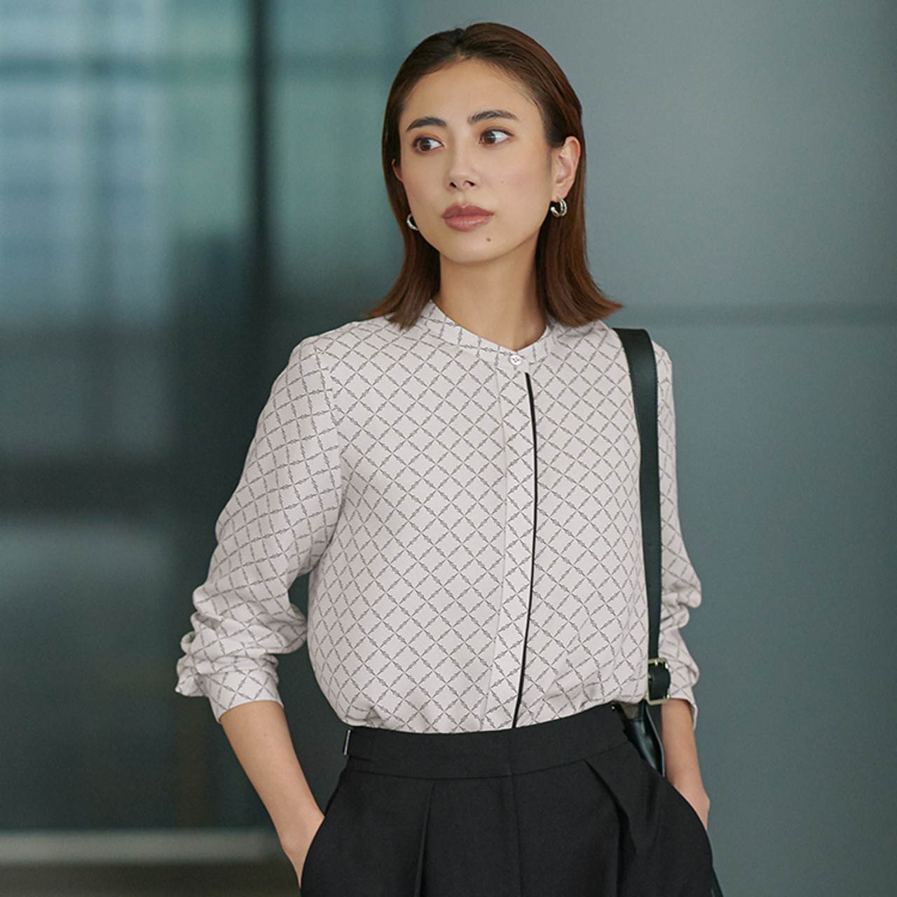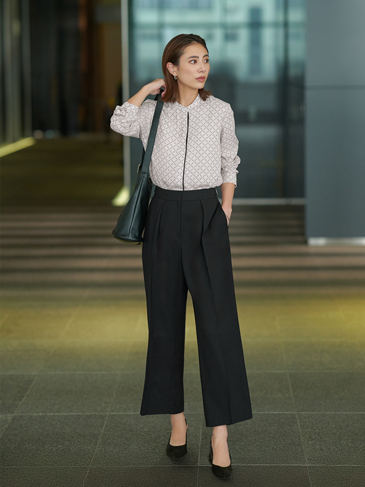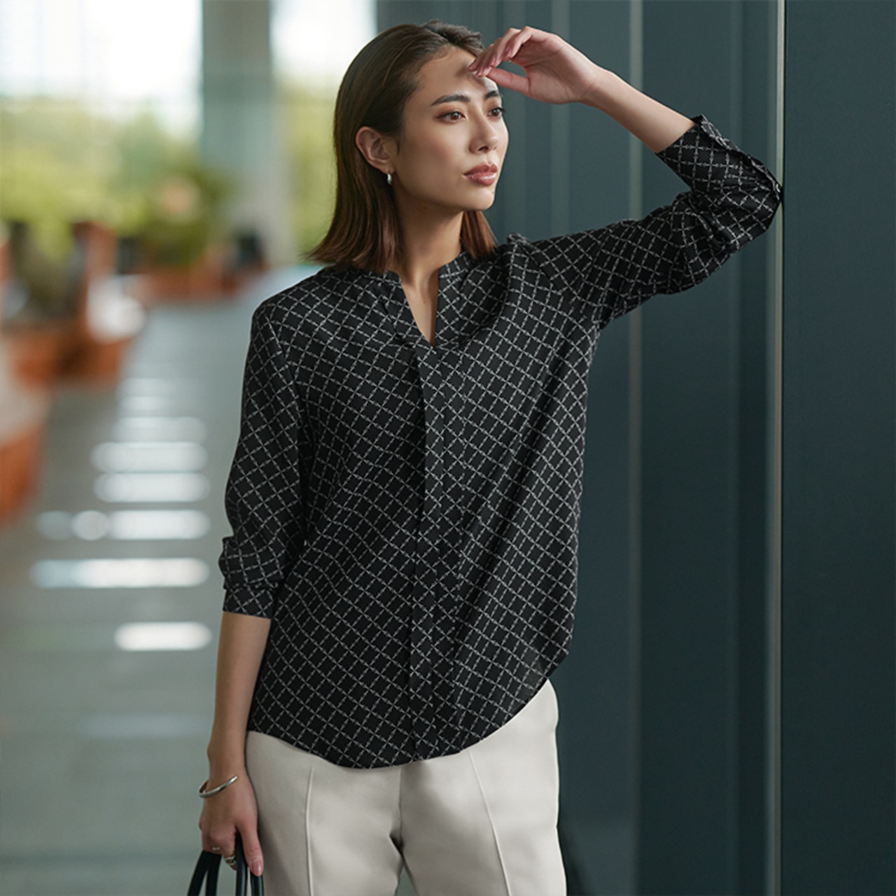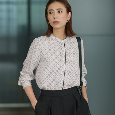 秋の新柄、トープベースのスクエアビット柄。パンツや小物をブラックでまとめた王道通勤コーデは、顔周りに明るさをプラス。