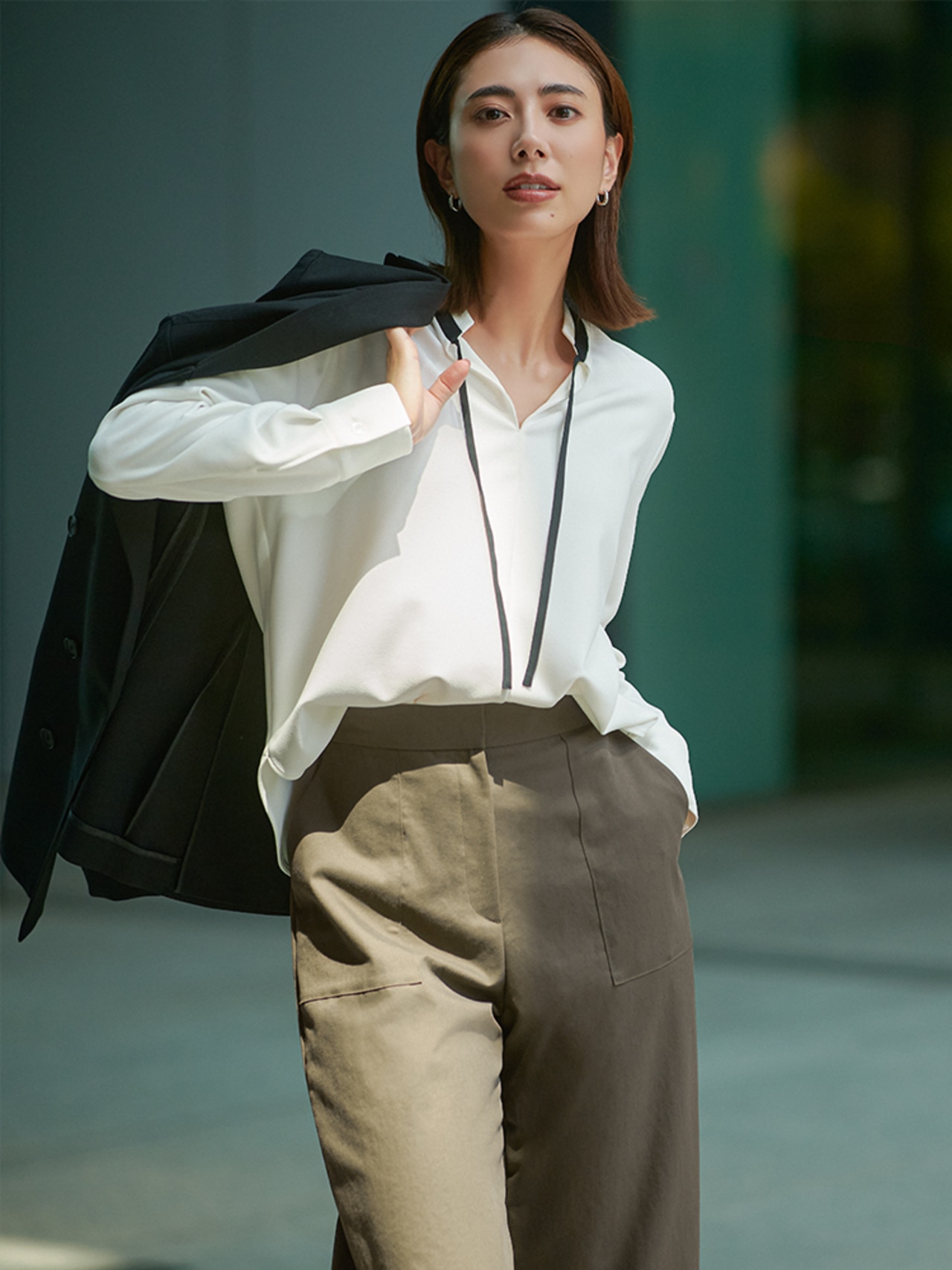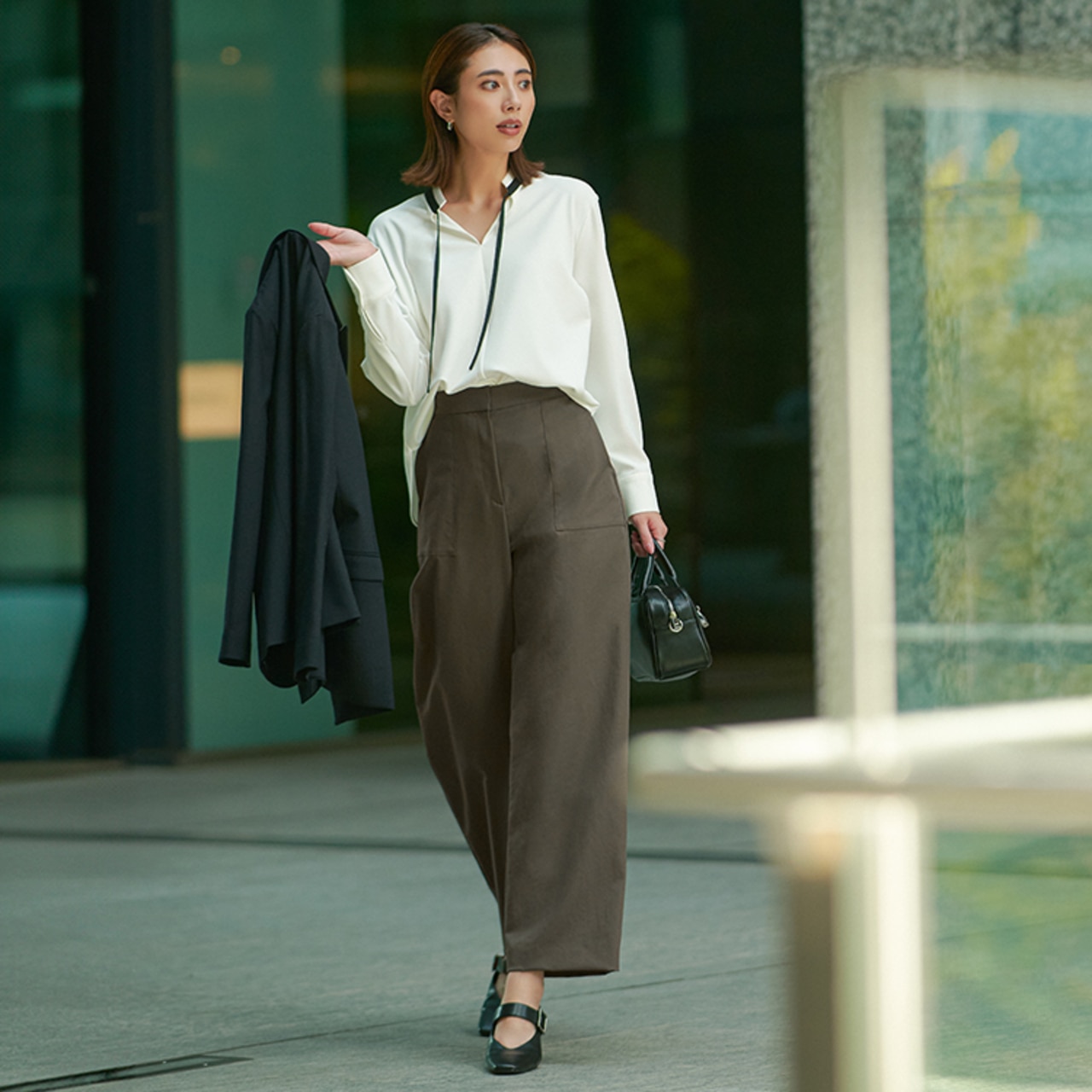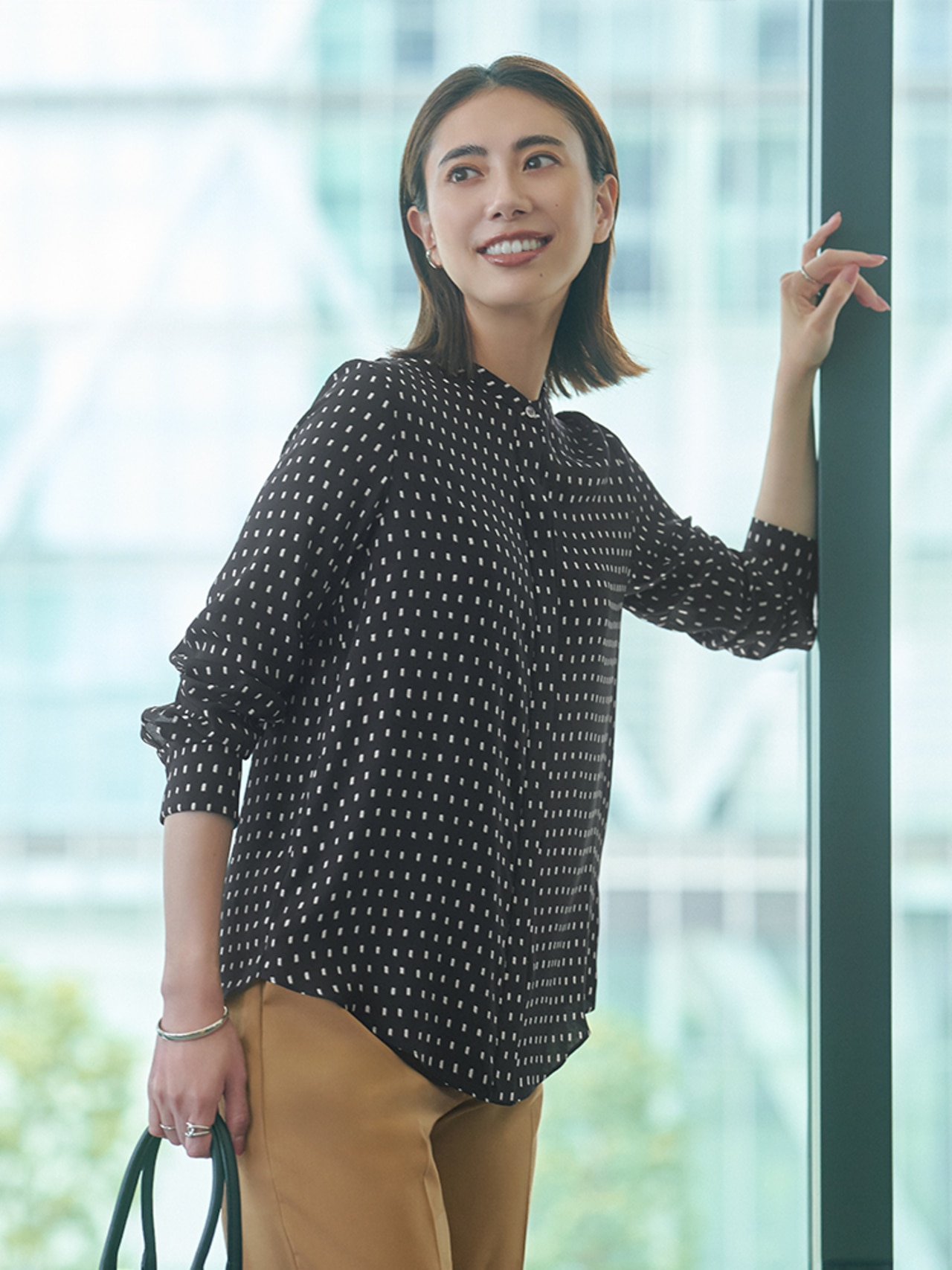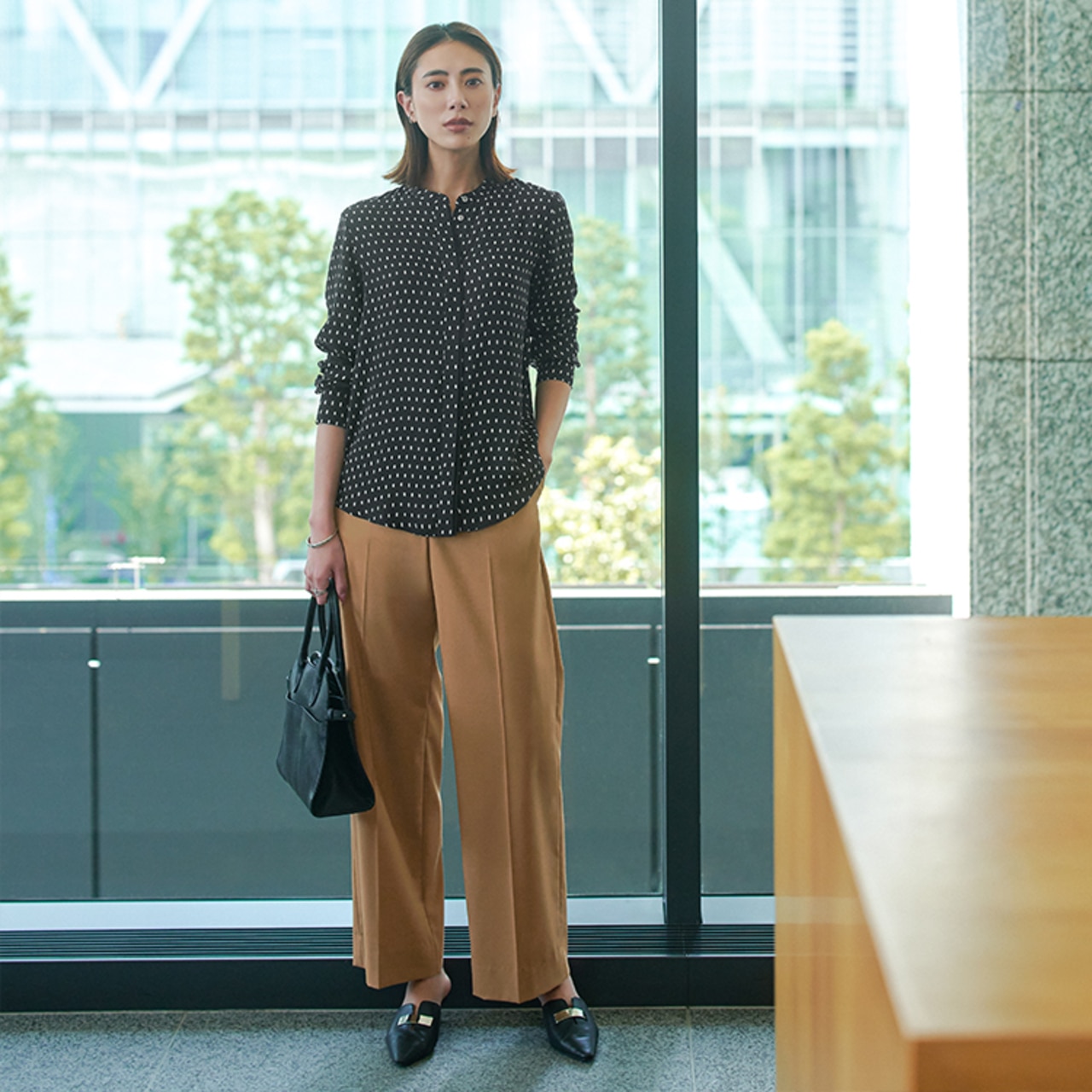 秋の新柄、トープベースのスクエアビット柄。パンツや小物をブラックでまとめた王道通勤コーデは、顔周りに明るさをプラス。