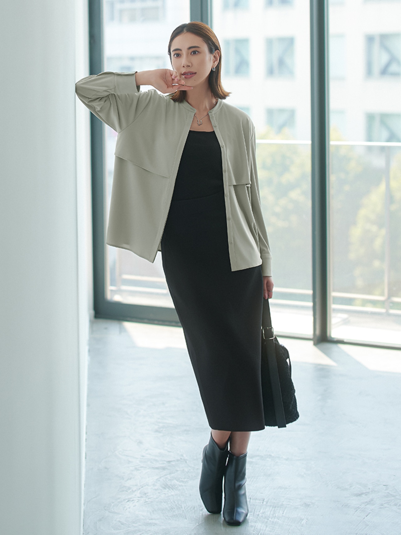 シャープな印象の小さめのウイングカラー、立体的なブザム、長めのカフスなど、ディティールにこだわった1枚。レイヤードもしやすい長め丈で、柄パンツとも好相性。