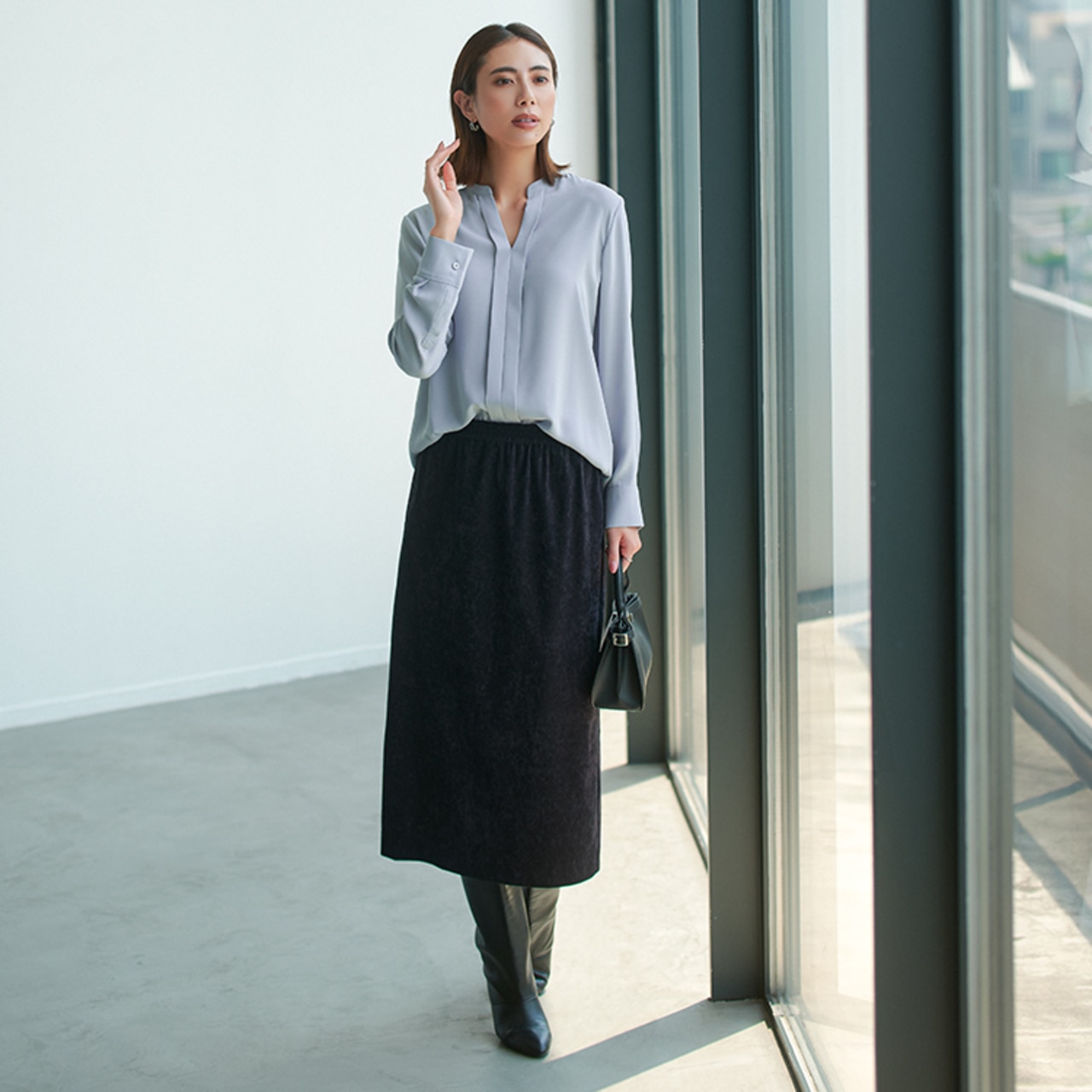 優しいサックスグレーが無地でも華やかな印象に。ナローシルエットのスエードスカートを合わせてこなれ感をアップ。