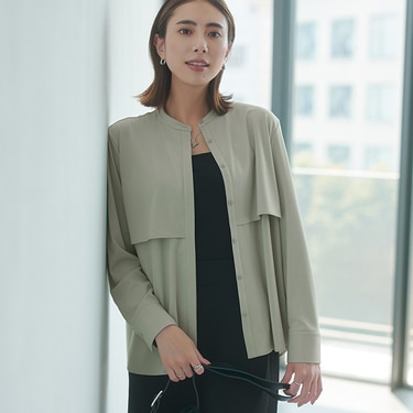 大きめのフライヨークがポイントのバンドカラーカットソー。きちんと感のあるジャージー素材で着心地も良く、前を開けて羽織りにもなるデザインがポイント。