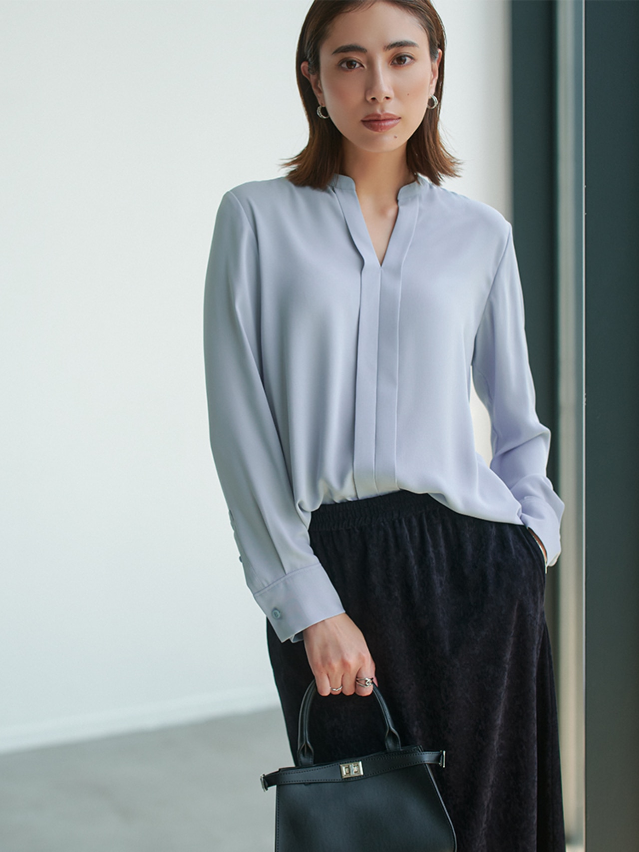 女性らしさを引き立てるBackSatinAmunzen長袖キーネックブラウス。品の良さが際立つV開きの襟元がクリーンな印象の中にも抜け感をプラス。