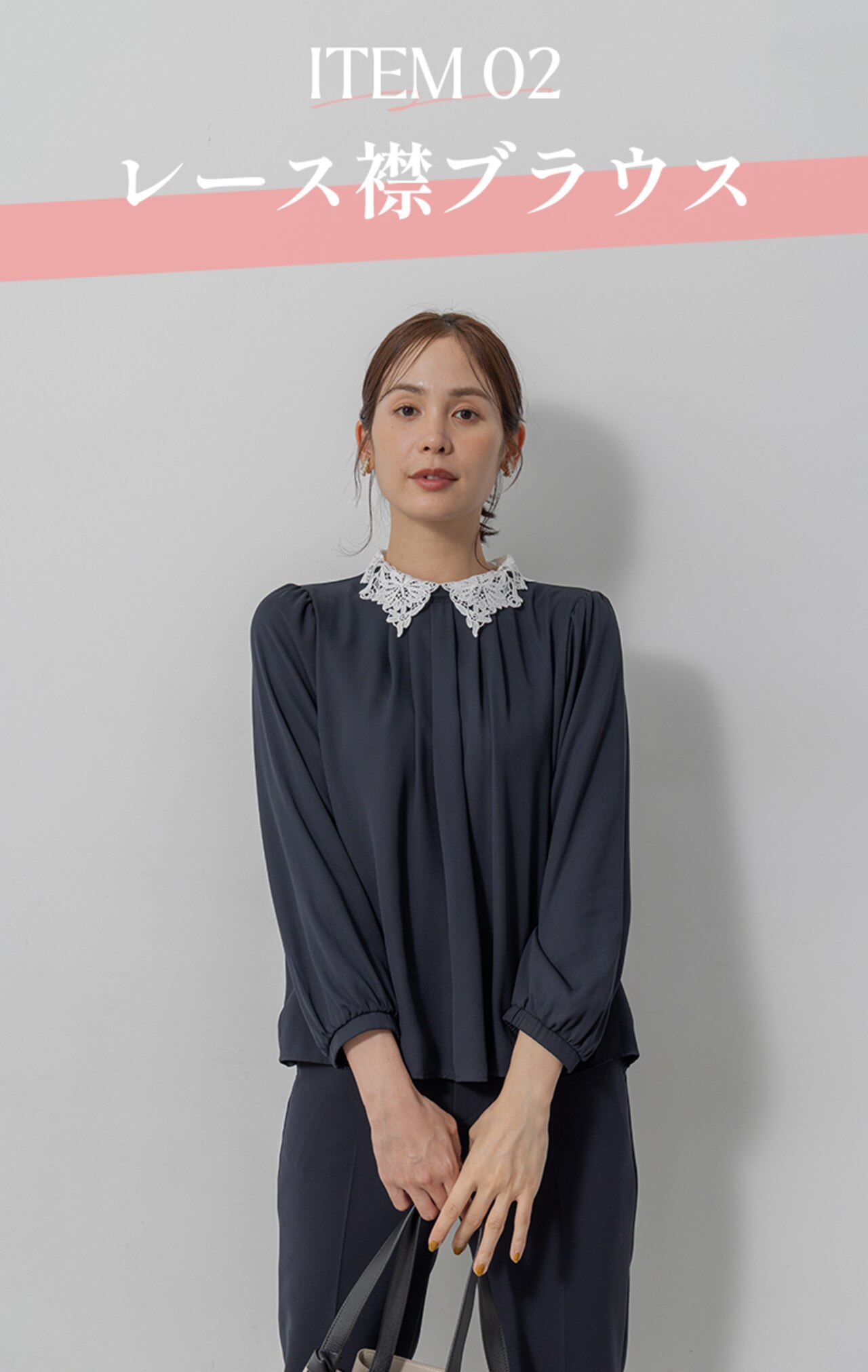 華やかなレース襟が取り外し可能な9分袖ブラウス。タックで身体のラインを拾わないふんわりシルエットはさらりと着るだけでバランスよく!