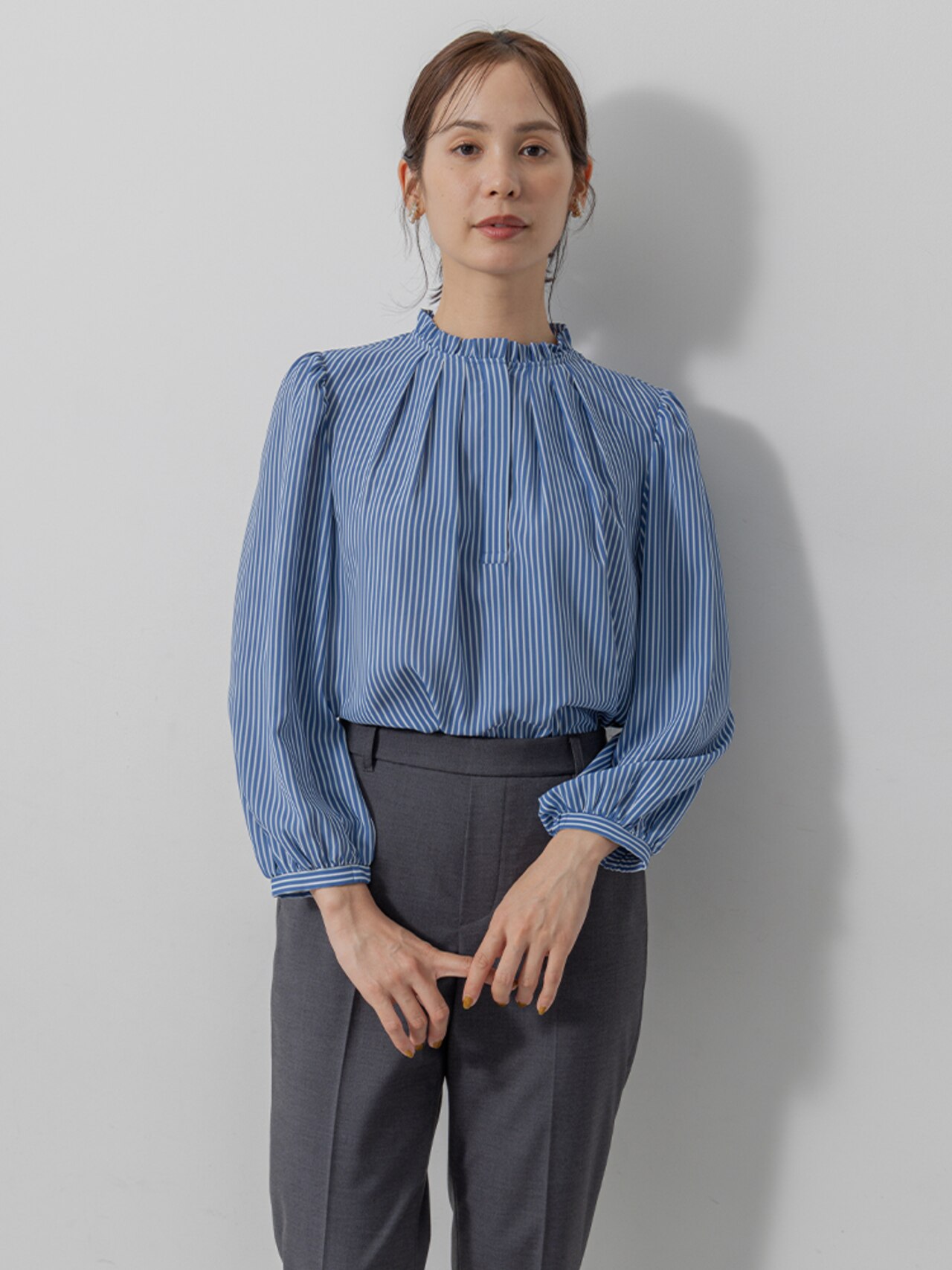 首元の小さなフリル襟と胸元のタックが華やかなブラウス。程よい透け感にこだわった、柔らかで落ち感のある素材です!